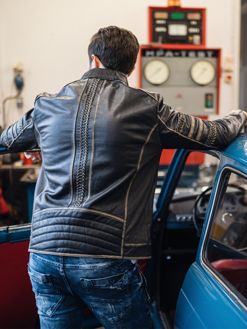 Solid og slitesterk skinnjakke i sort med karakteristiske detaljer i beige. Det håndsydde flettemønsteret på ermene og langs ryggraden gir et retro-lignende stykke. Jakken har to brystlommer og to magelommer - alle med glidelås. En innerlomme. Denne jakken er en del av vår egen eksklusive kolleksjon og du finner den kun hos RockDenim!