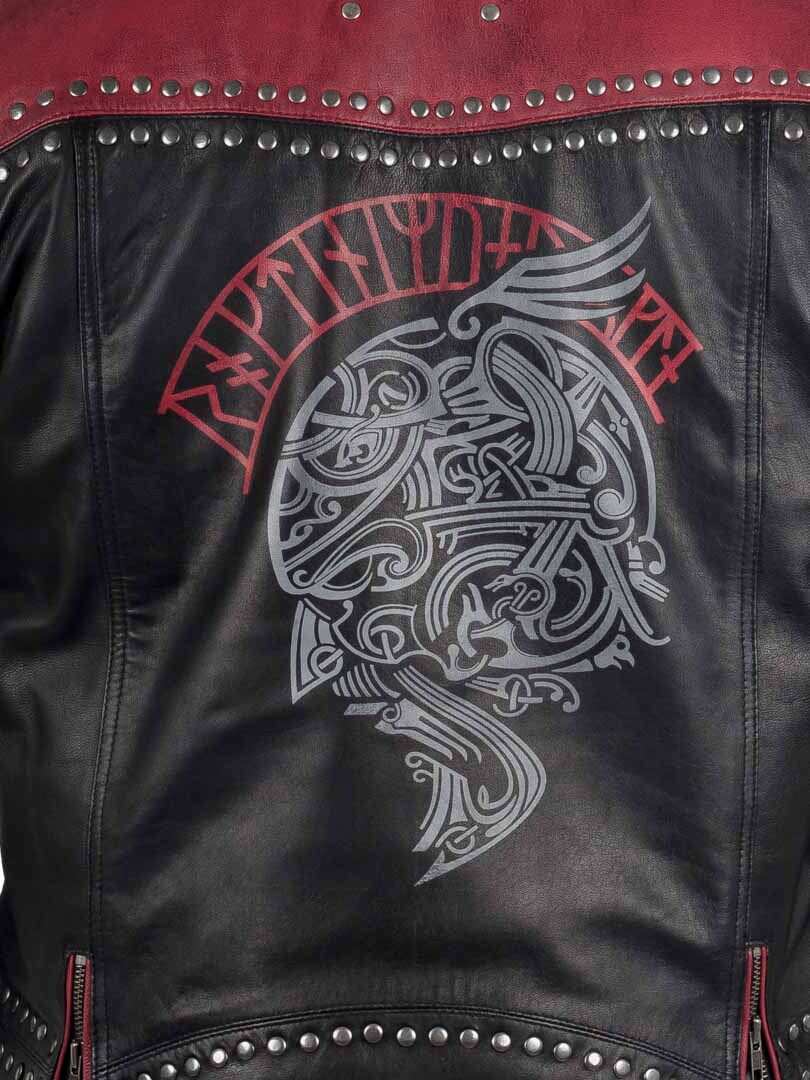 En vattert jakke i ekte, mykt skinn med kontrasterende røde paneler og dekorative nagler som gir et røft og særpreget uttrykk. På ryggen sitter et stort vikinginspirert trykk som forsterker den unike looken. Jakken har flere praktiske lommer, justerbare mansjetter og linning. En jakke for deg som vil ha en rocka stil – med premiumfølelse!