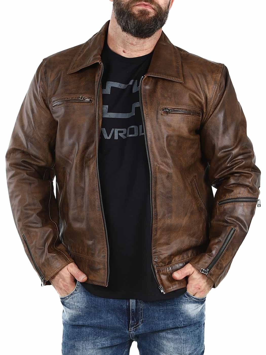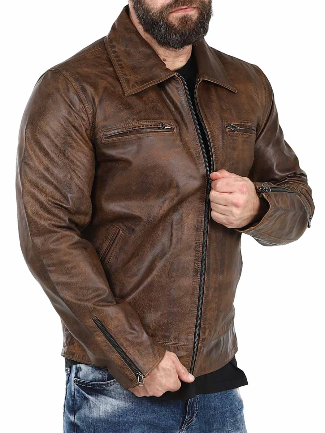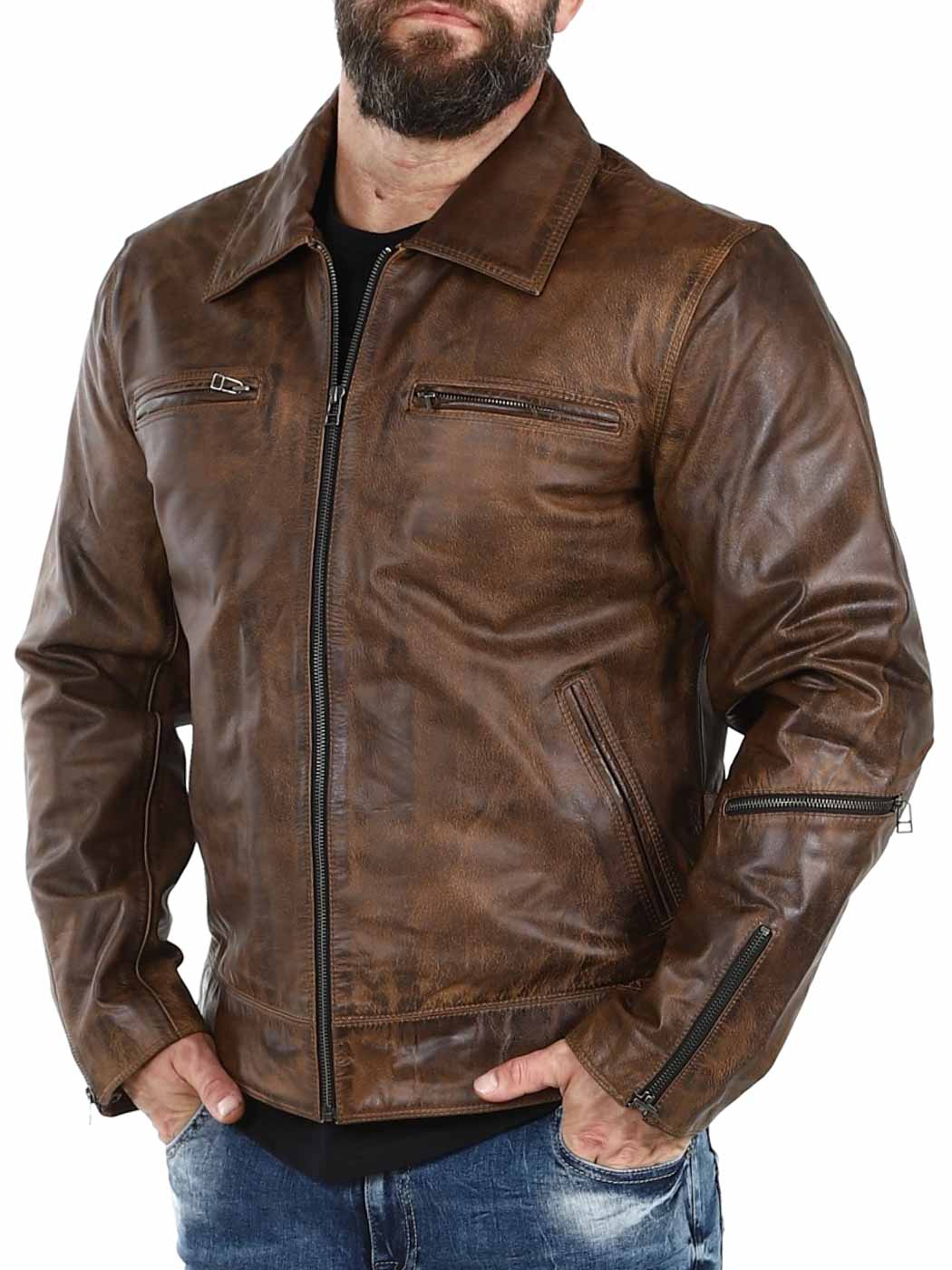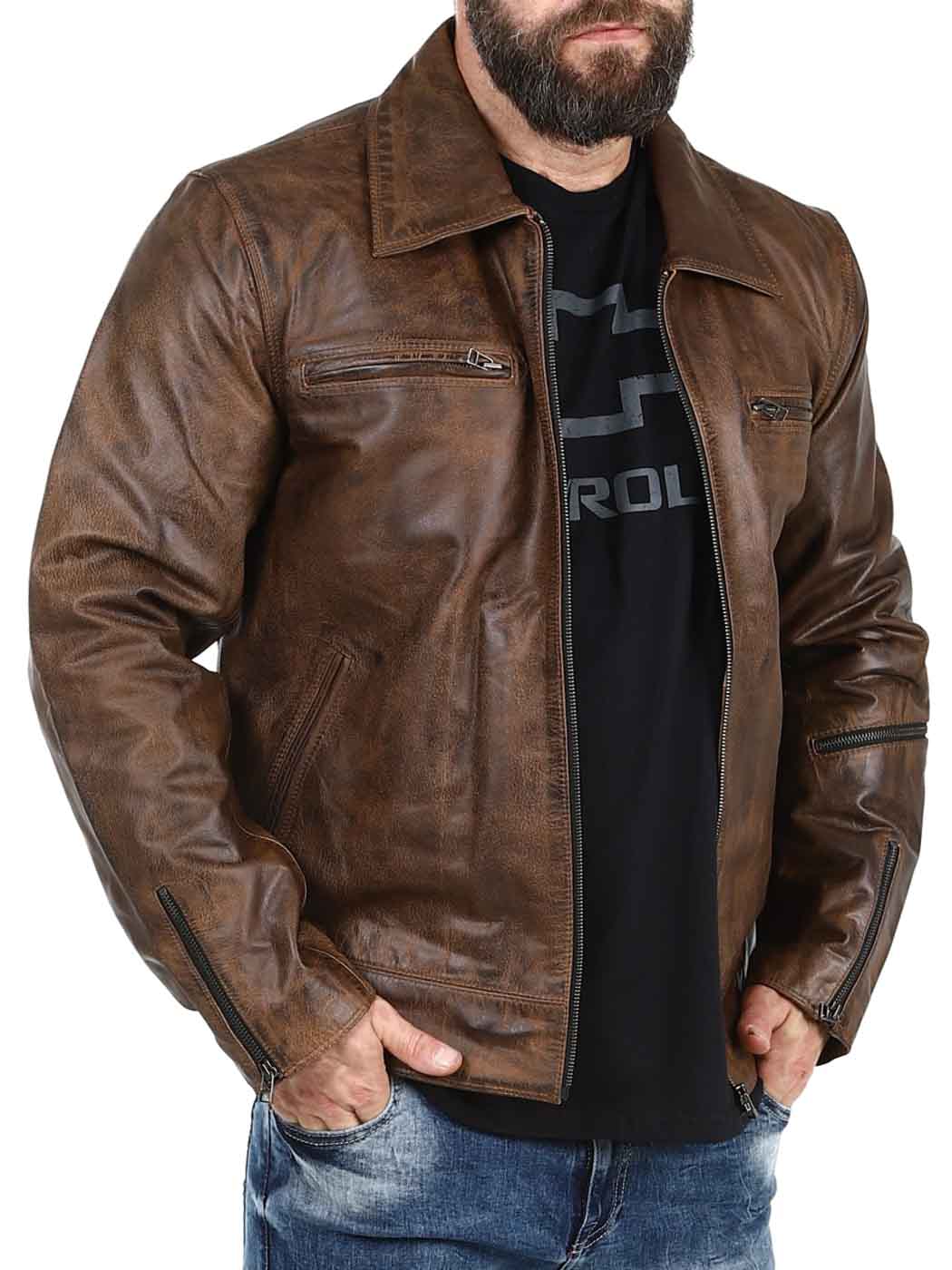 Sterk og tung jakke i ekte skinn. Designet med krage og justerbar midje og mansjetter. Fire frontlommer, en armlomme og to innerlommer. Perfekt for deg som ønsker en tidløs jakke i god kvalitet!