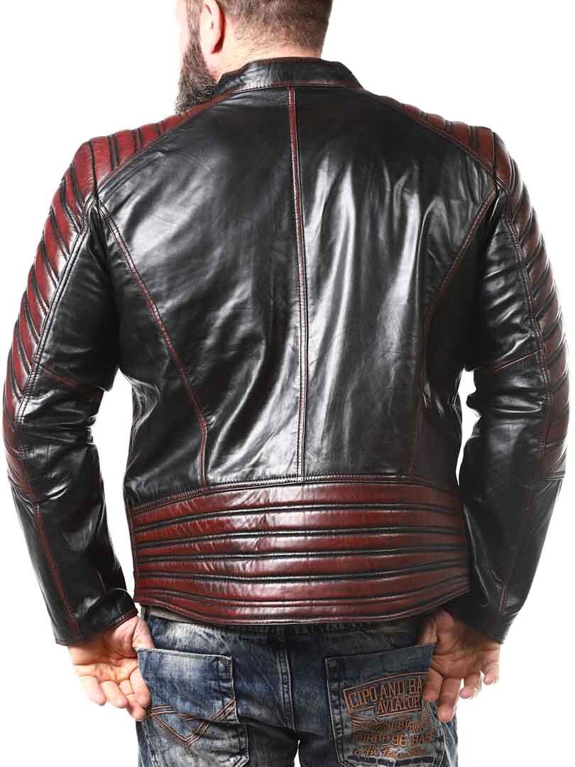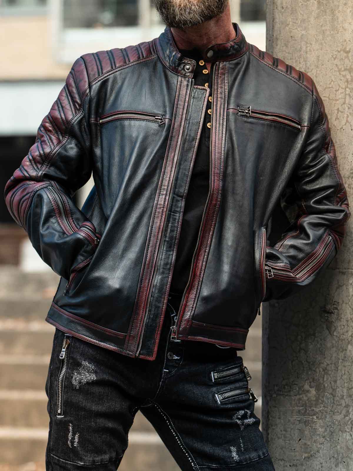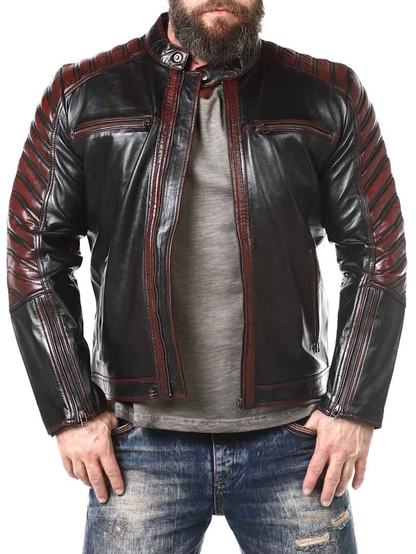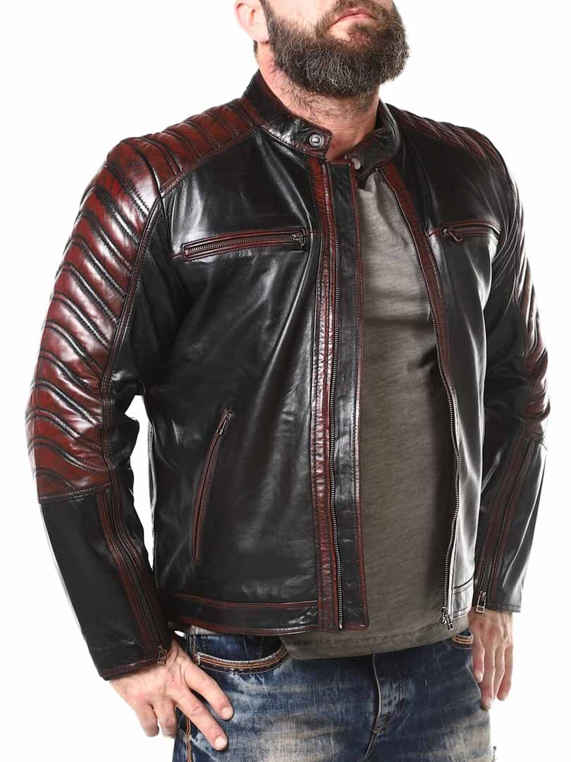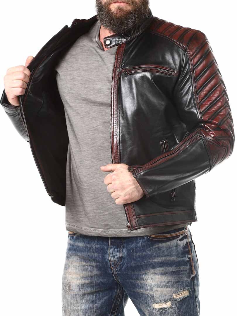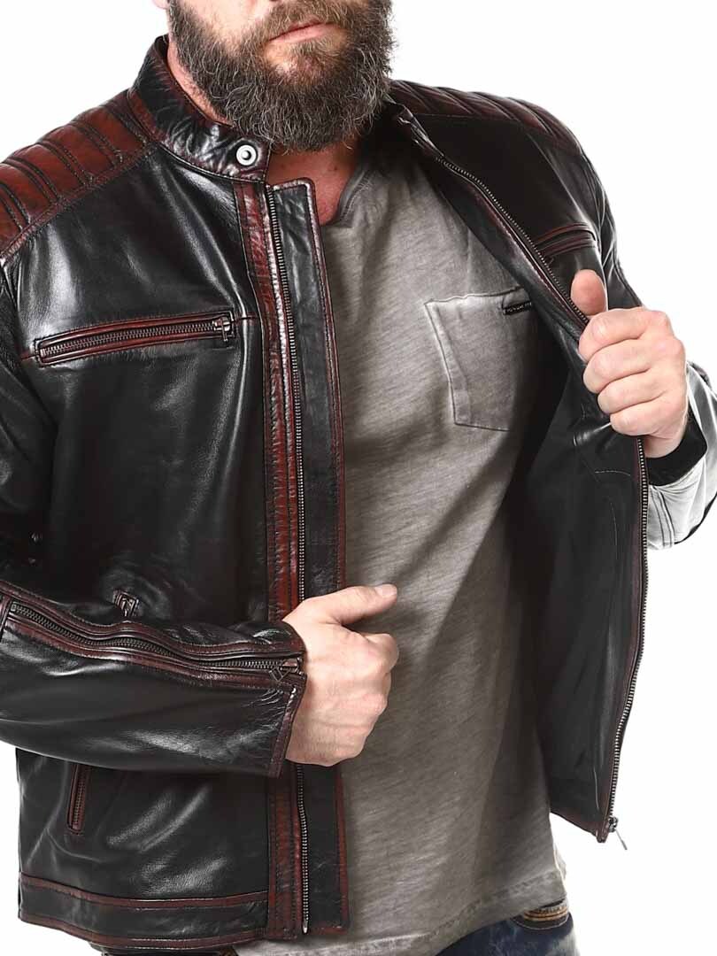 Sort jakke i mykt og smidig skinn med røde effekter. Den er justerbar i mansjettene med glidelås og har polstrede deler. Det er fire lukkbare frontlommer og to innerlommer. Jakken lukkes med glidelås.