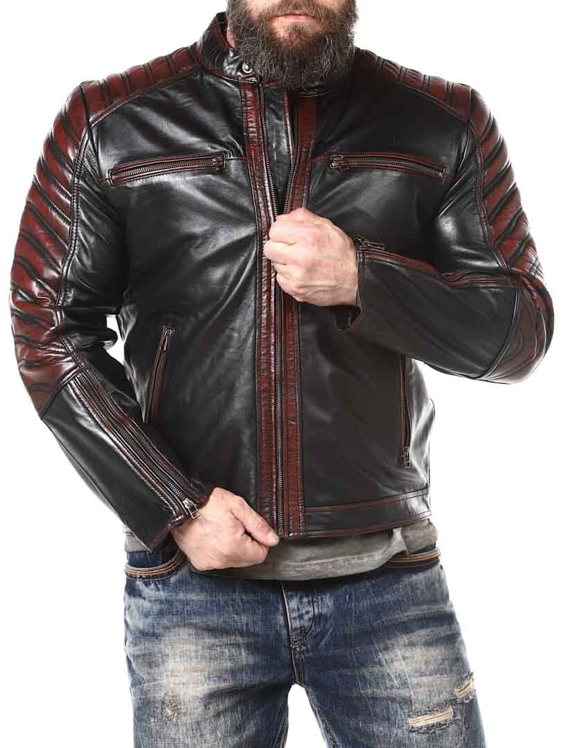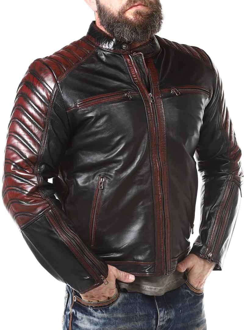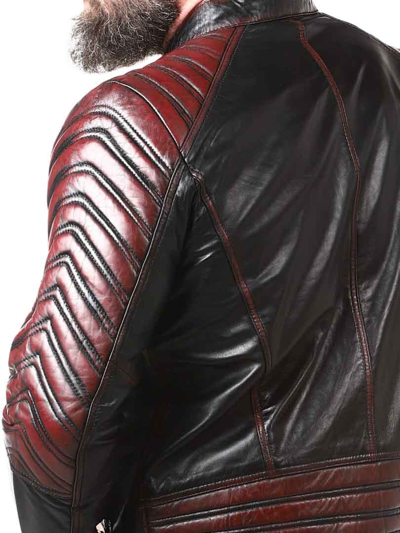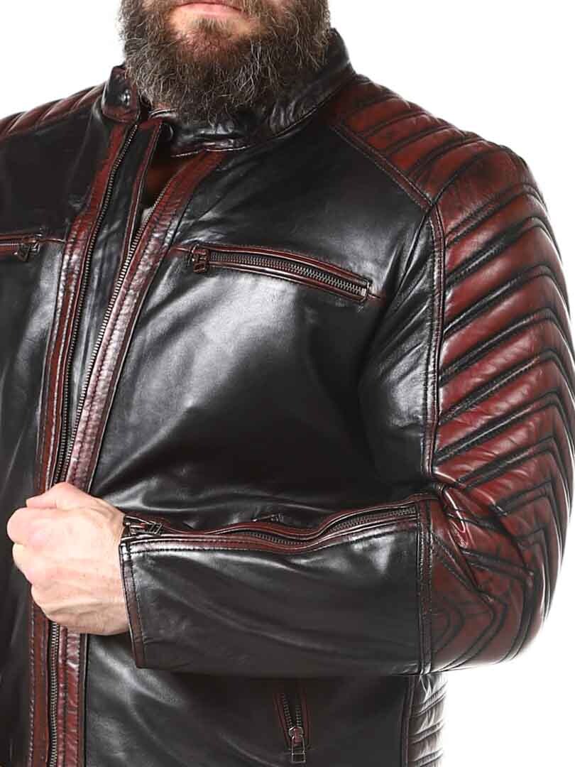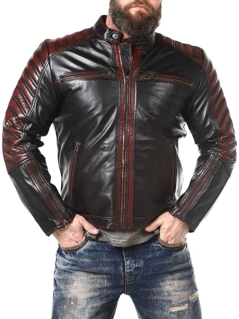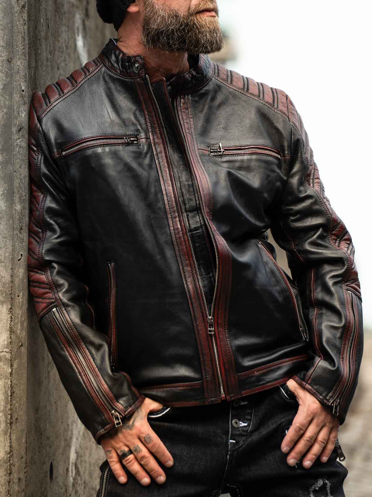 Sort jakke i mykt og smidig skinn med røde effekter. Den er justerbar i mansjettene med glidelås og har polstrede deler. Det er fire lukkbare frontlommer og to innerlommer. Jakken lukkes med glidelås.
