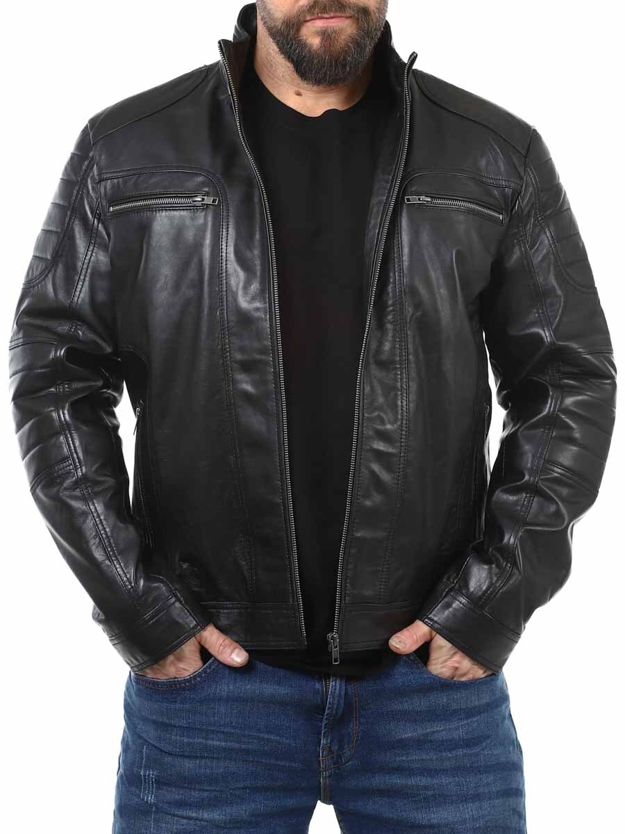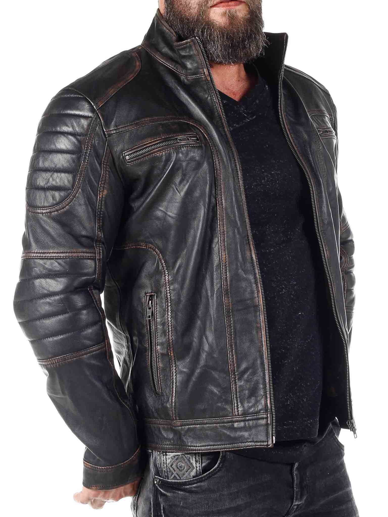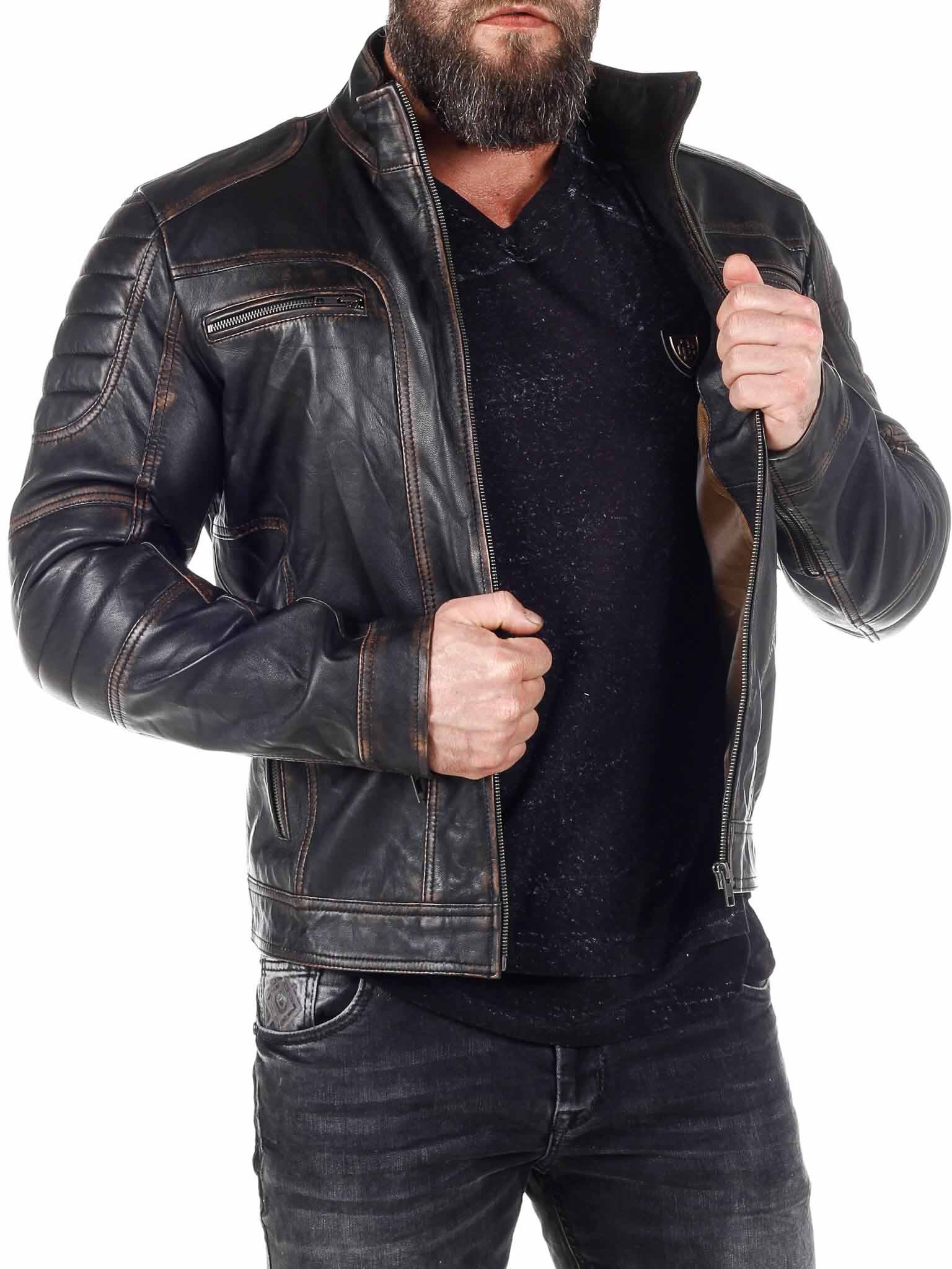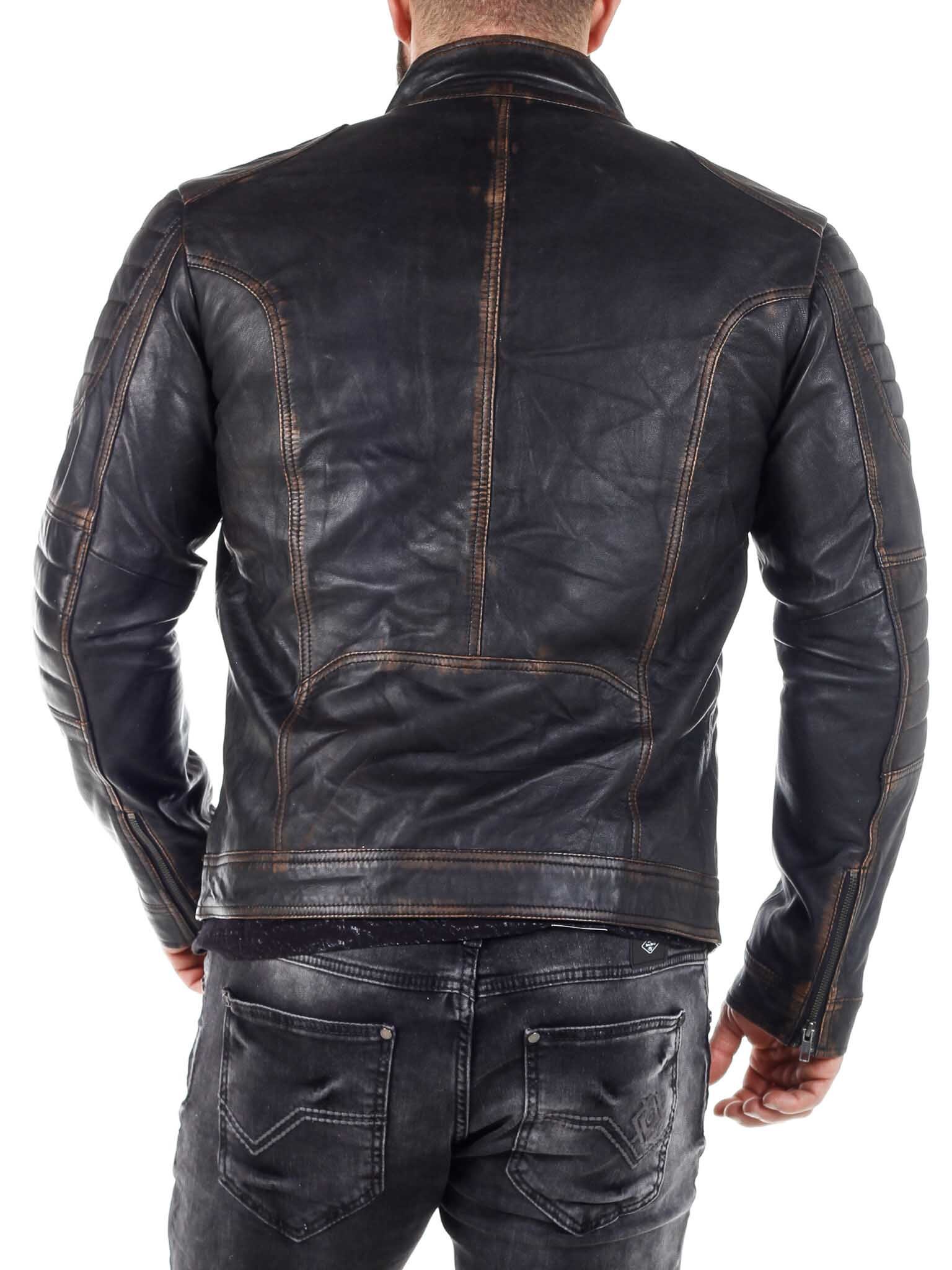 Stilig skinnjakke med lettere deler som gir et stilig vintage-utseende. Den er justerbar i mansjettene med glidelås og har polstrede deler. Det er fire lukkbare frontlommer og to innerlommer. Jakken lukkes med glidelås.
