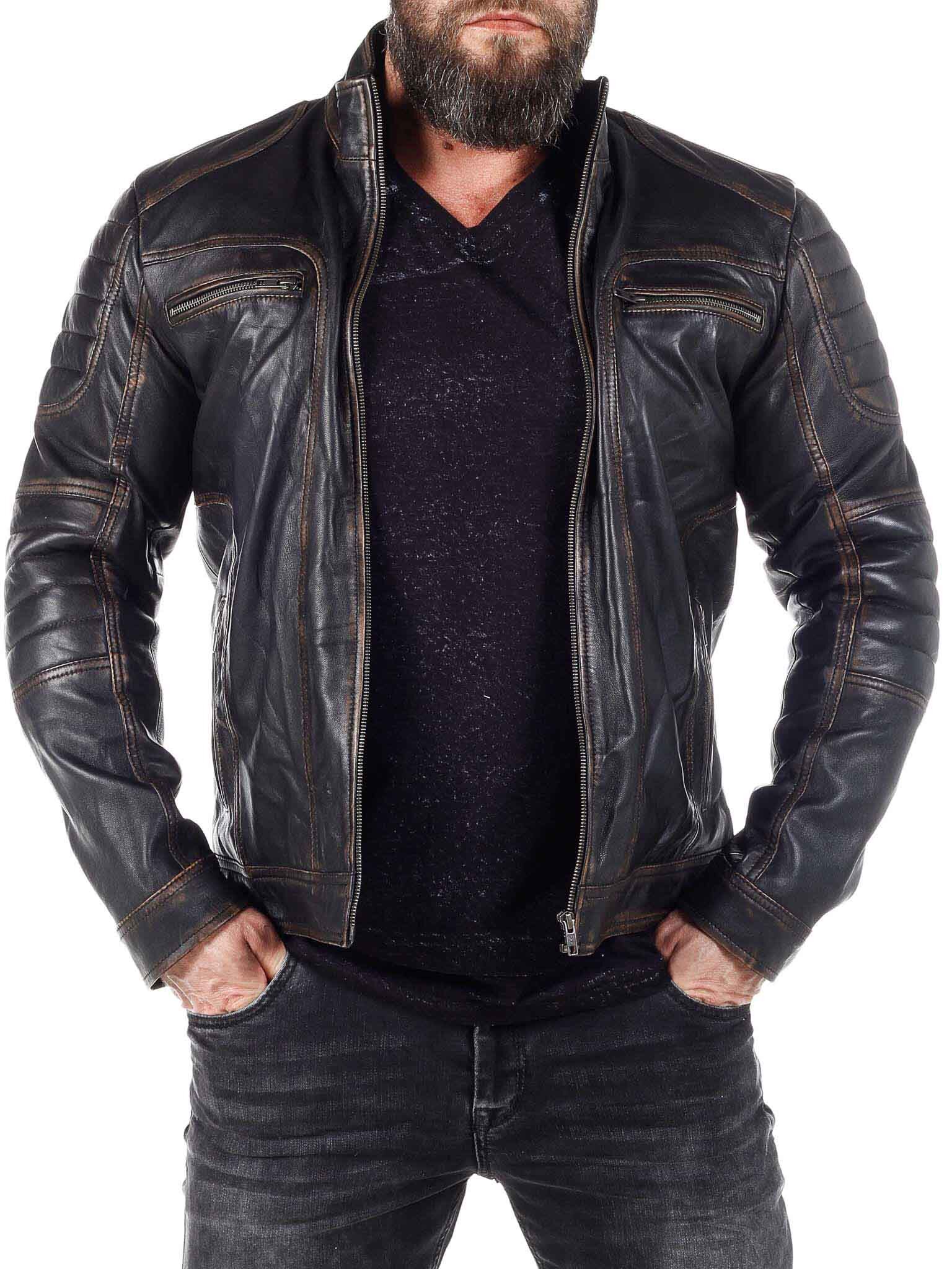 Stilig skinnjakke med lettere deler som gir et stilig vintage-utseende. Den er justerbar i mansjettene med glidelås og har polstrede deler. Det er fire lukkbare frontlommer og to innerlommer. Jakken lukkes med glidelås.