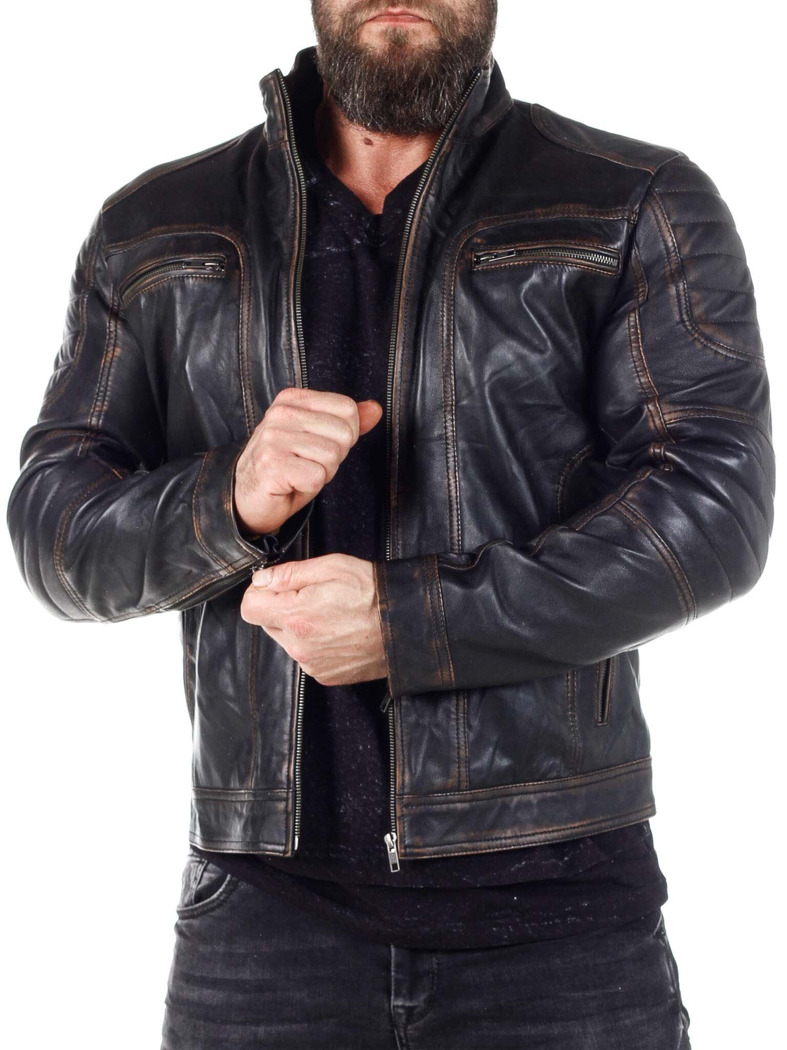 Stilig og stilren skinnjakke med krage som lukkes med glidelås. Den kan justeres i mansjettene med glidelås og har polstrede partier. Jakken har fire lommer foran som kan lukkes, og to innerlommer. Denne jakken finner du bare hos Rockdenim!