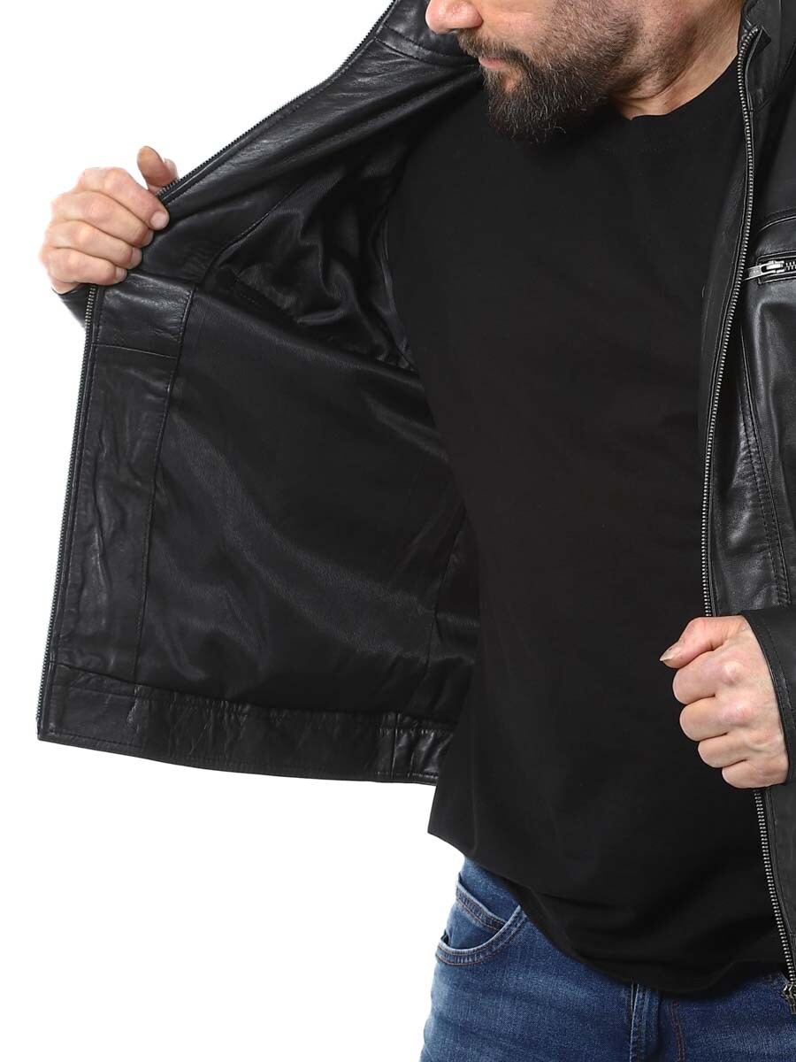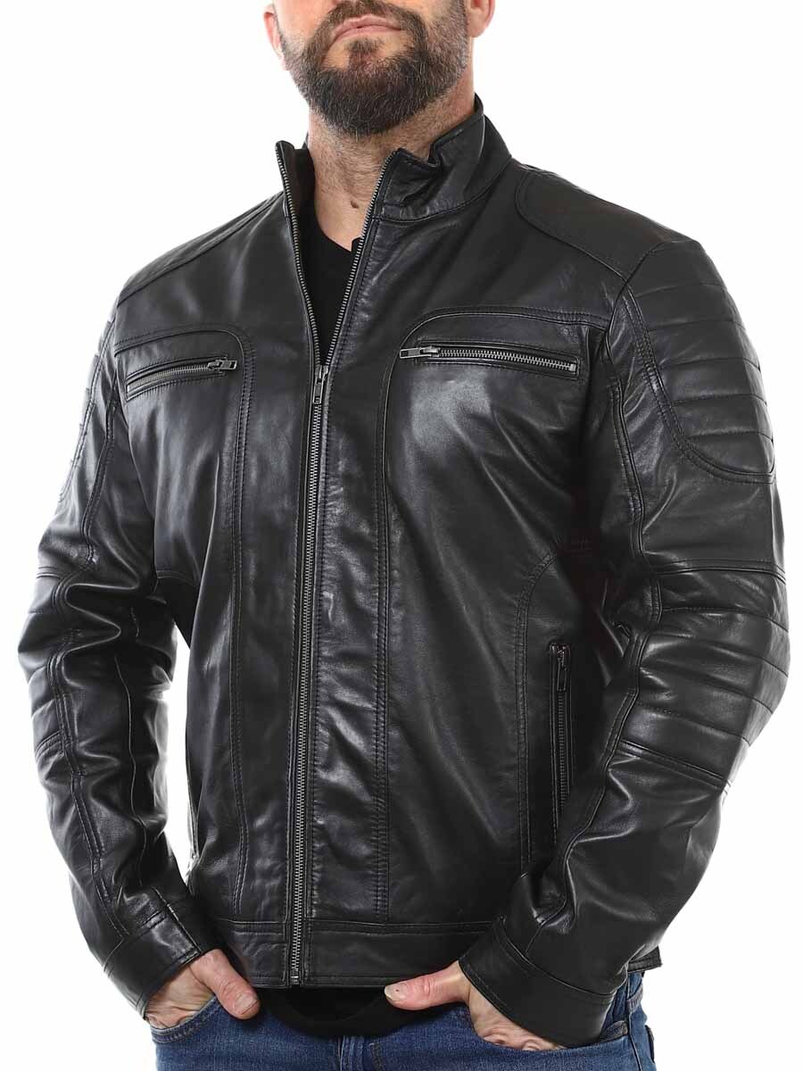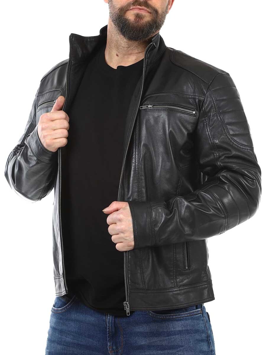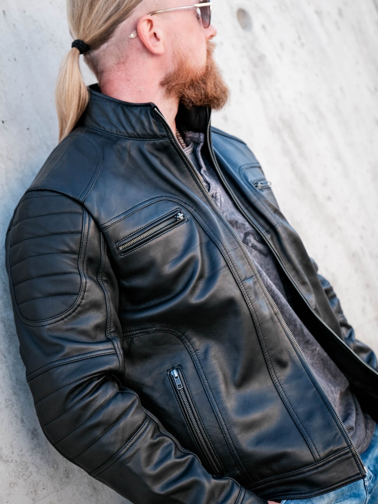 Stilig og stilren skinnjakke med krage som lukkes med glidelås. Den kan justeres i mansjettene med glidelås og har polstrede partier. Jakken har fire lommer foran som kan lukkes, og to innerlommer. Denne jakken finner du bare hos Rockdenim!