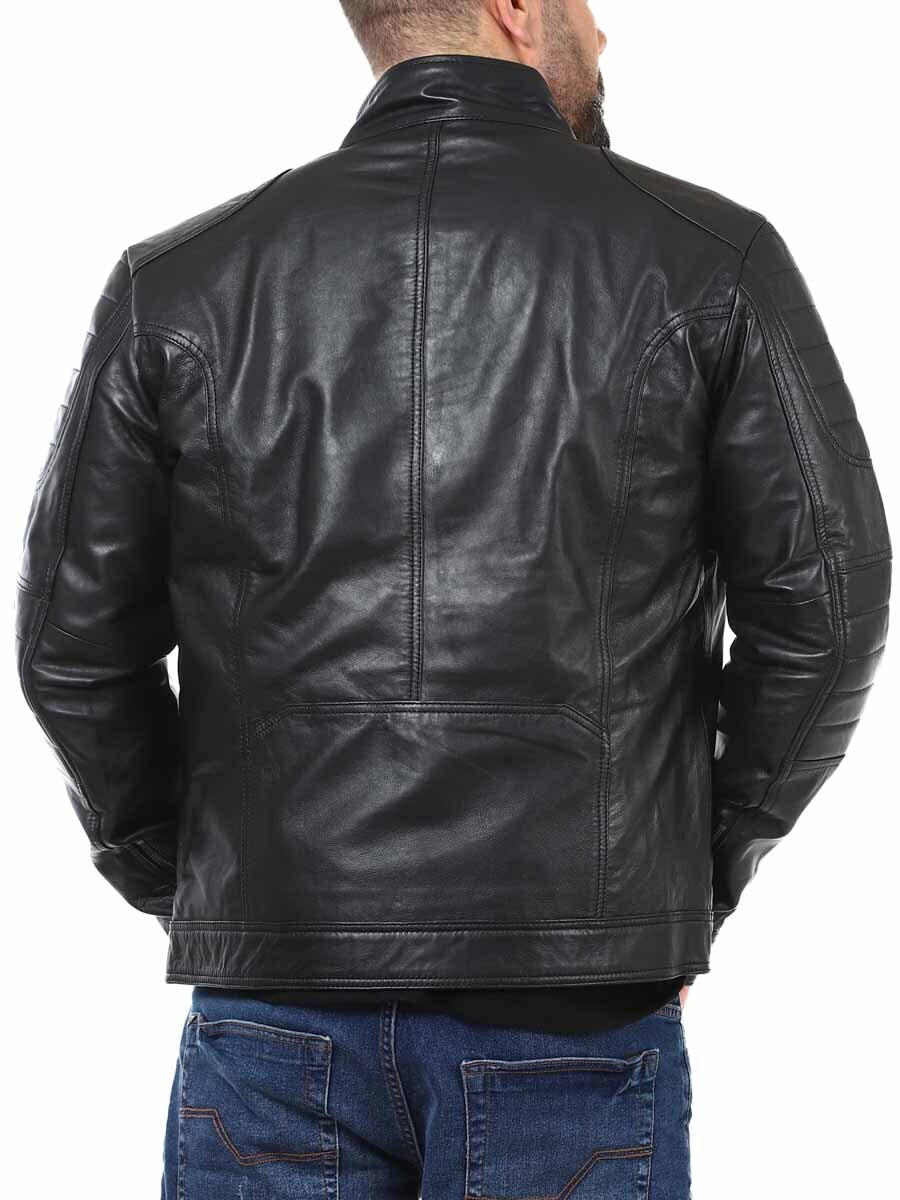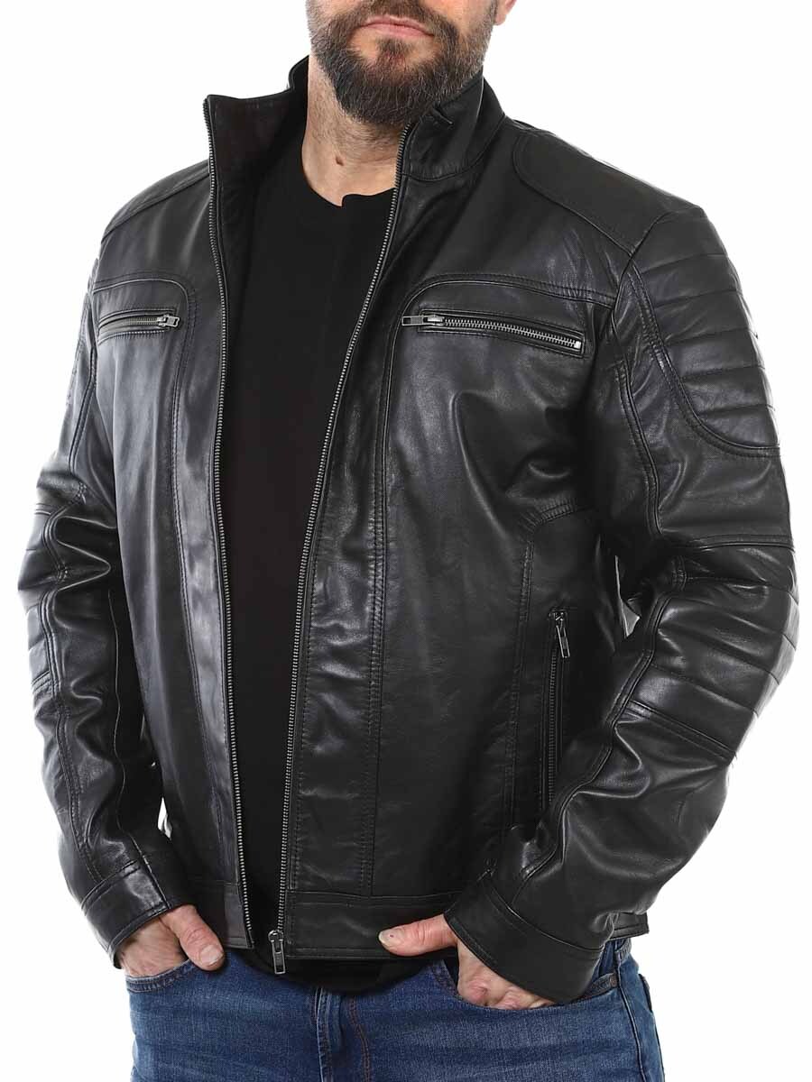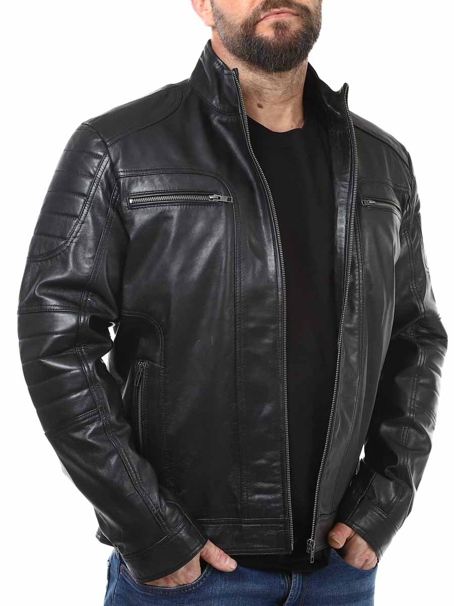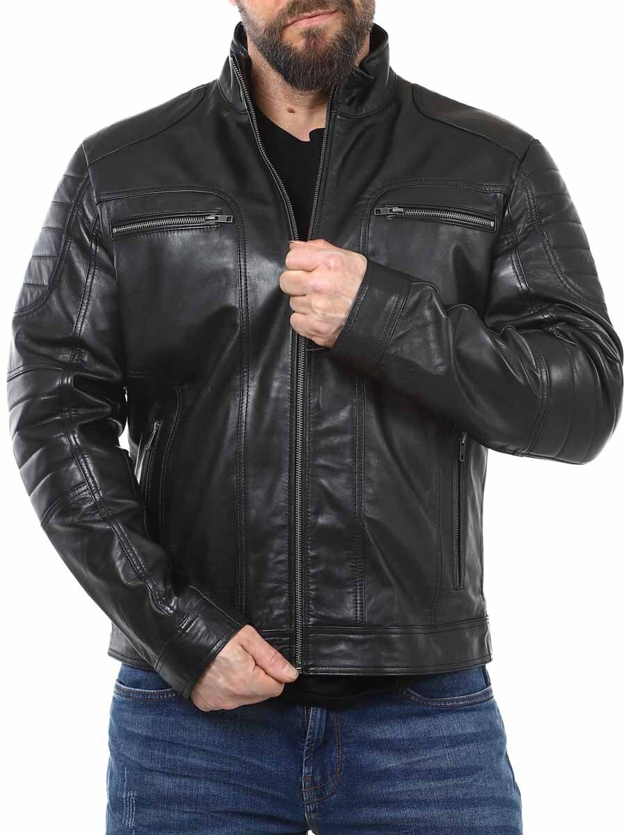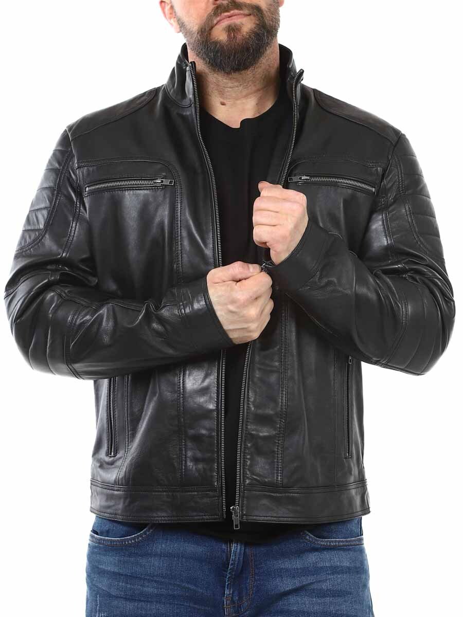 Stilig og stilren skinnjakke med krage som lukkes med glidelås. Den kan justeres i mansjettene med glidelås og har polstrede partier. Jakken har fire lommer foran som kan lukkes, og to innerlommer. Denne jakken finner du bare hos Rockdenim!