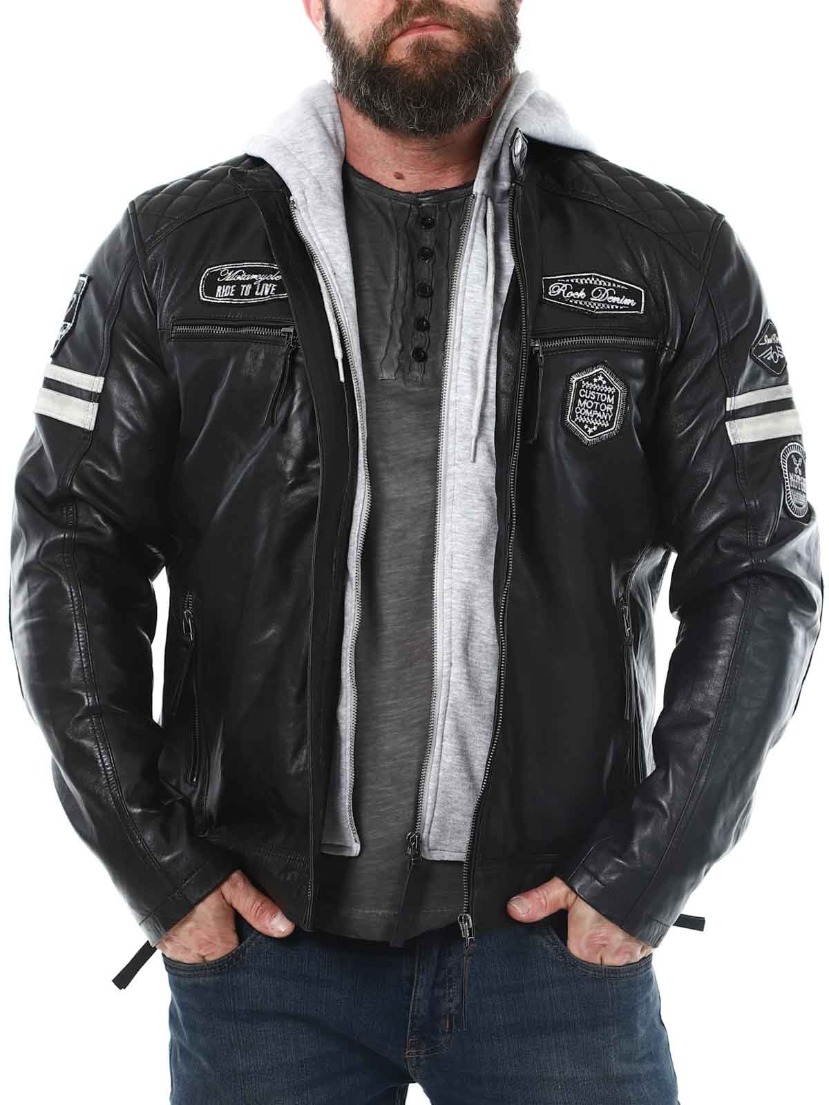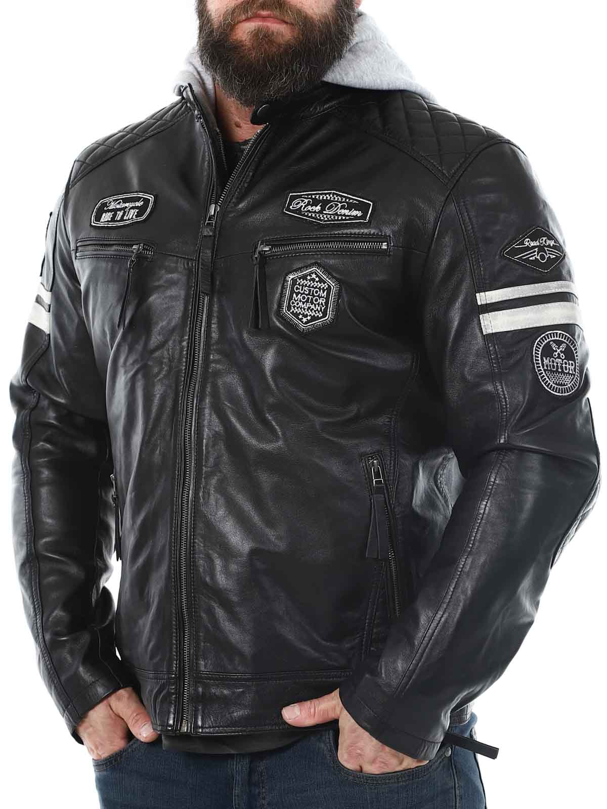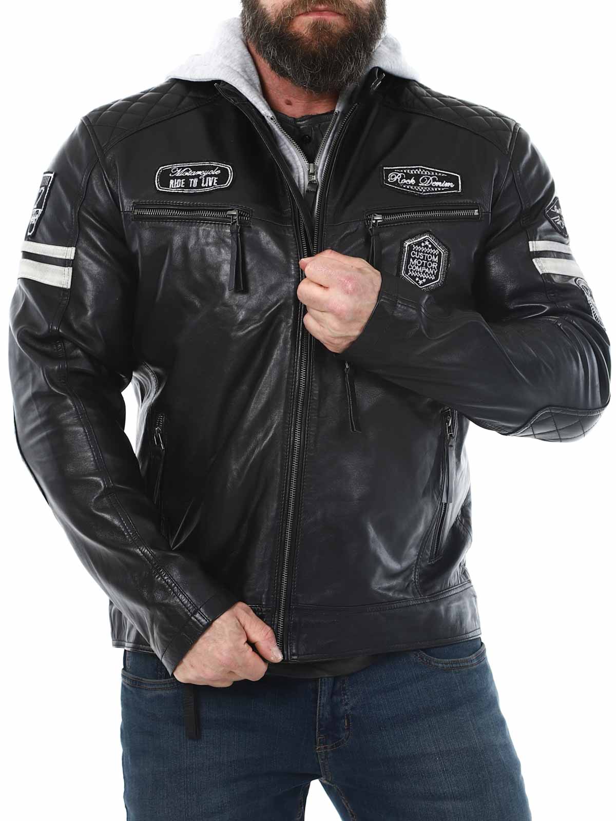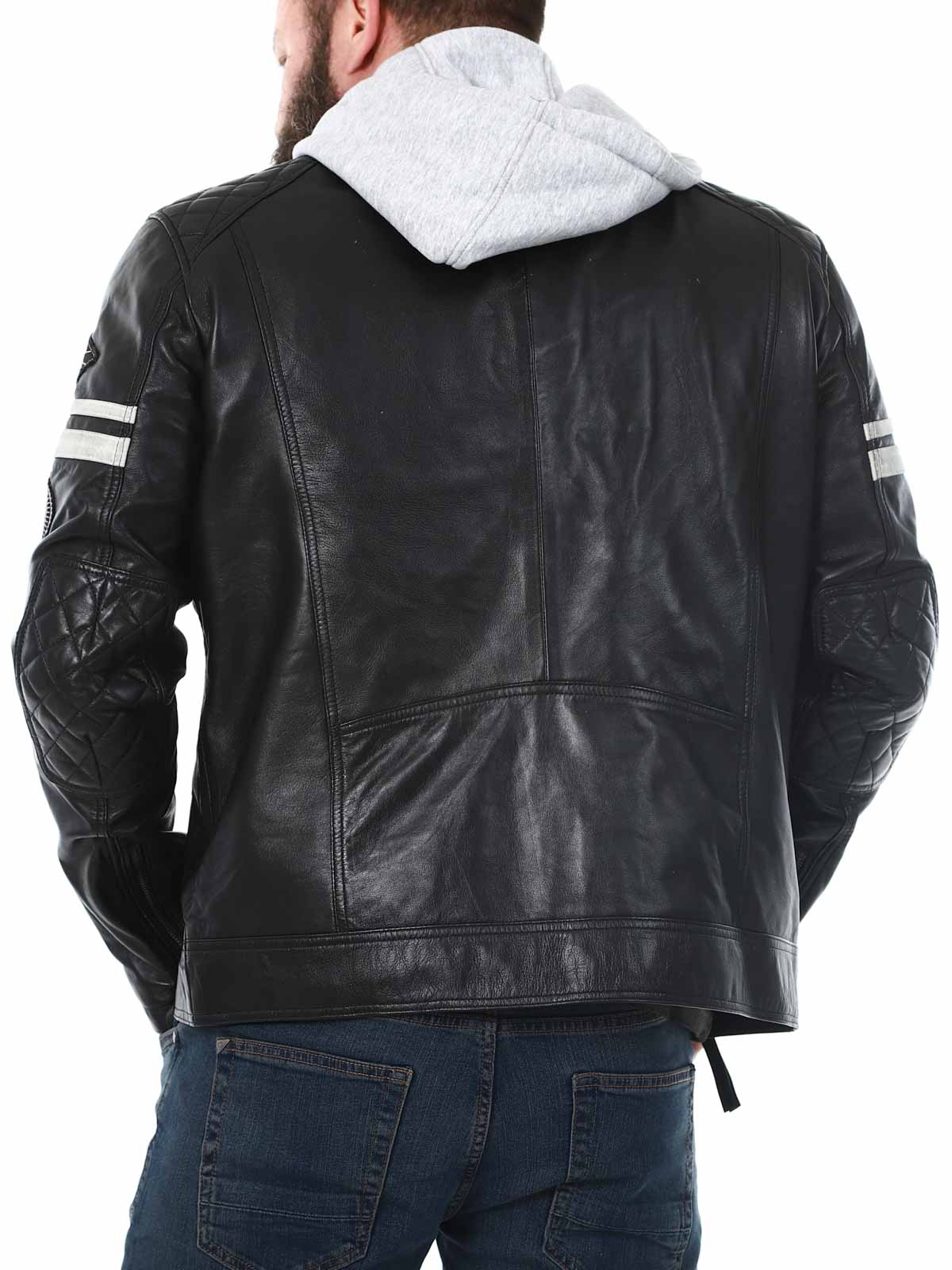 Racing-inspired jacket in soft and supple leather. Designed with fabric patches and a removable hood in sweatshirt material. Four front pockets with zipper, two inner pockets and adjustable cuffs. Stylish jacket that is only available at RockDenim!