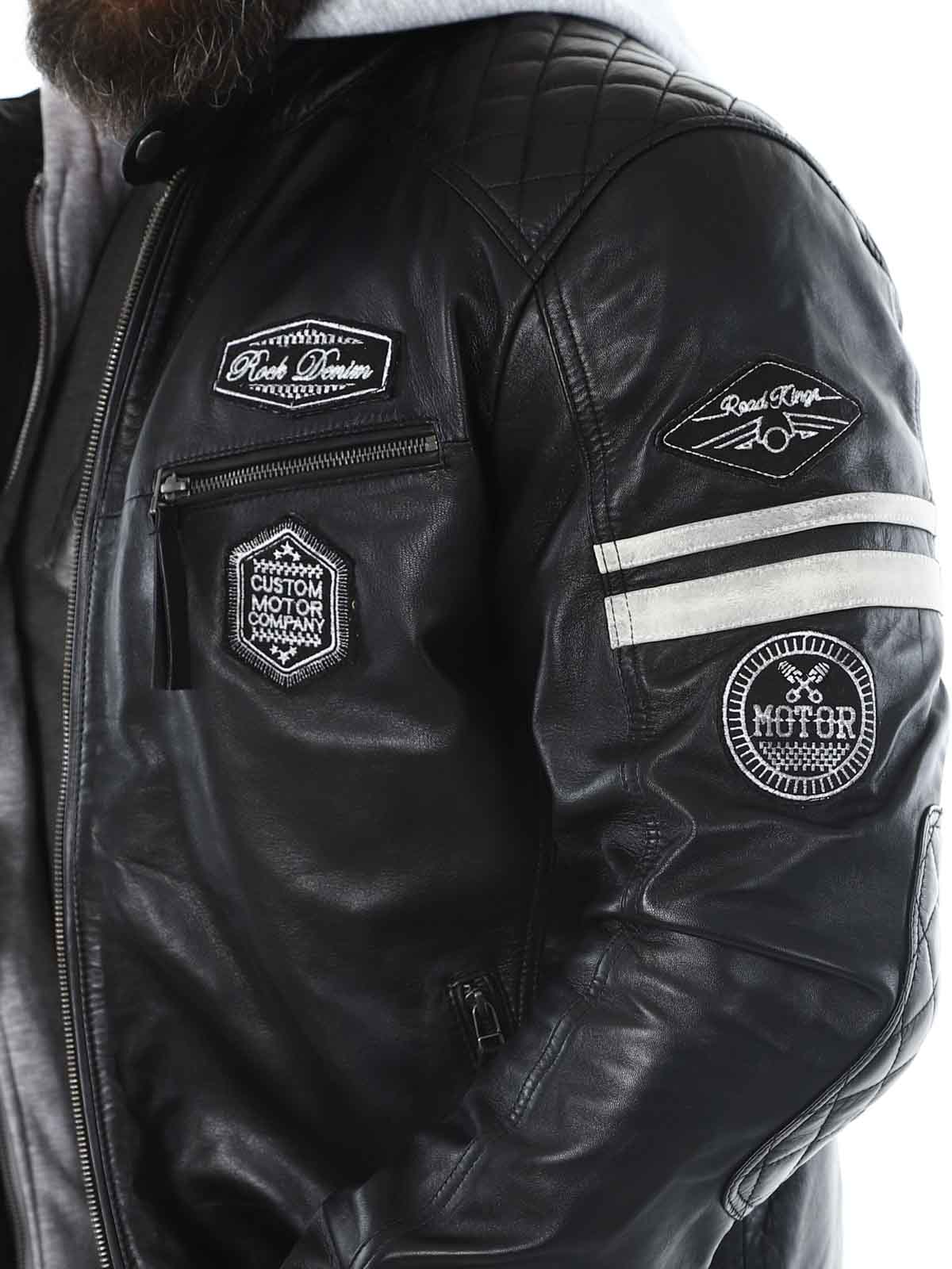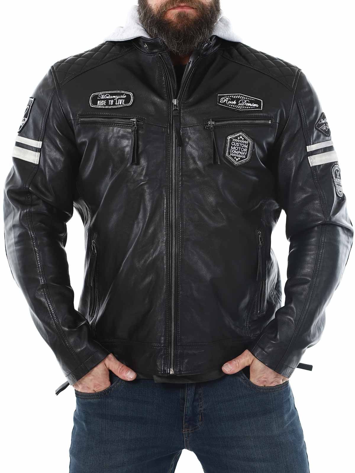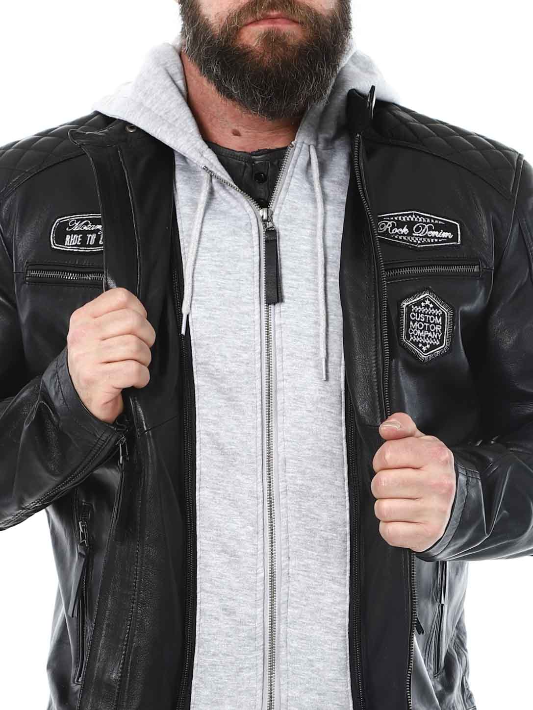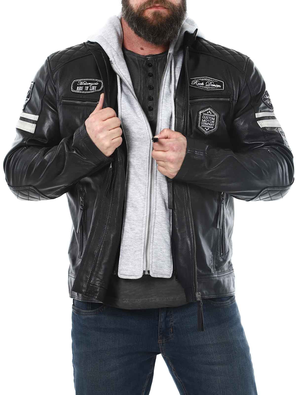 Racing-inspired jacket in soft and supple leather. Designed with fabric patches and a removable hood in sweatshirt material. Four front pockets with zipper, two inner pockets and adjustable cuffs. Stylish jacket that is only available at RockDenim!