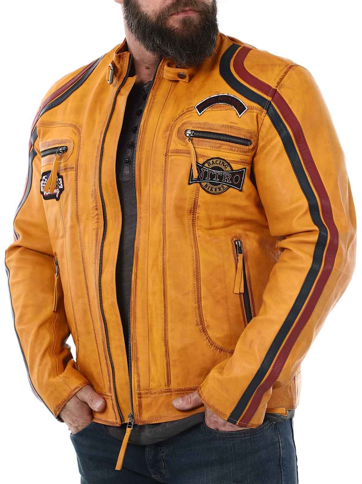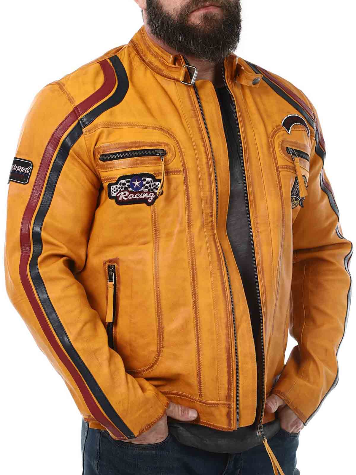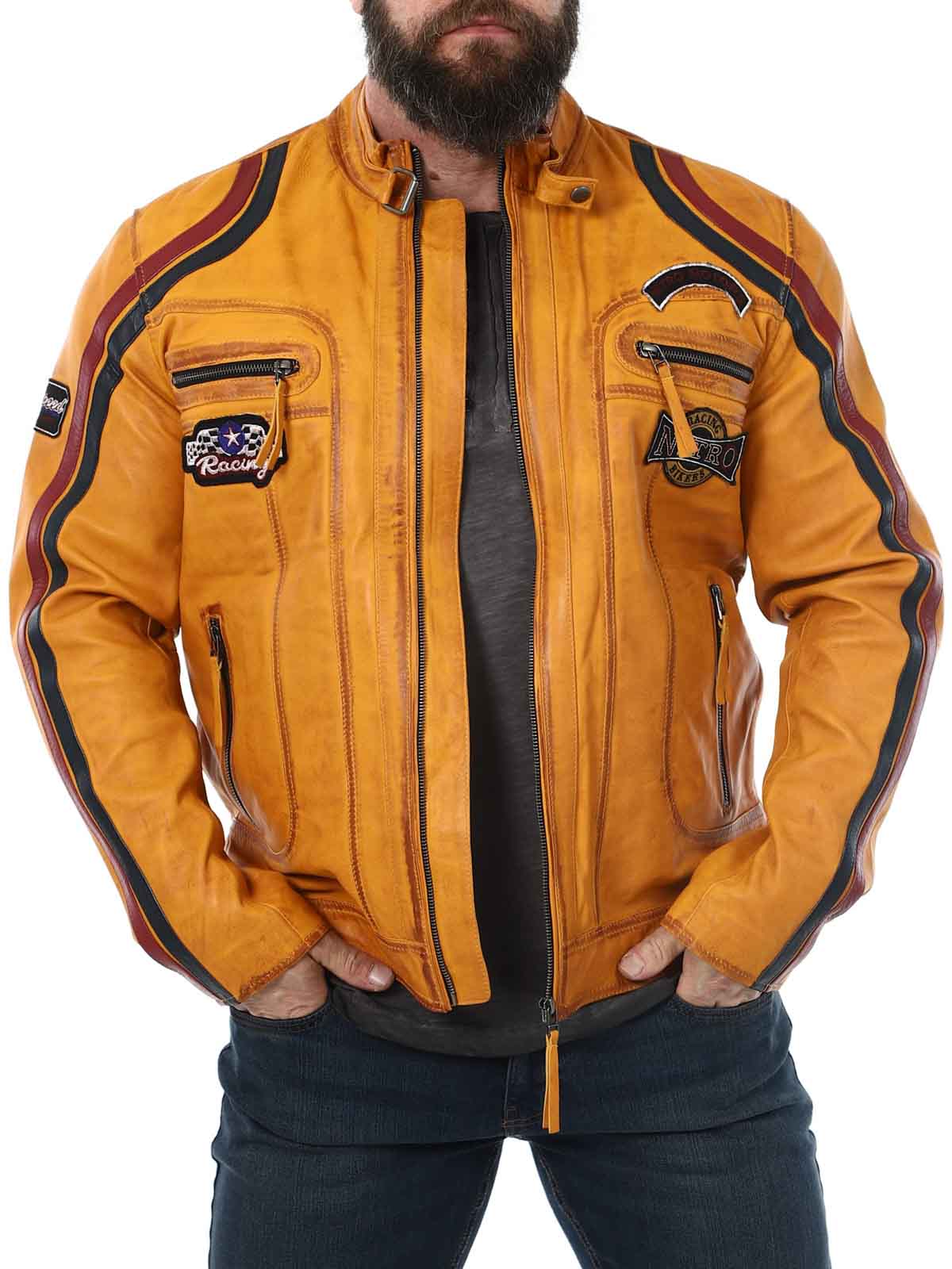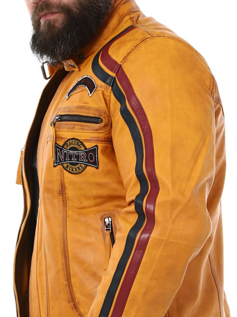 Jakke med stofflapper og striper som gir et stilig racinglook. Laget av mykt og smidig skinn. Den har fire frontlommer med glidelås, to innerlommer og justerbare mansjetter. Frekk jakke kun tilgjengelig hos RockDenim!