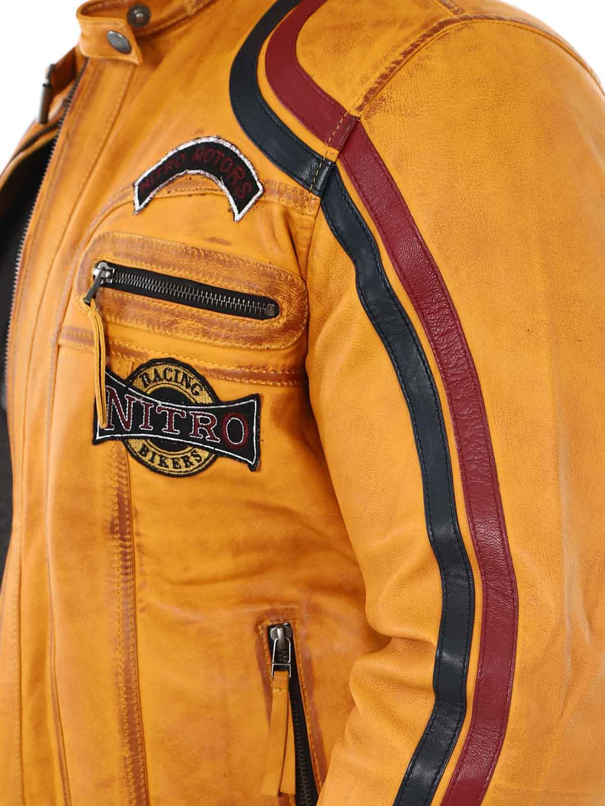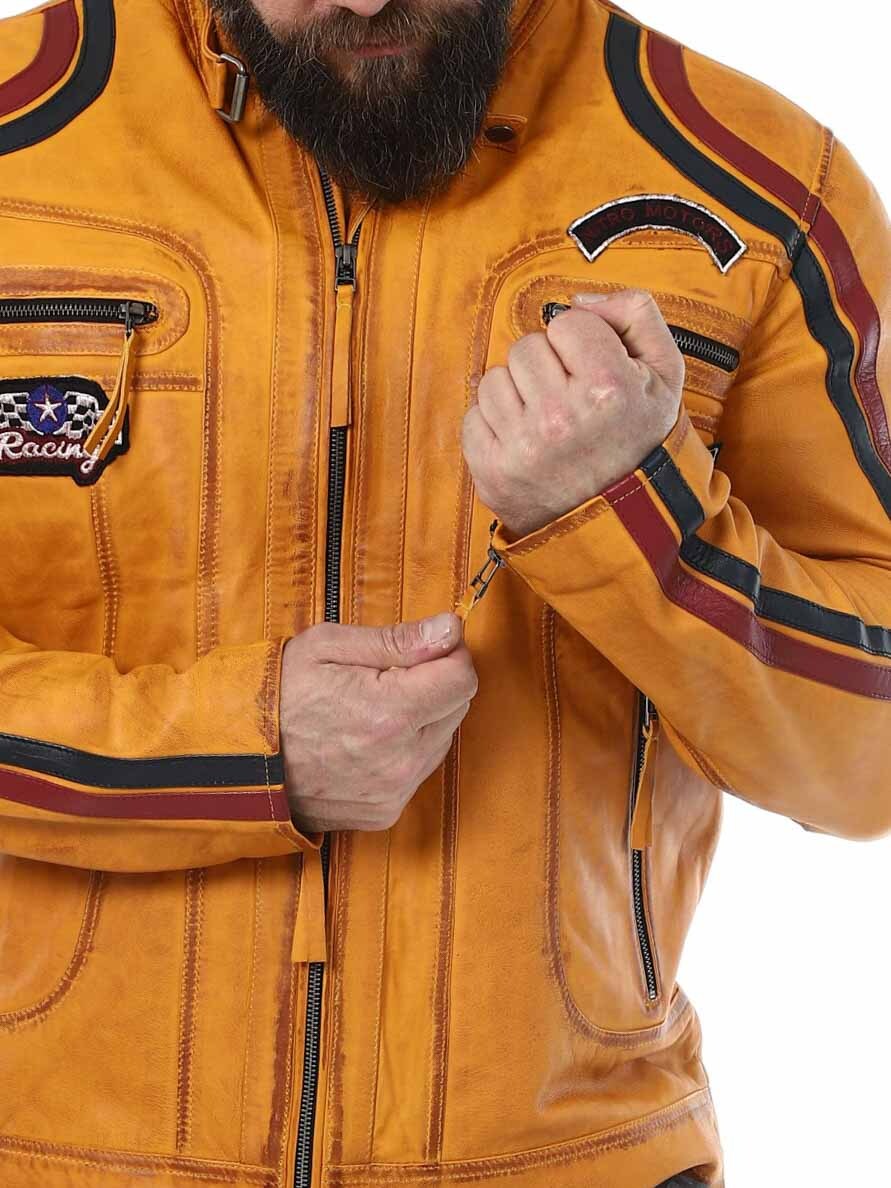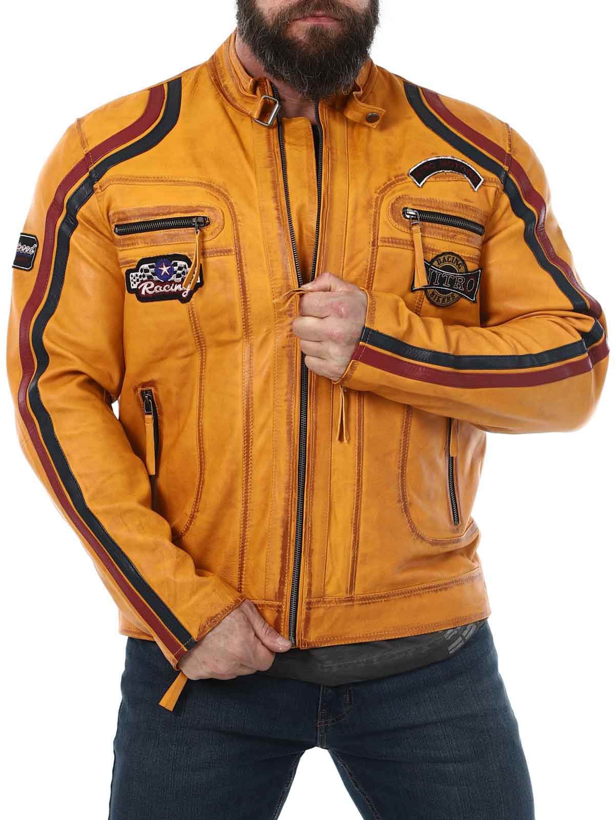 Jakke med stofflapper og striper som gir et stilig racinglook. Laget av mykt og smidig skinn. Den har fire frontlommer med glidelås, to innerlommer og justerbare mansjetter. Frekk jakke kun tilgjengelig hos RockDenim!