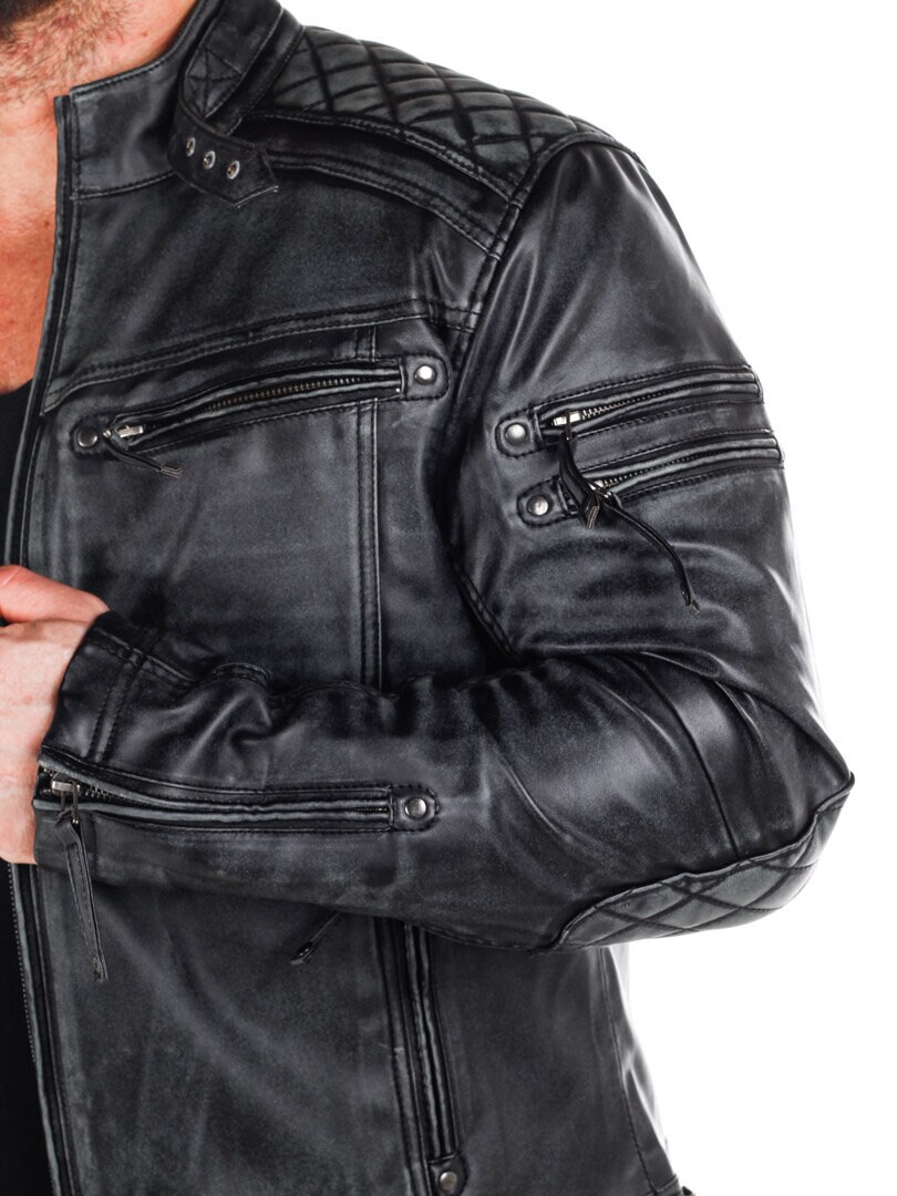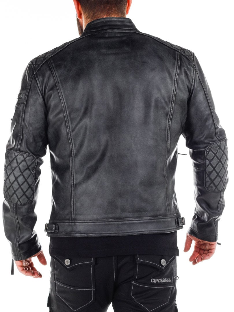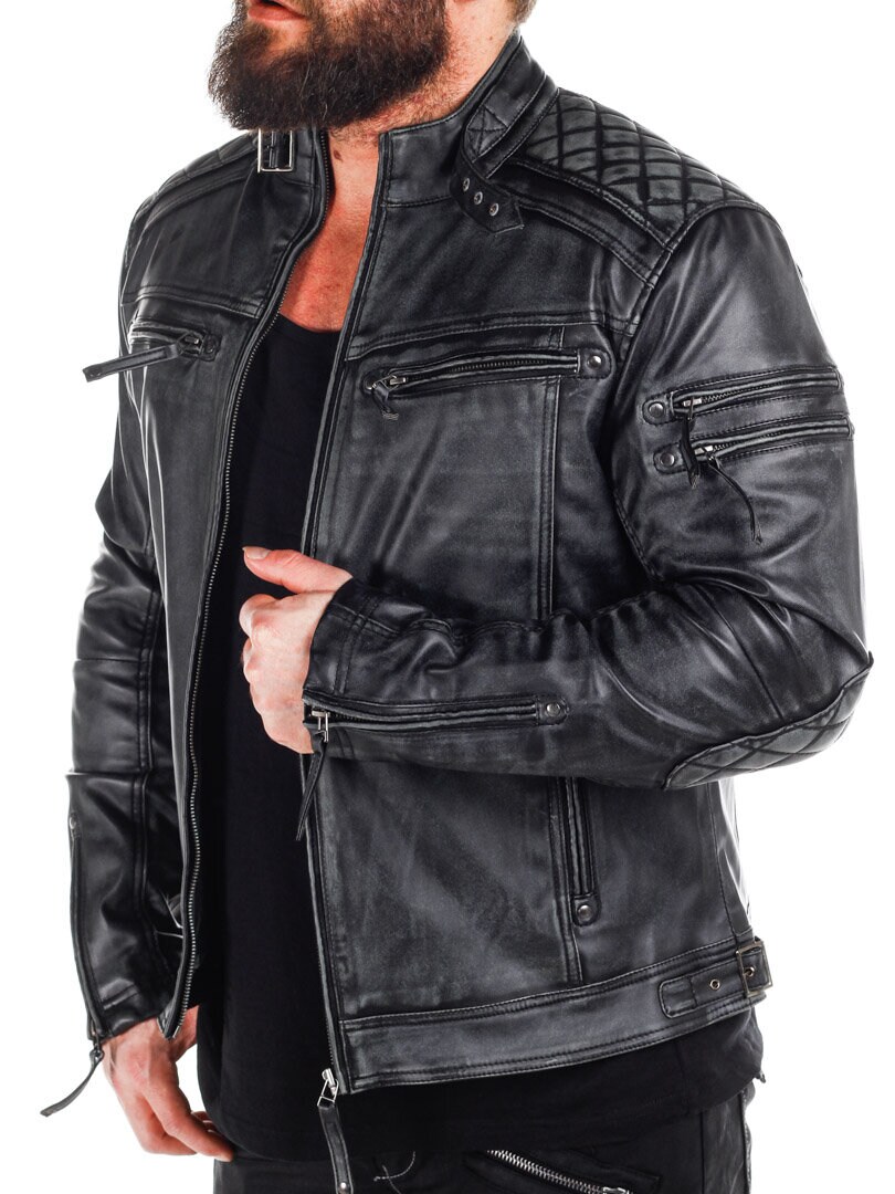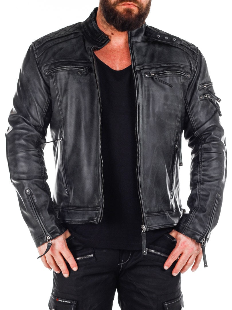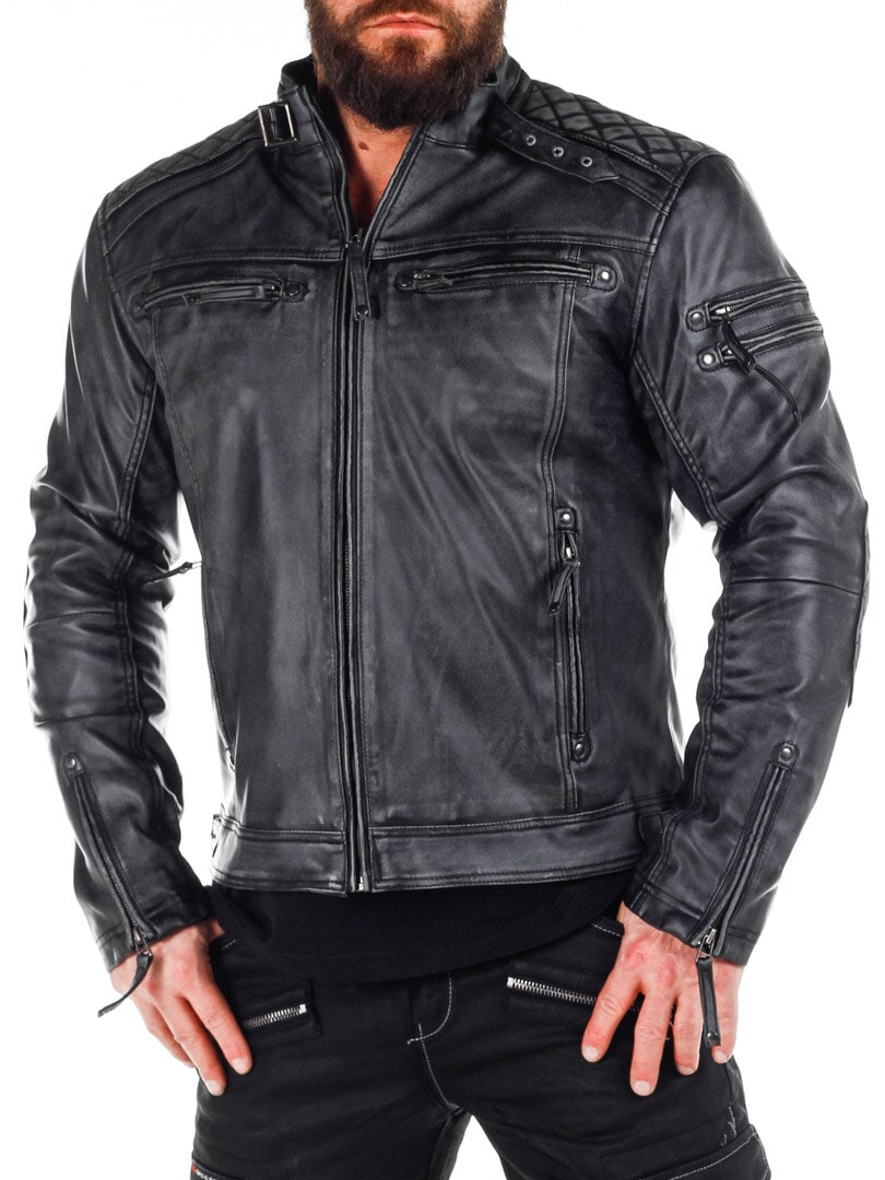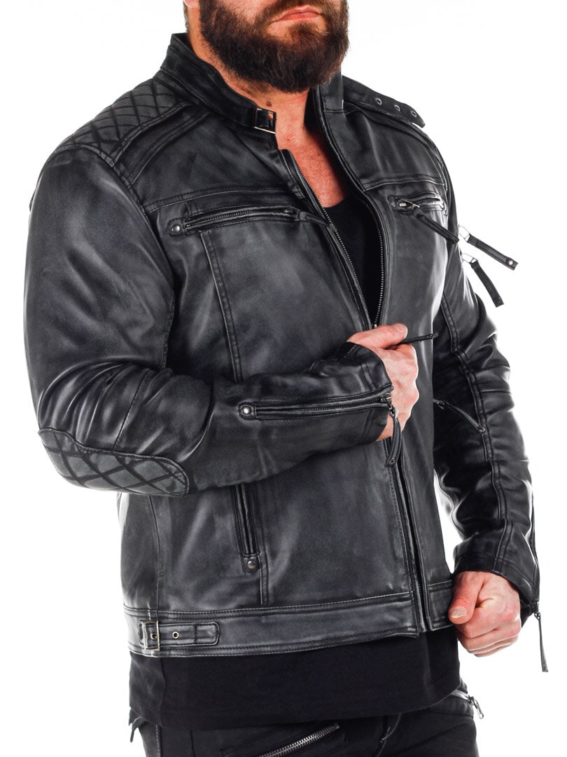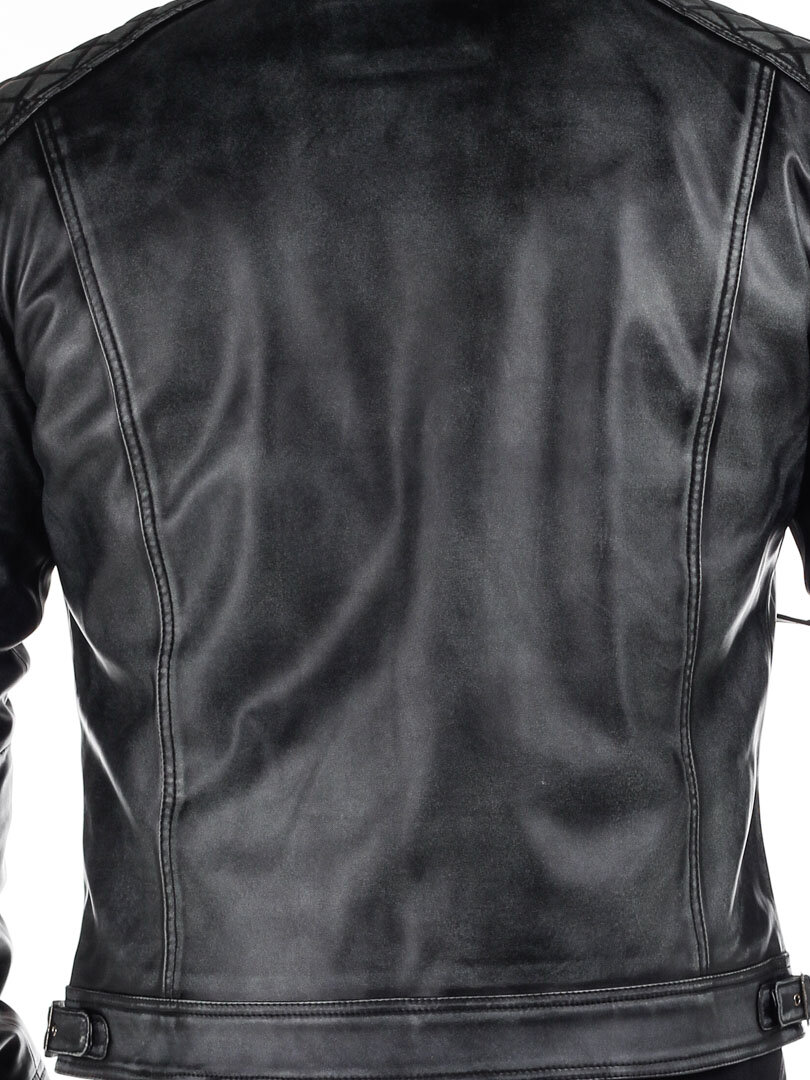 Jakke i skinnimitasjon med slitt look som gir en tøff look. Den har polstrede deler og justerbare mansjetter, samt linning. To innerlommer og fire lukkbare lommer foran. Denne jakken er eksklusivt produsert for RockDenim, og du finner den kun hos oss!
