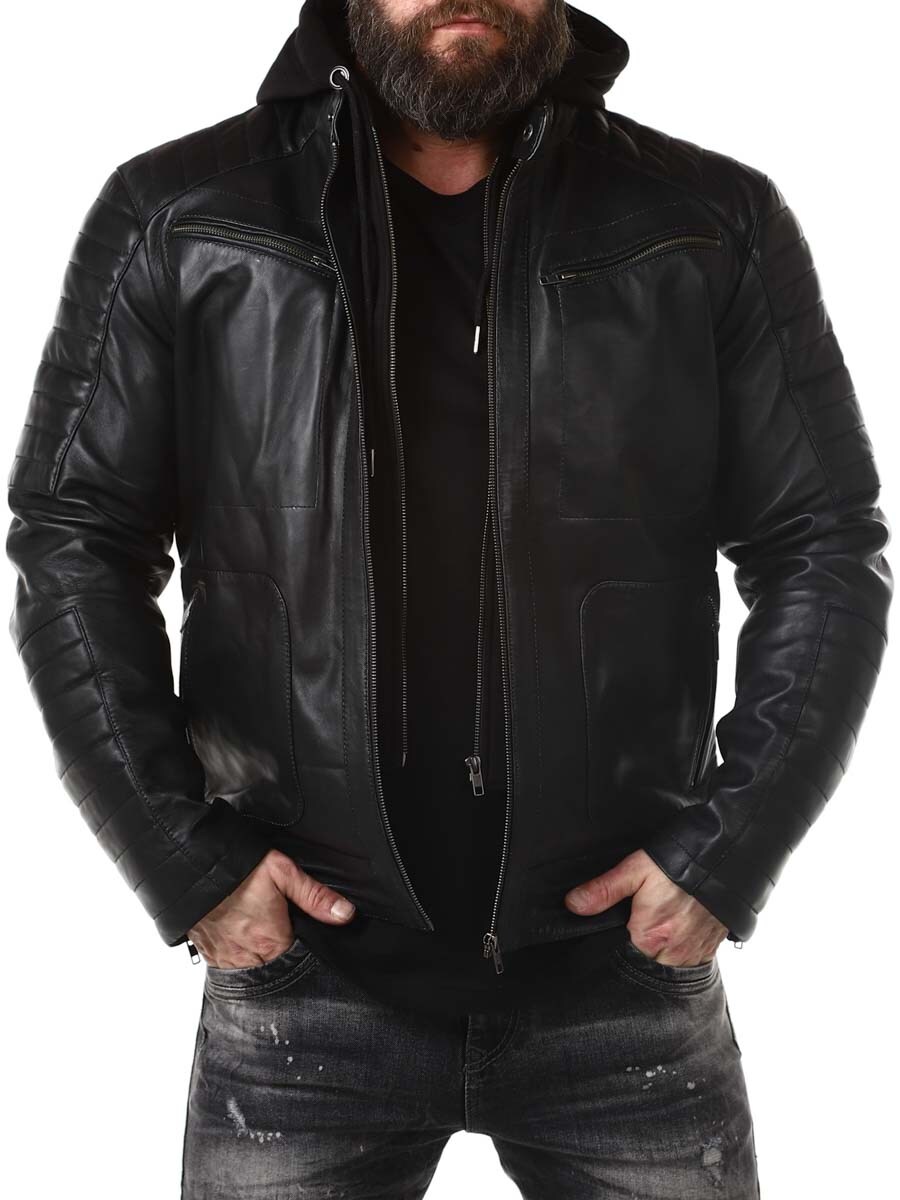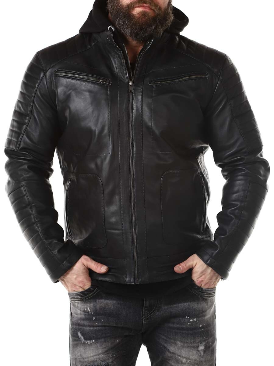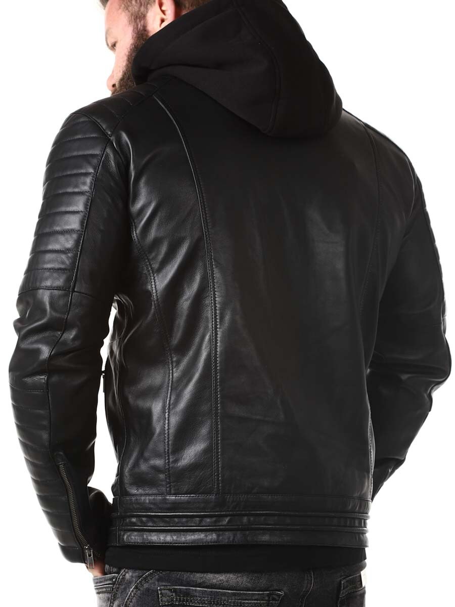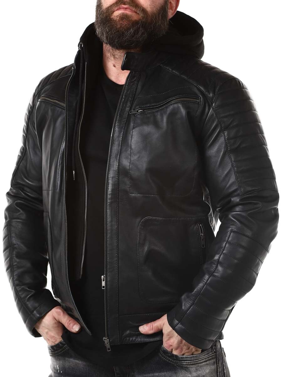 Sort jakke i ekte skinn. Den har en avtagbar hette i mykt sweatshirtmateriale som er synlig langs hele jakkeåpningen. Polstret del på ermene og fire lukkbare frontlommer, samt to innerlommer. Kraftig materiale gjør at den henger fint på kroppen.