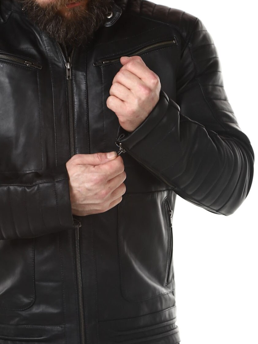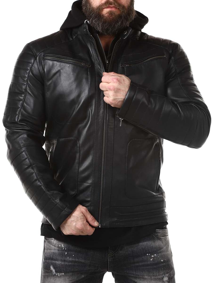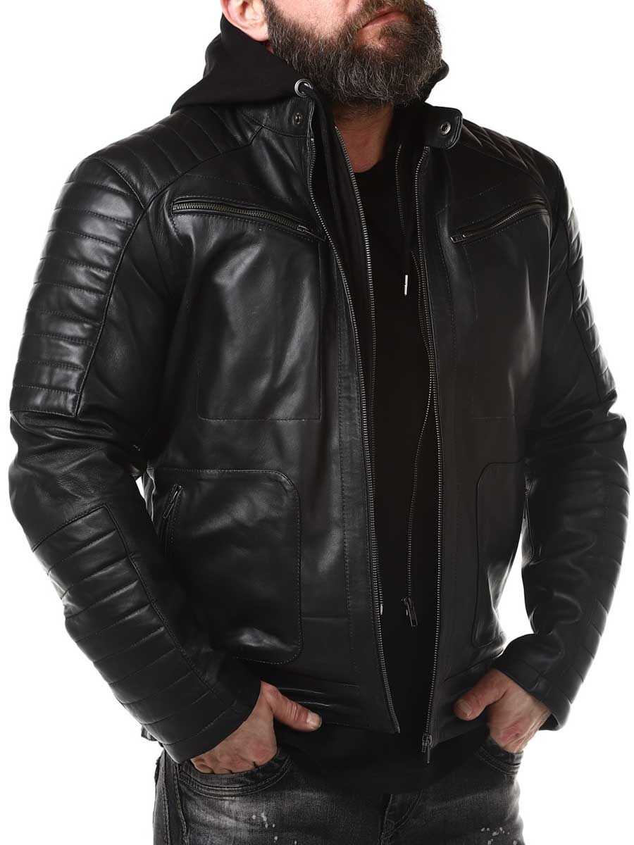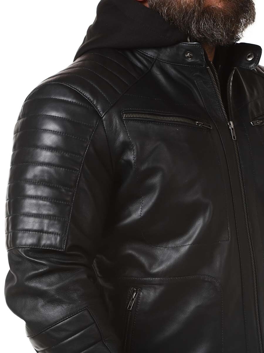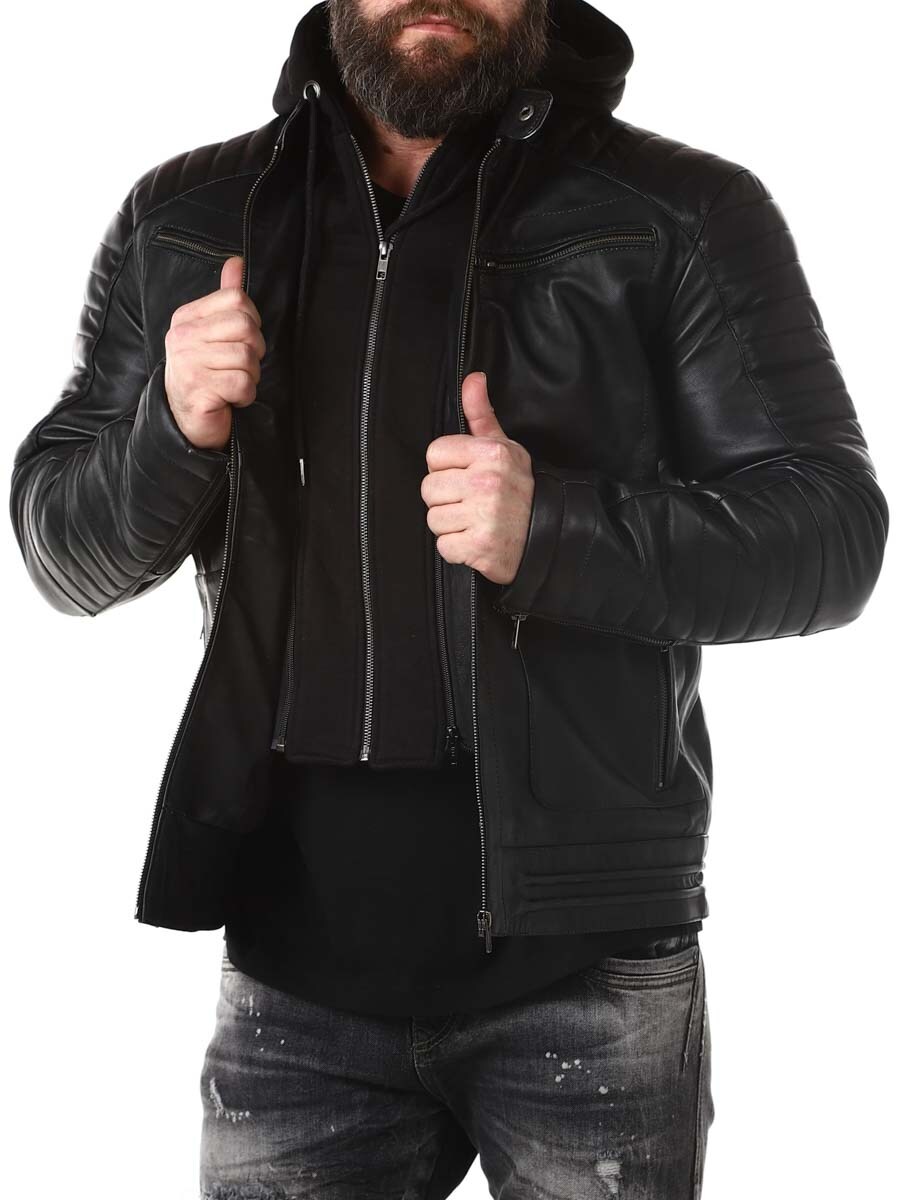 Sort jakke i ekte skinn. Den har en avtagbar hette i mykt sweatshirtmateriale som er synlig langs hele jakkeåpningen. Polstret del på ermene og fire lukkbare frontlommer, samt to innerlommer. Kraftig materiale gjør at den henger fint på kroppen.