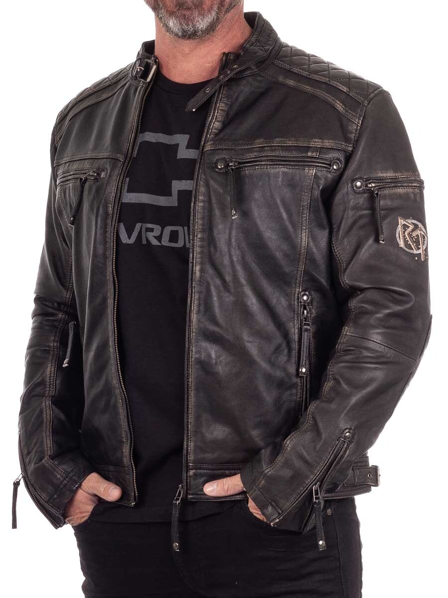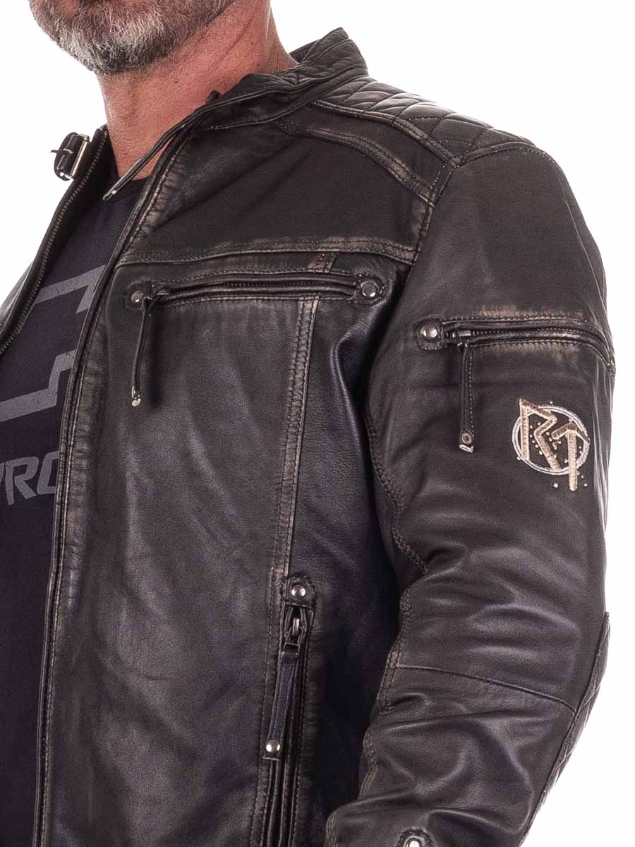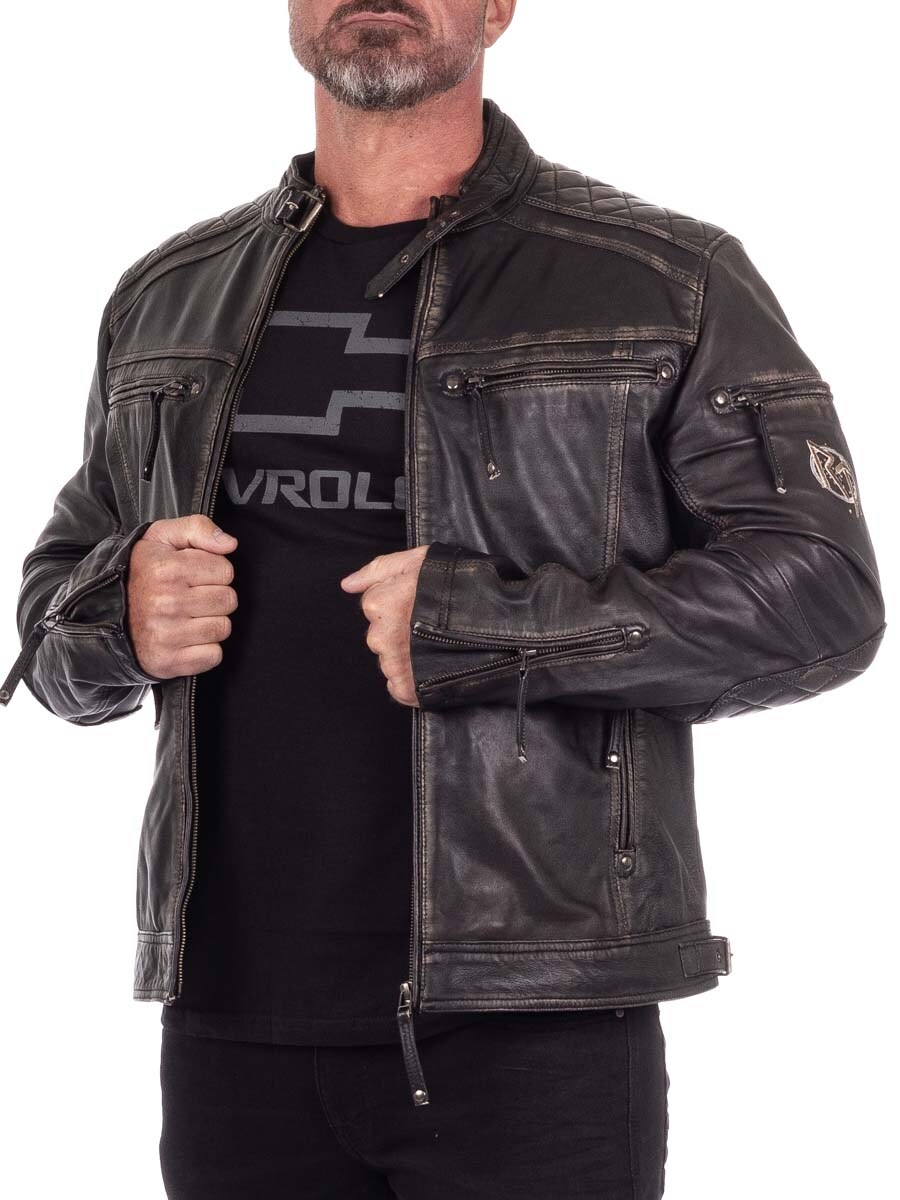 Røff jakke i ekte skinn med slitt vintage-look og broderte vikingmotiver som gir en unik karakter. Designet med vatterte partier, justerbare mansjetter og linning for optimal passform. Fire lukkbare lommer foran og to praktiske innerlommer. Denne jakken er eksklusivt laget for våre kunder og du finner den kun hos RockDenim!