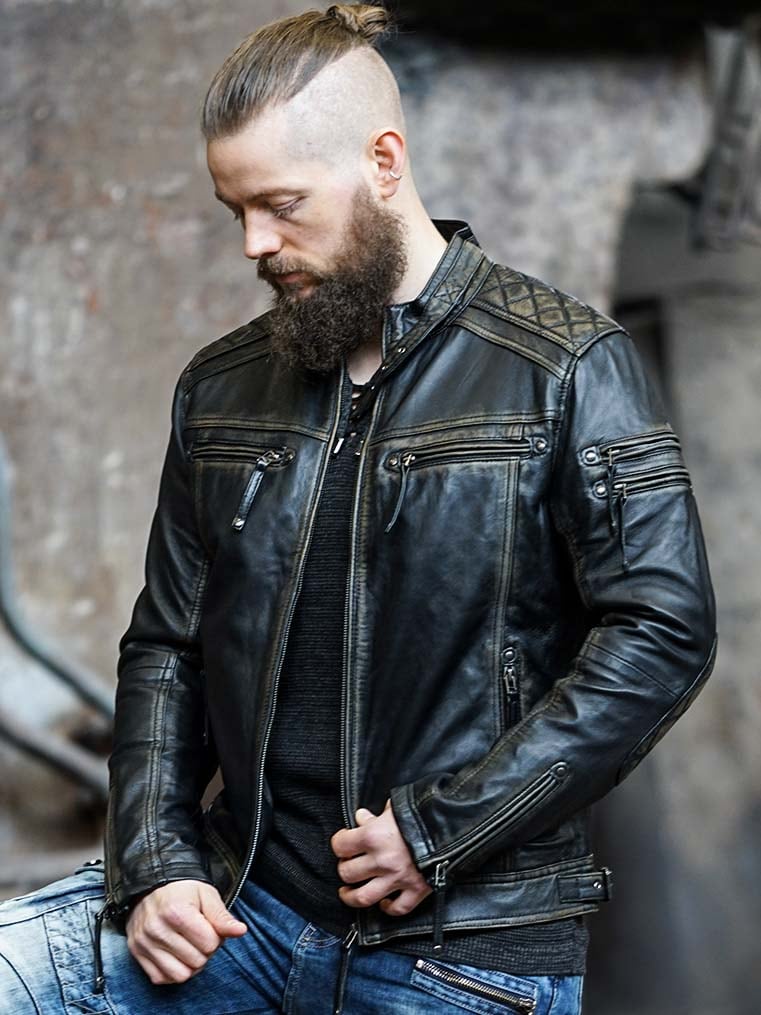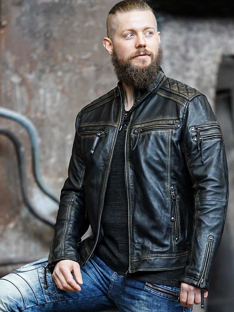 Jakke i ekte skinn med slitt look som gir en tøff look. Den har polstrede deler og justerbare mansjetter, samt linning. To innerlommer og fire lukkbare lommer foran.