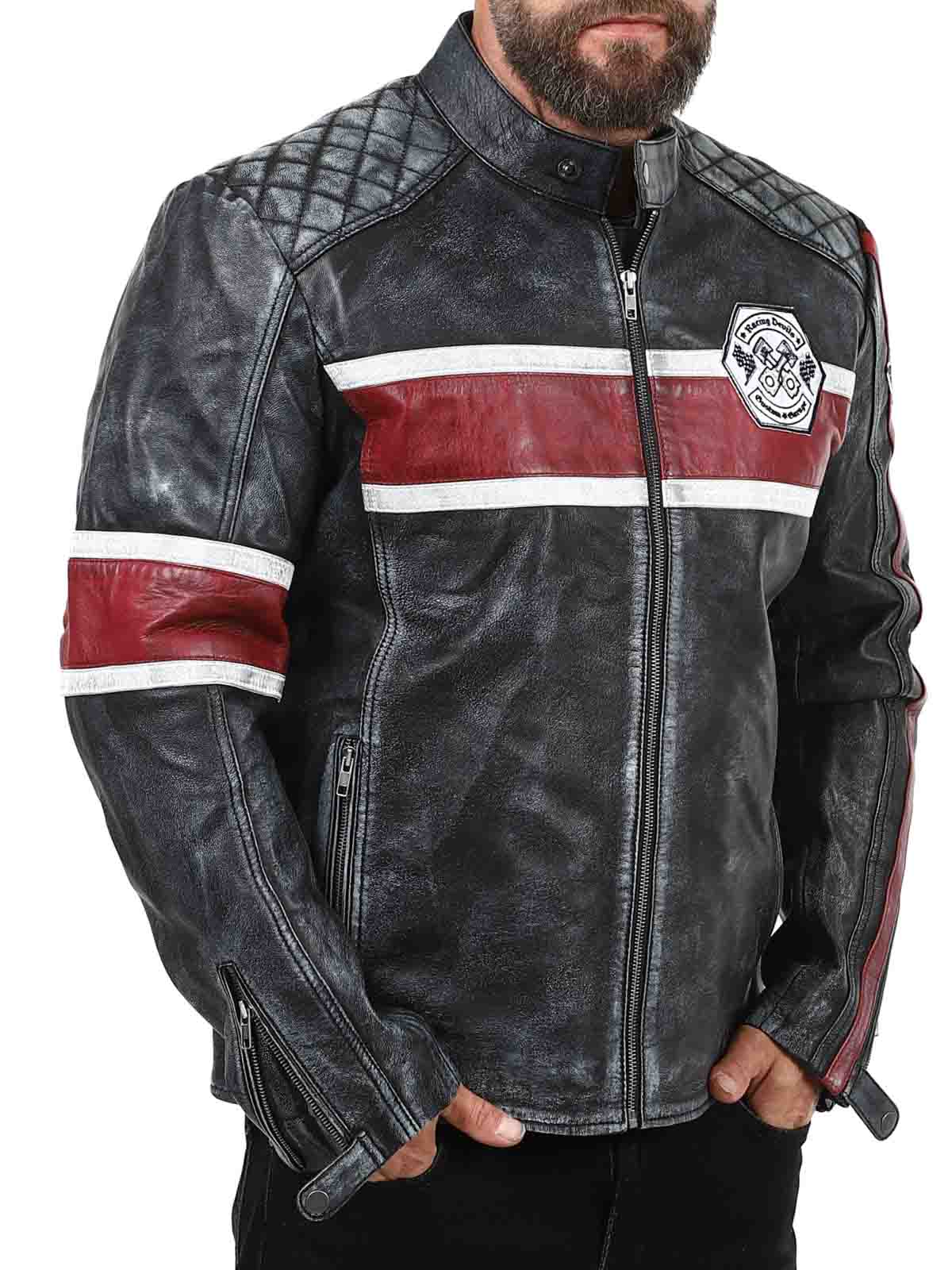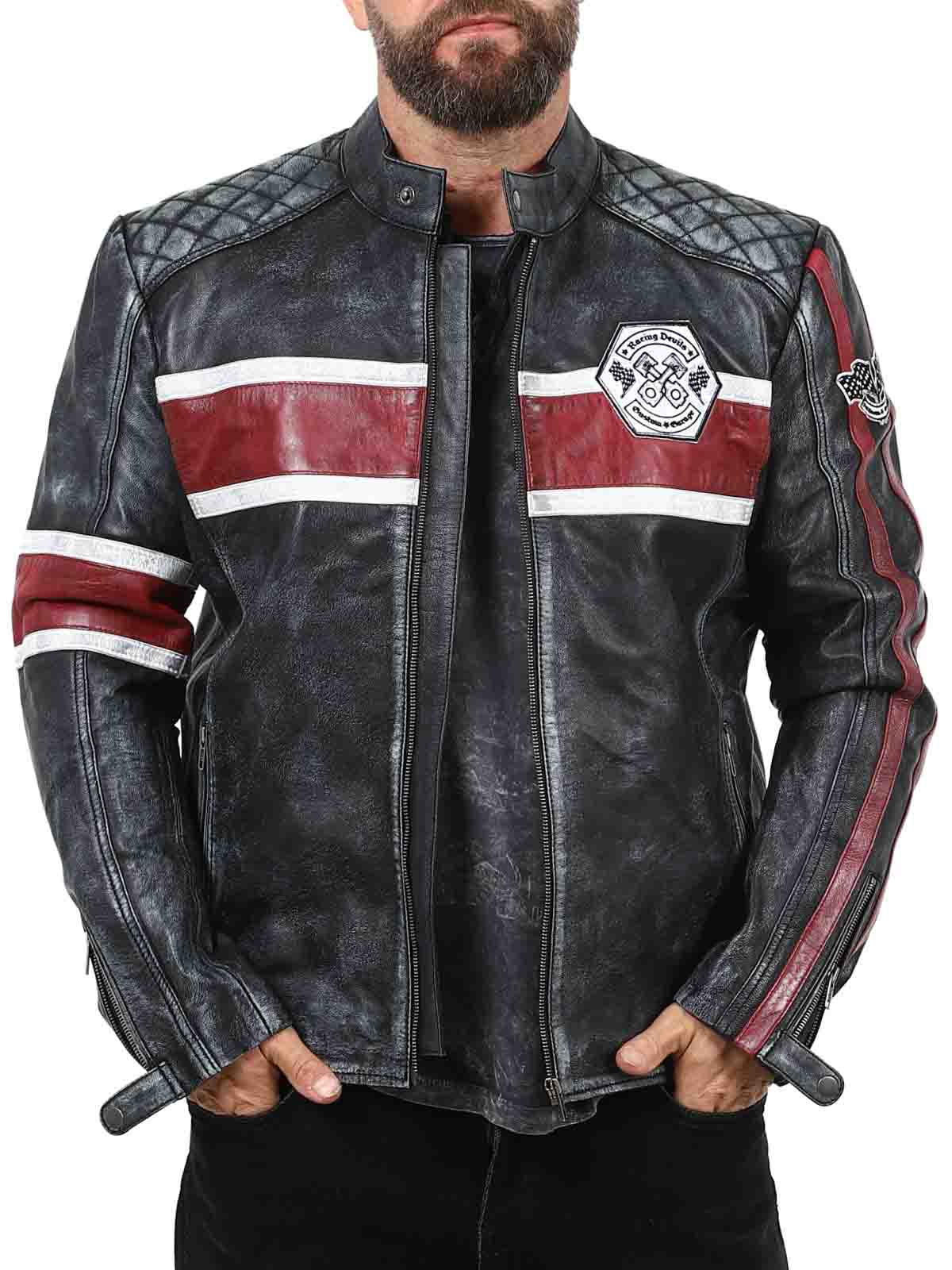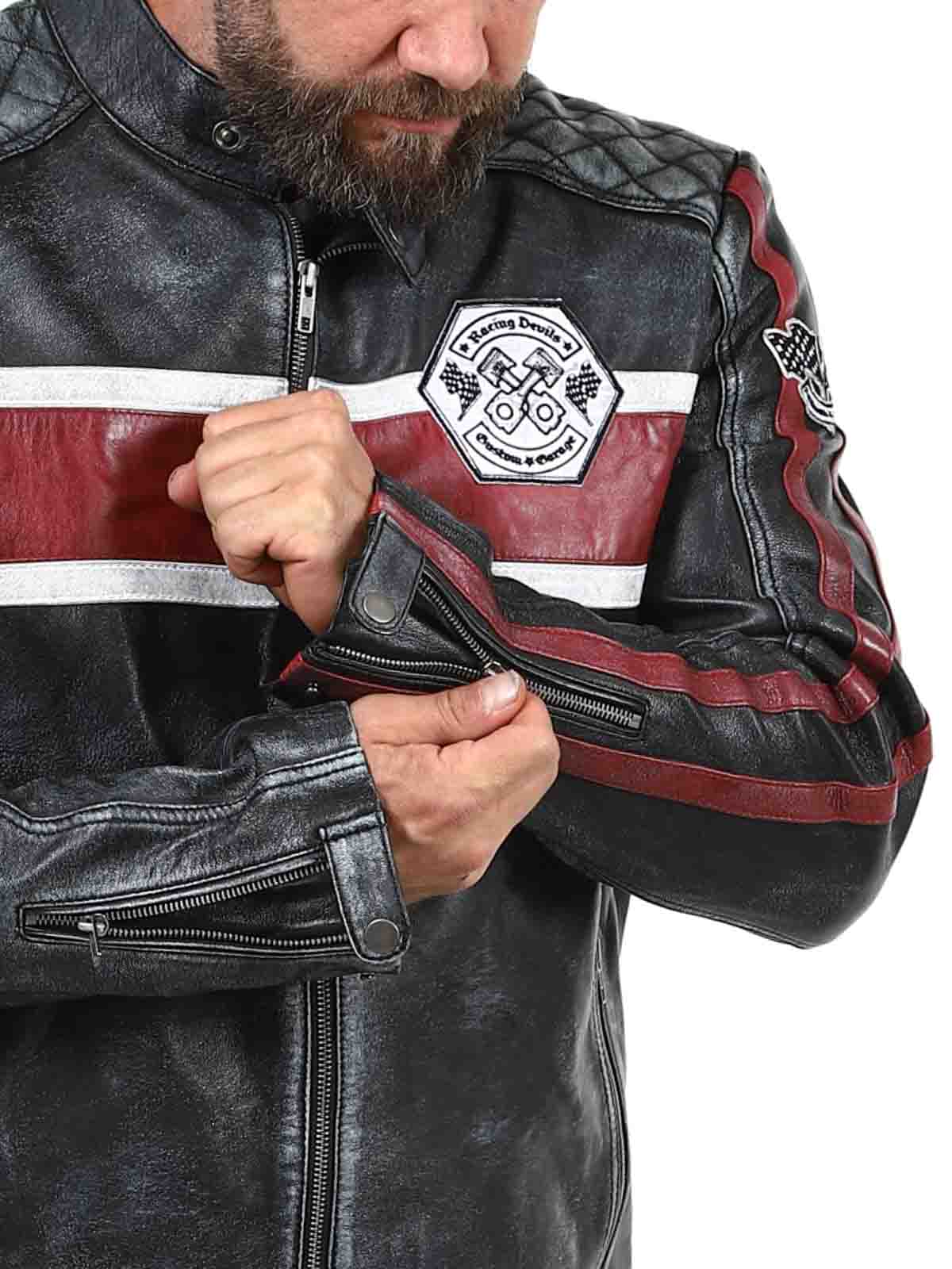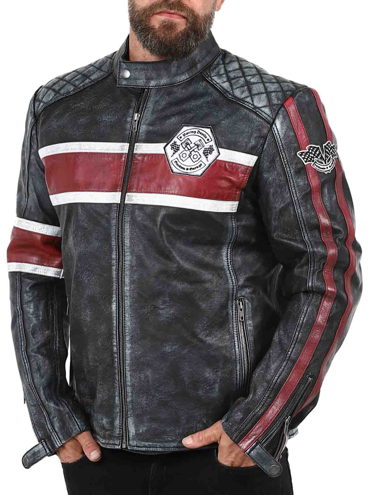 Denne ekte saueskinnjakken har et rått, vintageinspirert utseende som fanger blikket. De karakteristiske røde og hvite stripene gir en sporty følelse, mens den slitte finishen fremhever jakkens karakter. Med detaljer som stofflapper, solide glidelåser og forsterkede partier er dette den perfekte jakken for deg som vil kombinere klassisk bikerstil med en cool twist!