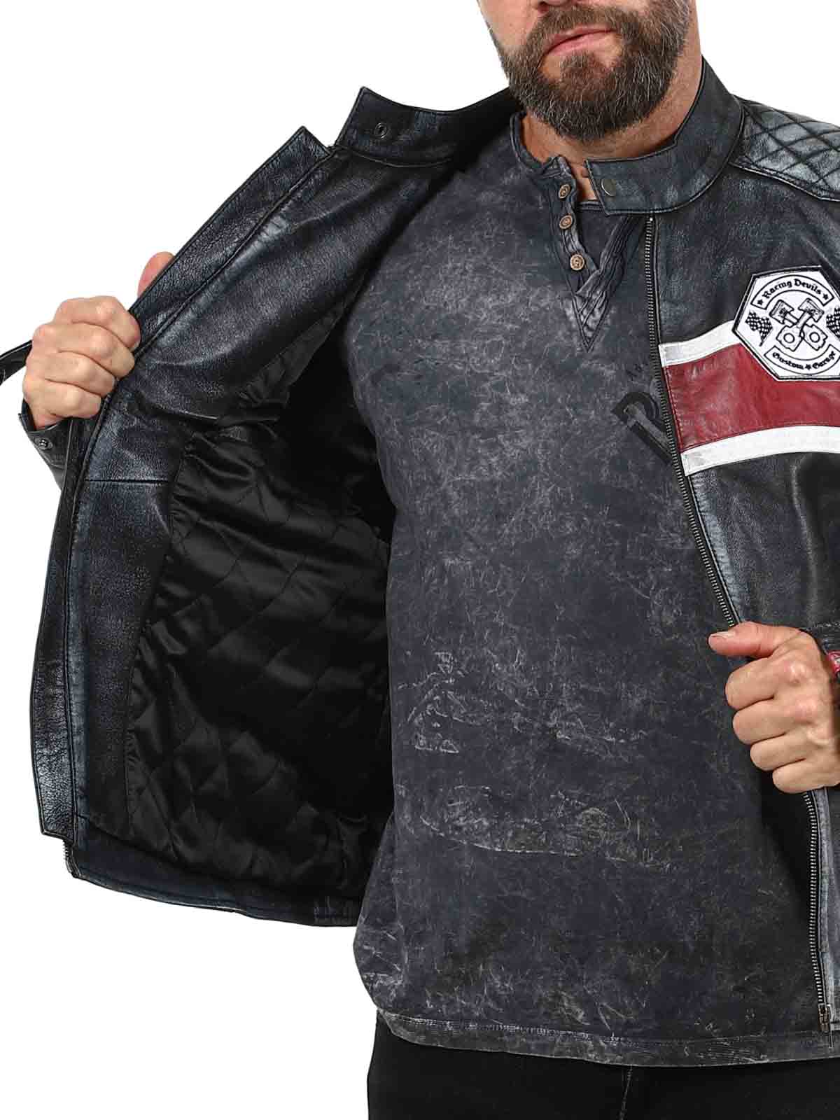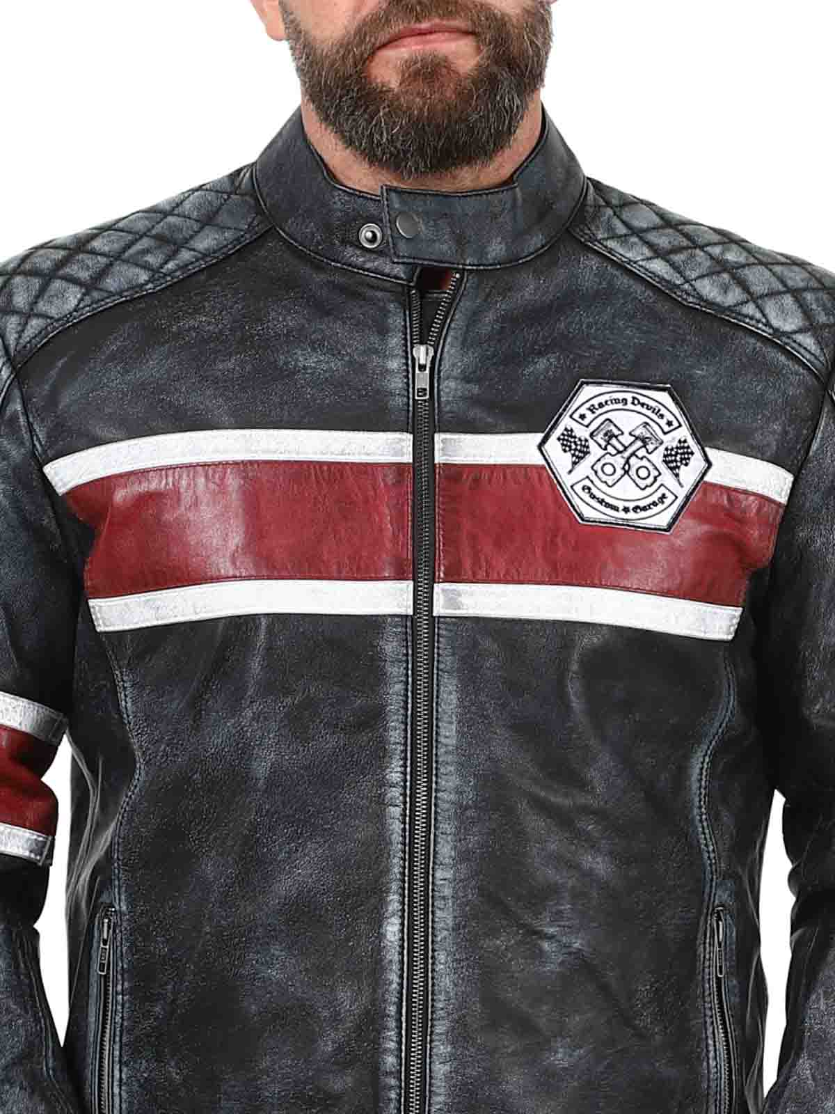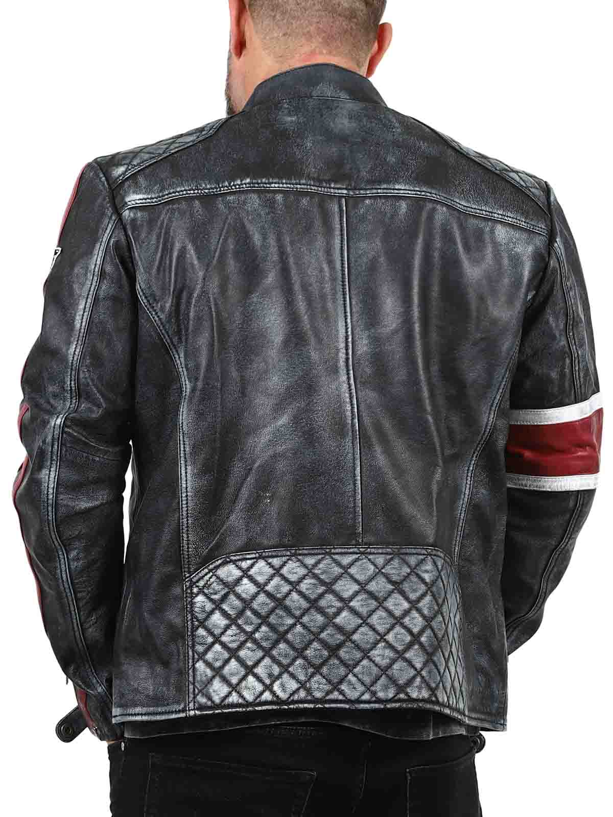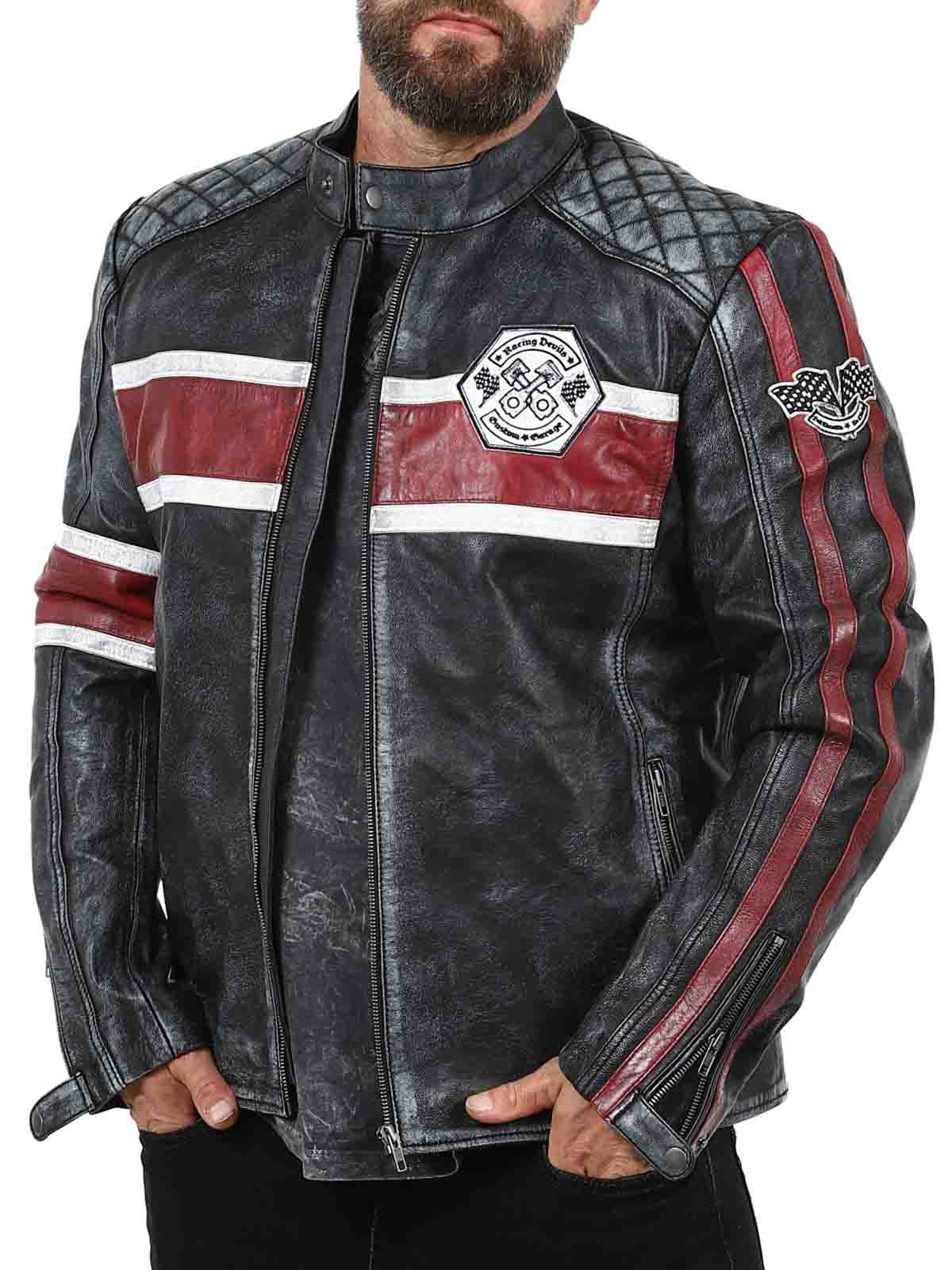 Denne ekte saueskinnjakken har et rått, vintageinspirert utseende som fanger blikket. De karakteristiske røde og hvite stripene gir en sporty følelse, mens den slitte finishen fremhever jakkens karakter. Med detaljer som stofflapper, solide glidelåser og forsterkede partier er dette den perfekte jakken for deg som vil kombinere klassisk bikerstil med en cool twist!