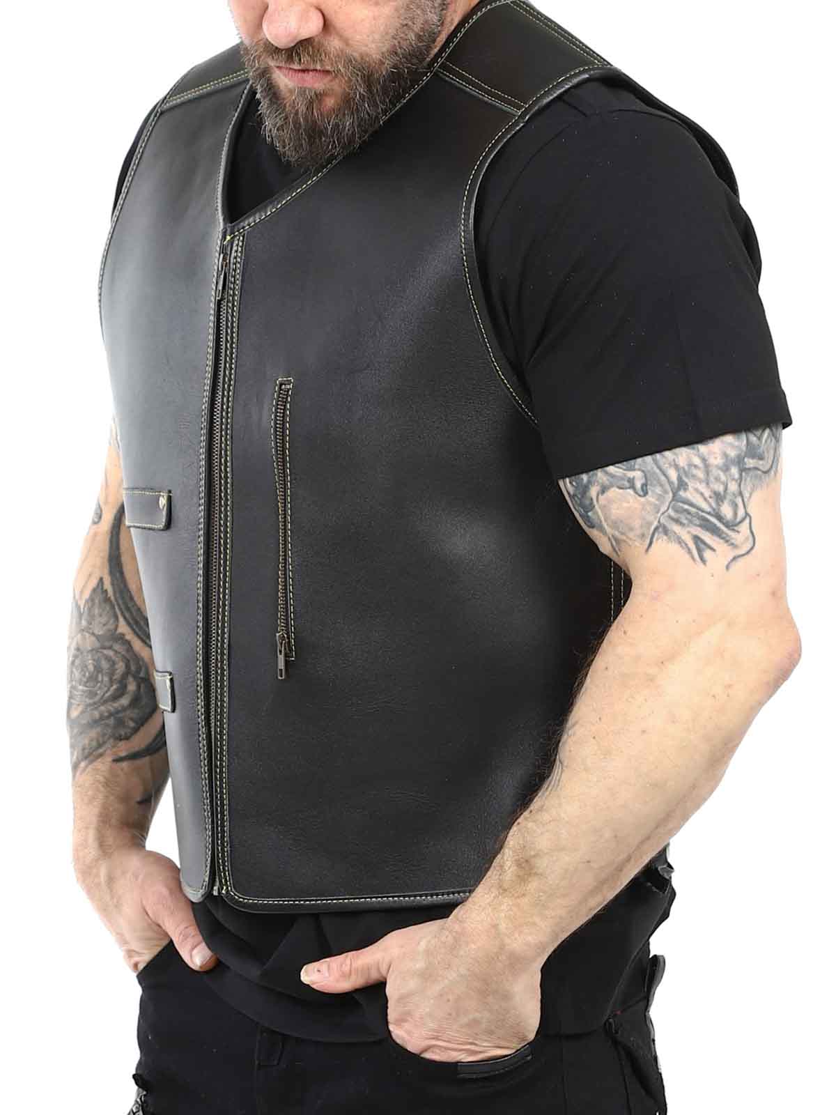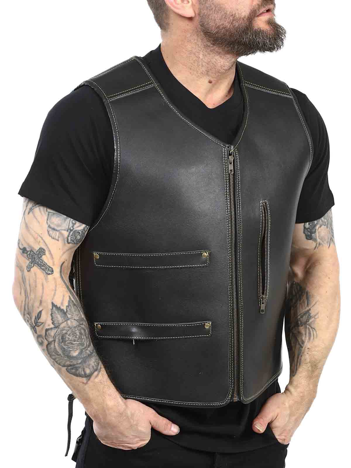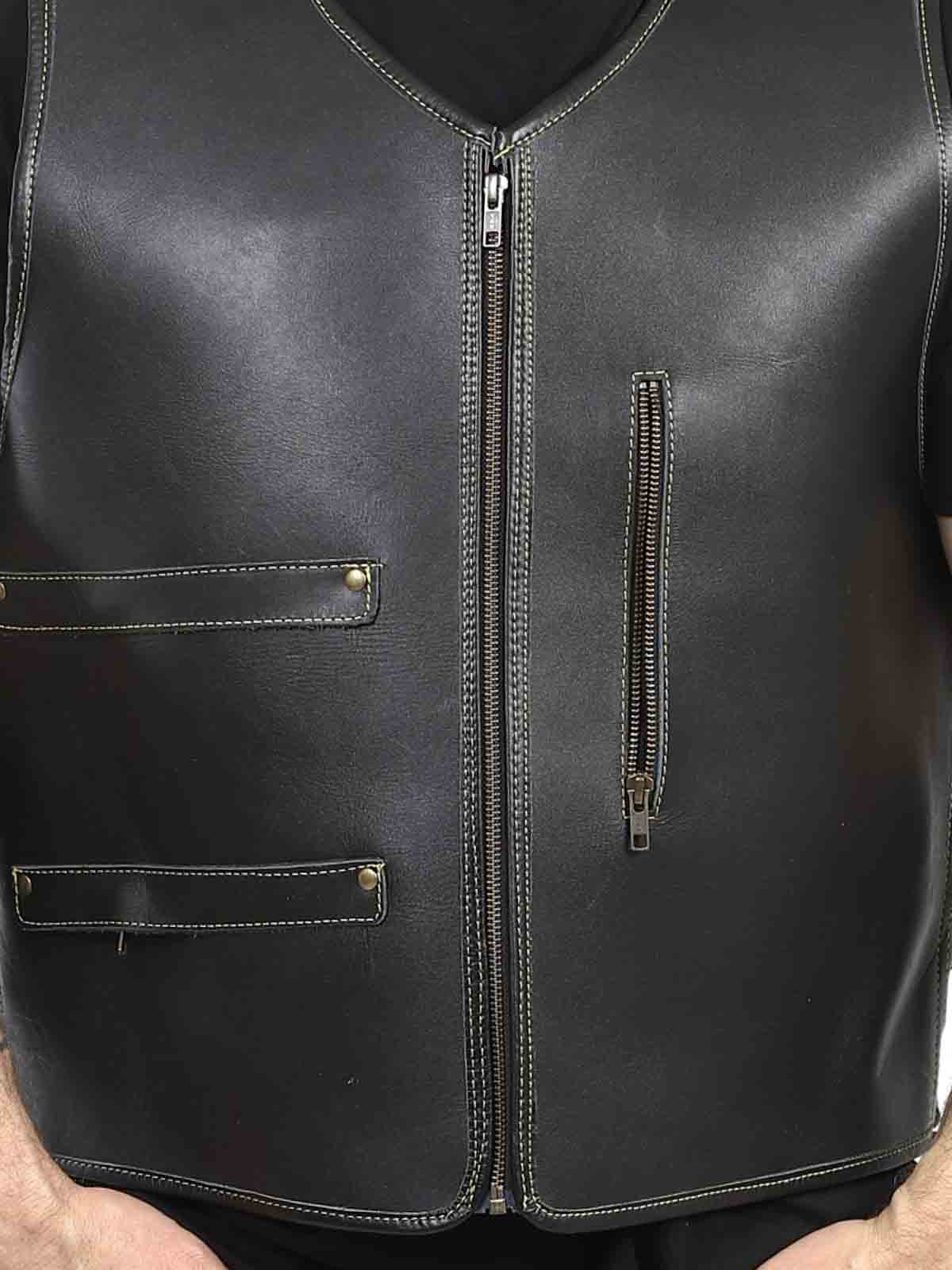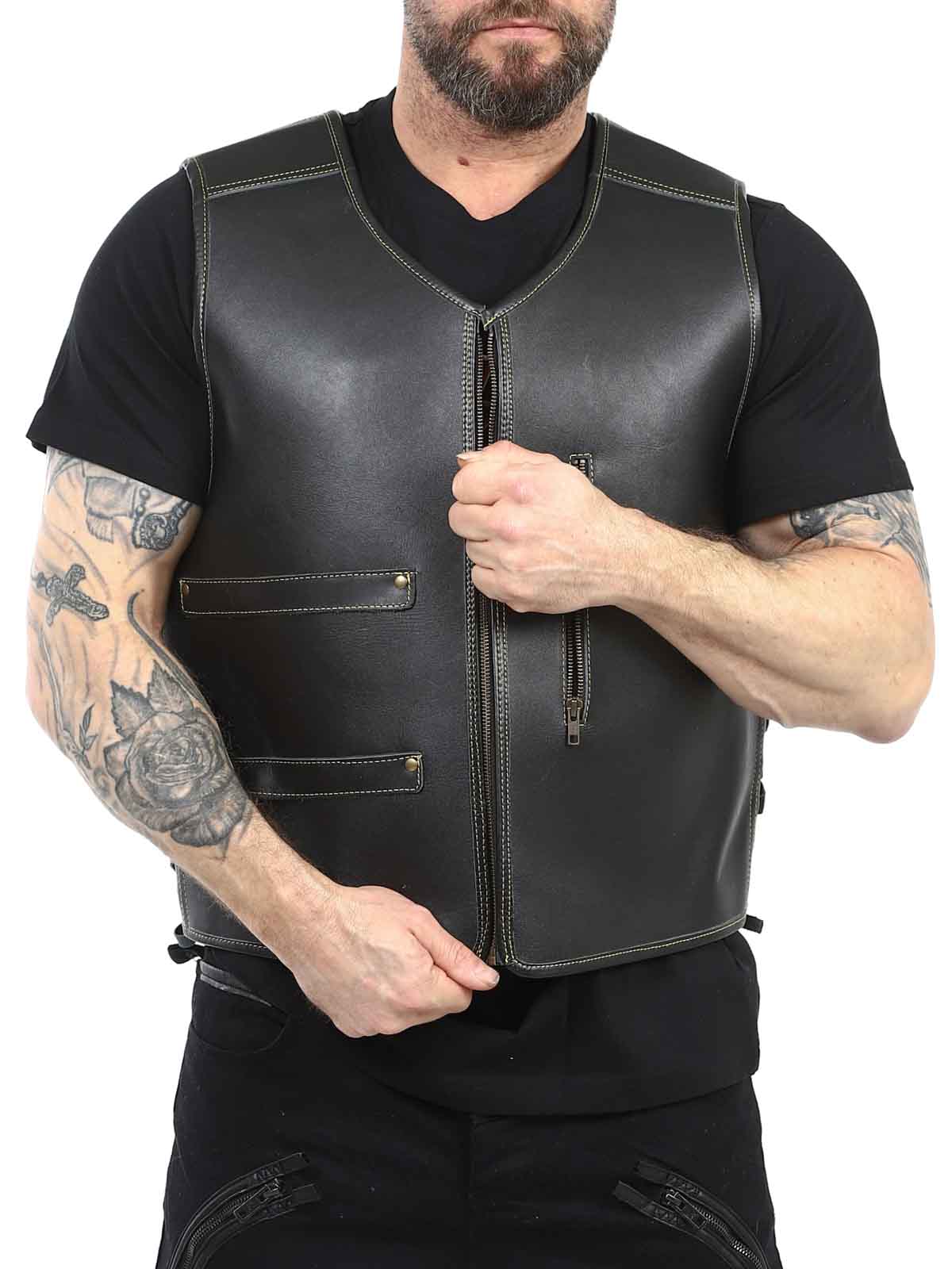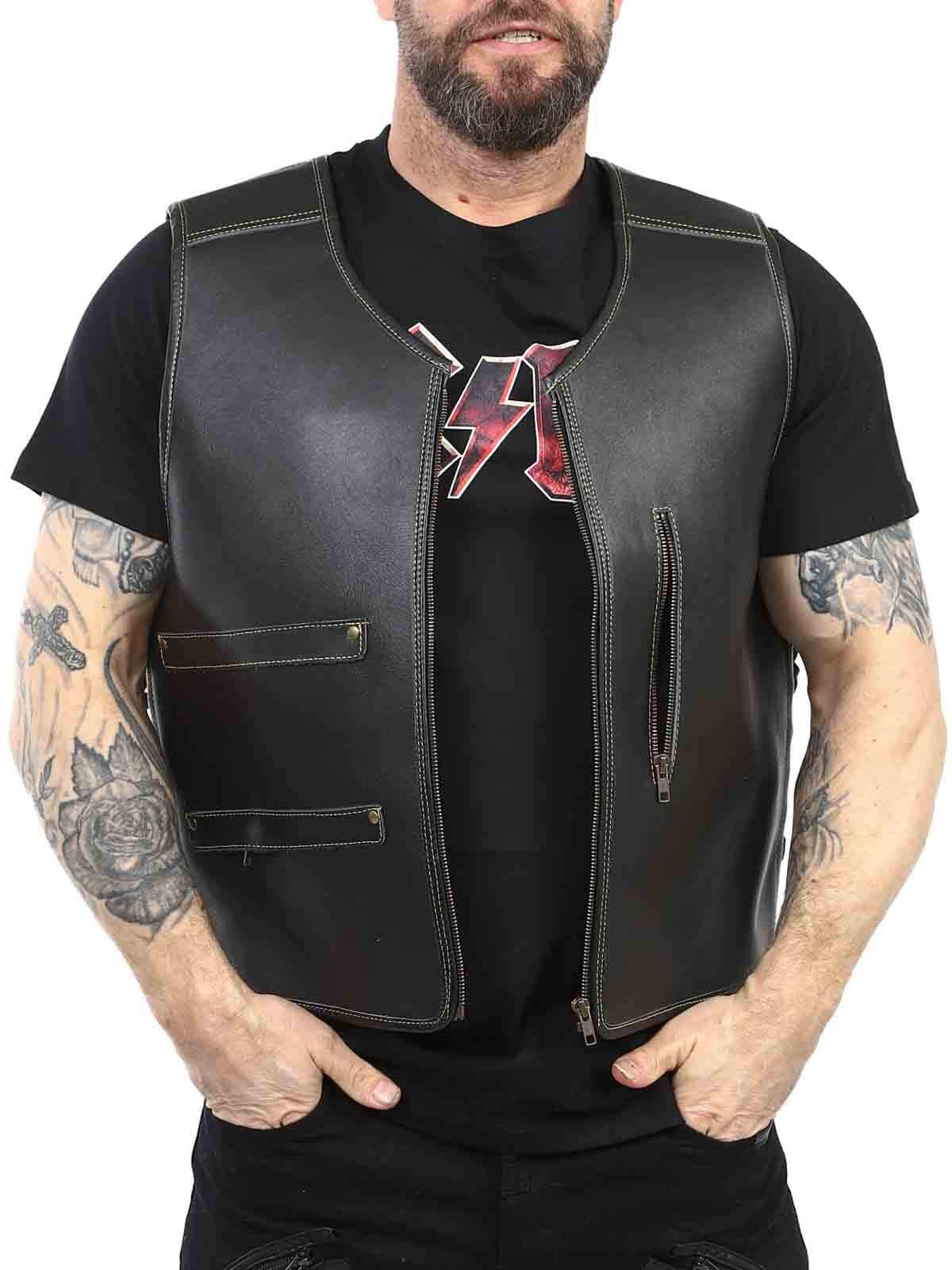 Robust vest i bøffellær med karakteristiske sømmer. Den har tre lommer foran og tre innerlommer, alle med glidelås for sikker oppbevaring. Knytbånd i siden gir en justerbar passform og en stilig touch. Med sin slitesterke design og detaljer av høy kvalitet passer vesten like godt på veien som til deg som ønsker å tilføre garderoben et skikkelig statement-plagg!