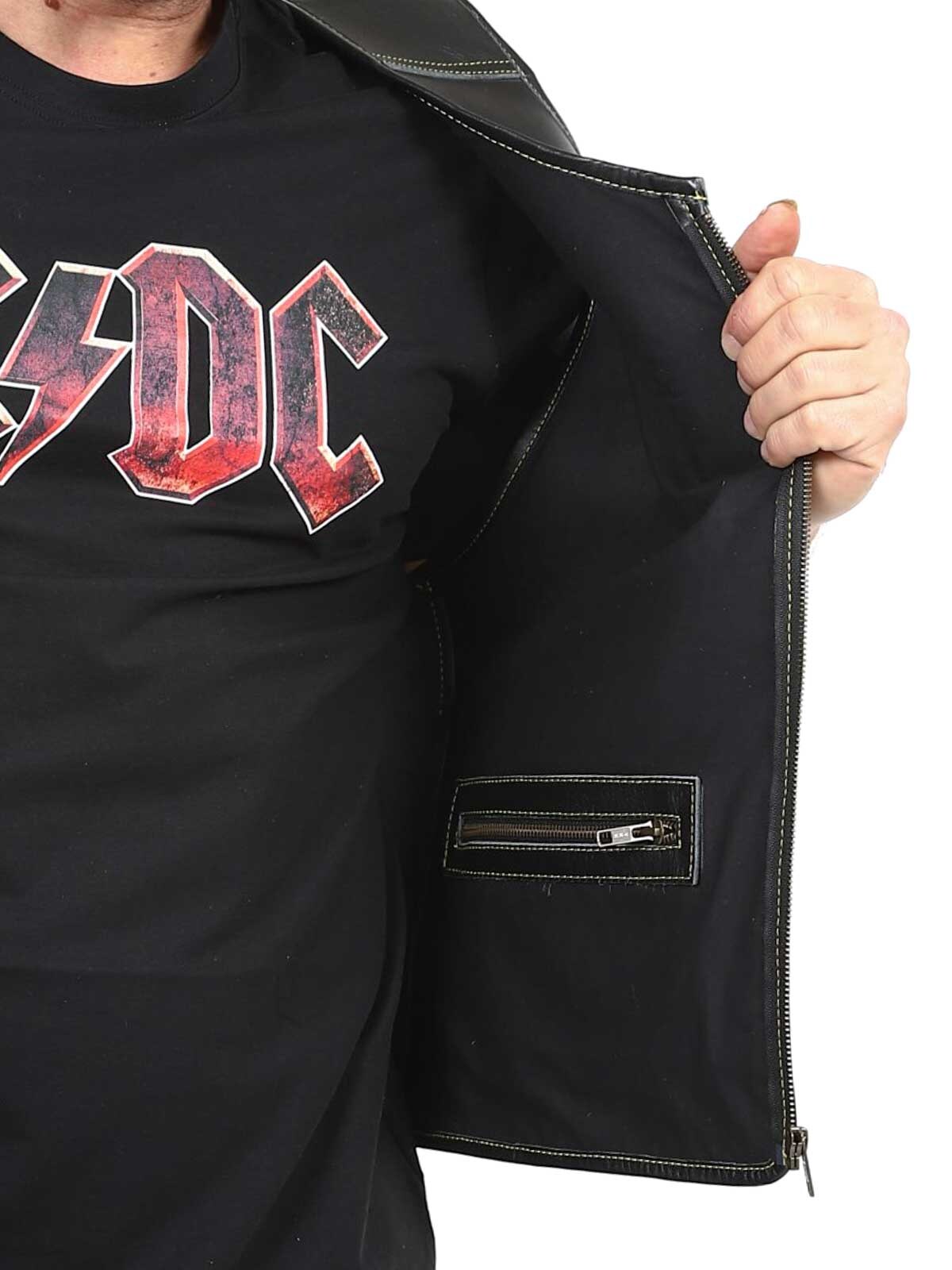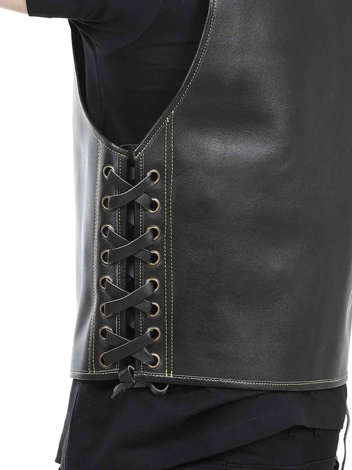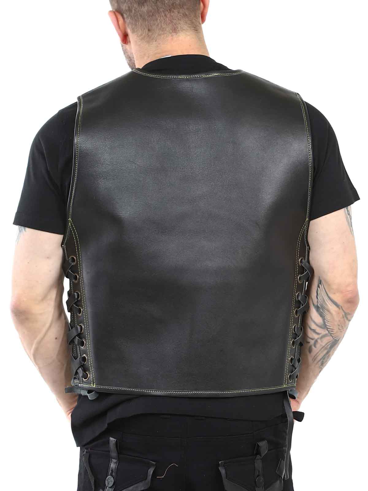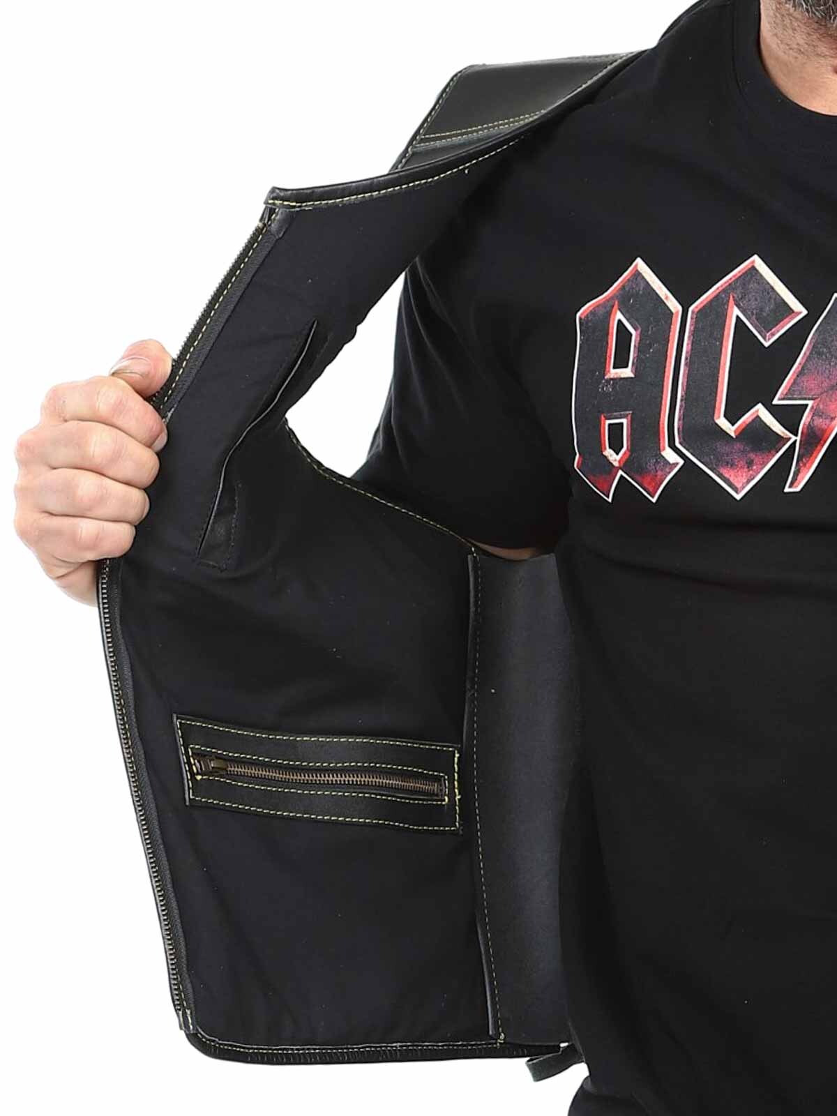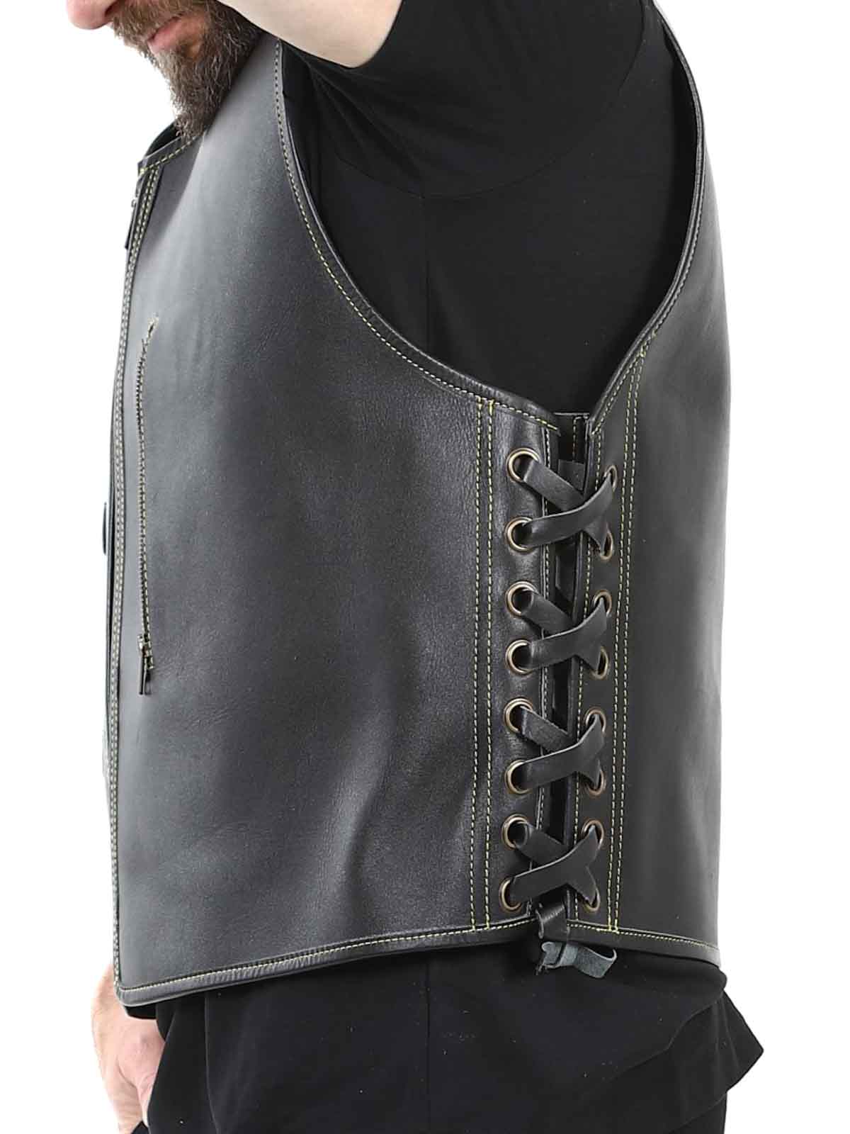 Robust vest i bøffellær med karakteristiske sømmer. Den har tre lommer foran og tre innerlommer, alle med glidelås for sikker oppbevaring. Knytbånd i siden gir en justerbar passform og en stilig touch. Med sin slitesterke design og detaljer av høy kvalitet passer vesten like godt på veien som til deg som ønsker å tilføre garderoben et skikkelig statement-plagg!