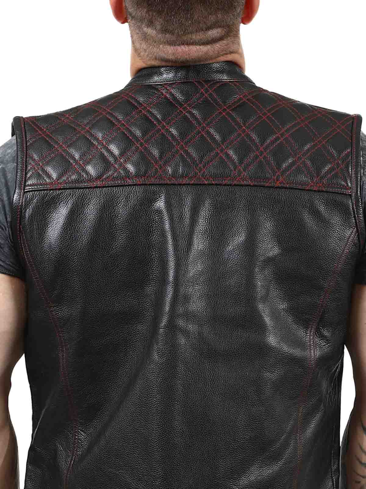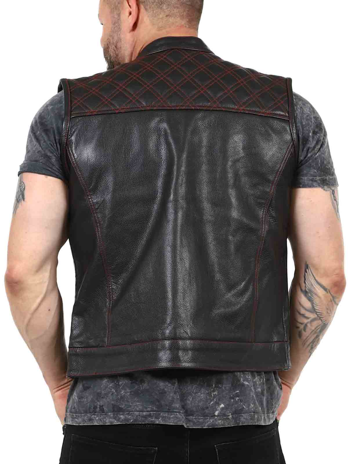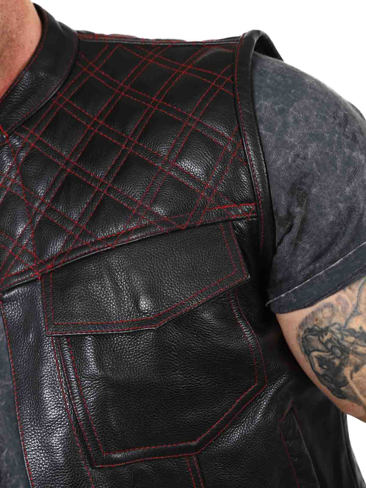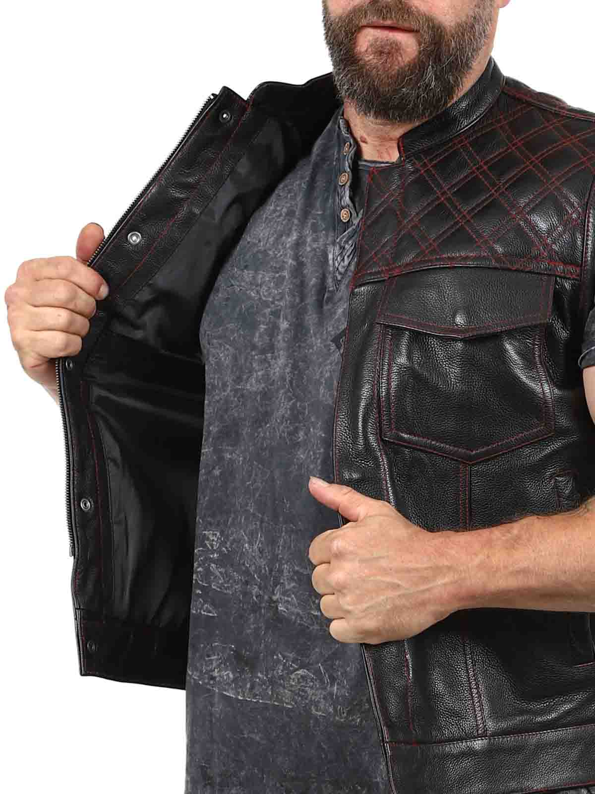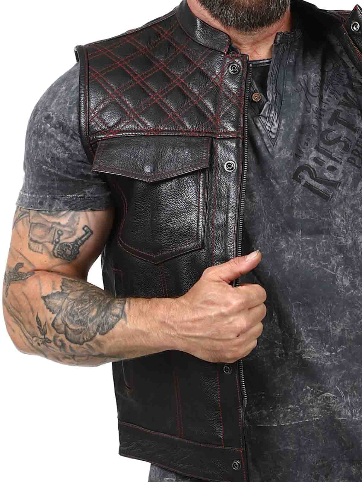 Chunky skinnvest i ekte skinn med lav krage. Det er to lukkbare brystlommer, to åpne magelommer og to åpne innerlommer. Vesten lukkes med både glidelås og knapper. Denne vesten finner du kun hos Rockdenim!