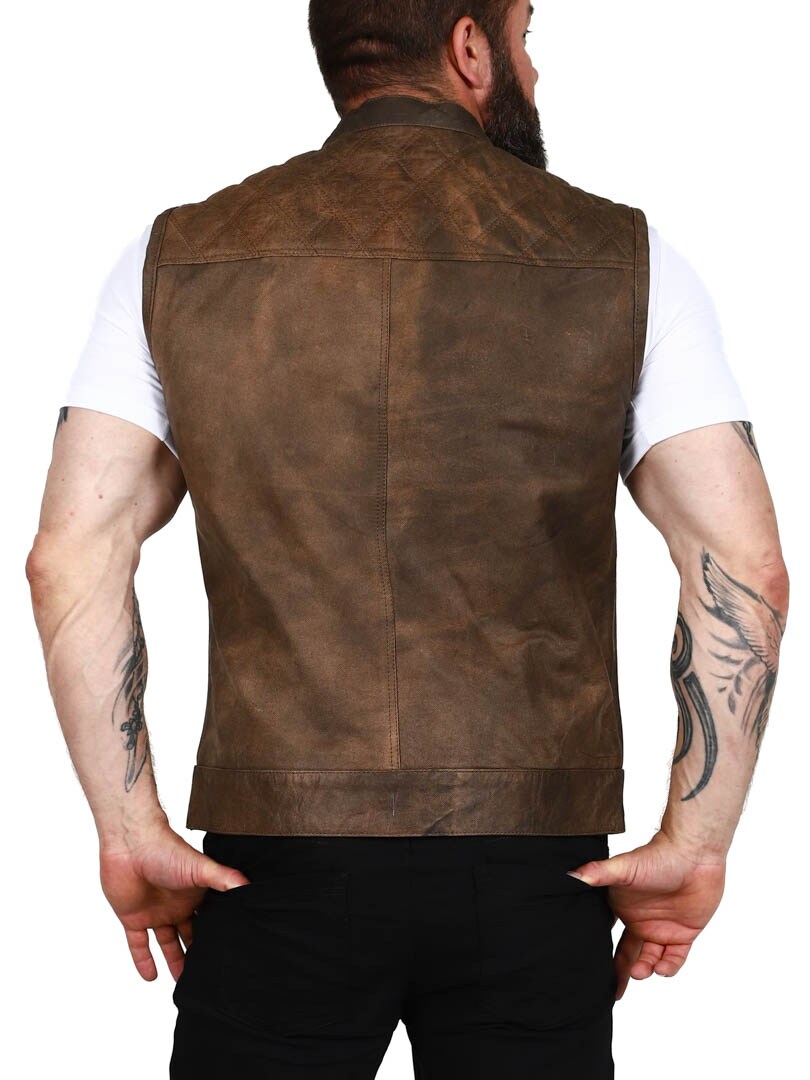 Chunky skinnvest i ekte skinn med lav krage. Det er to lukkbare brystlommer, to åpne magelommer og to åpne innerlommer. Vesten lukkes med både glidelås og knapper. Denne vesten finner du kun hos Rockdenim!