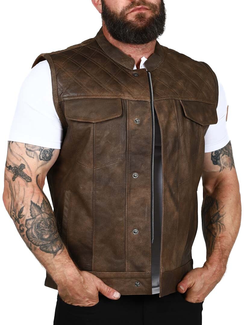 Chunky skinnvest i ekte skinn med lav krage. Det er to lukkbare brystlommer, to åpne magelommer og to åpne innerlommer. Vesten lukkes med både glidelås og knapper. Denne vesten finner du kun hos Rockdenim!