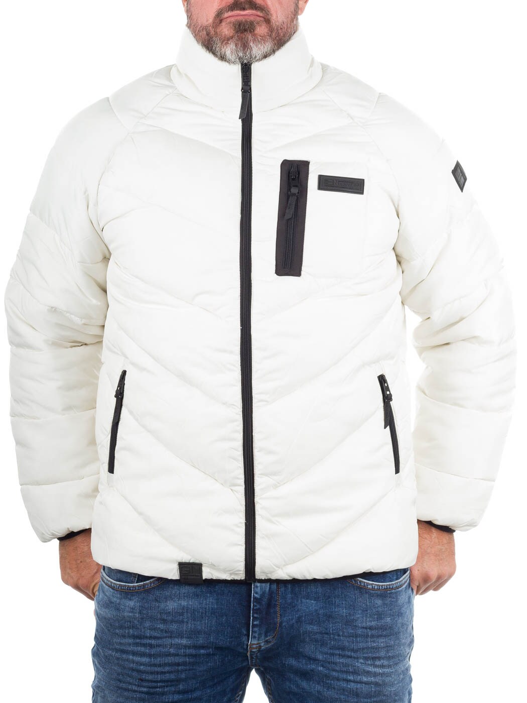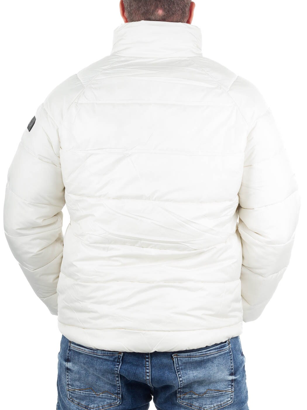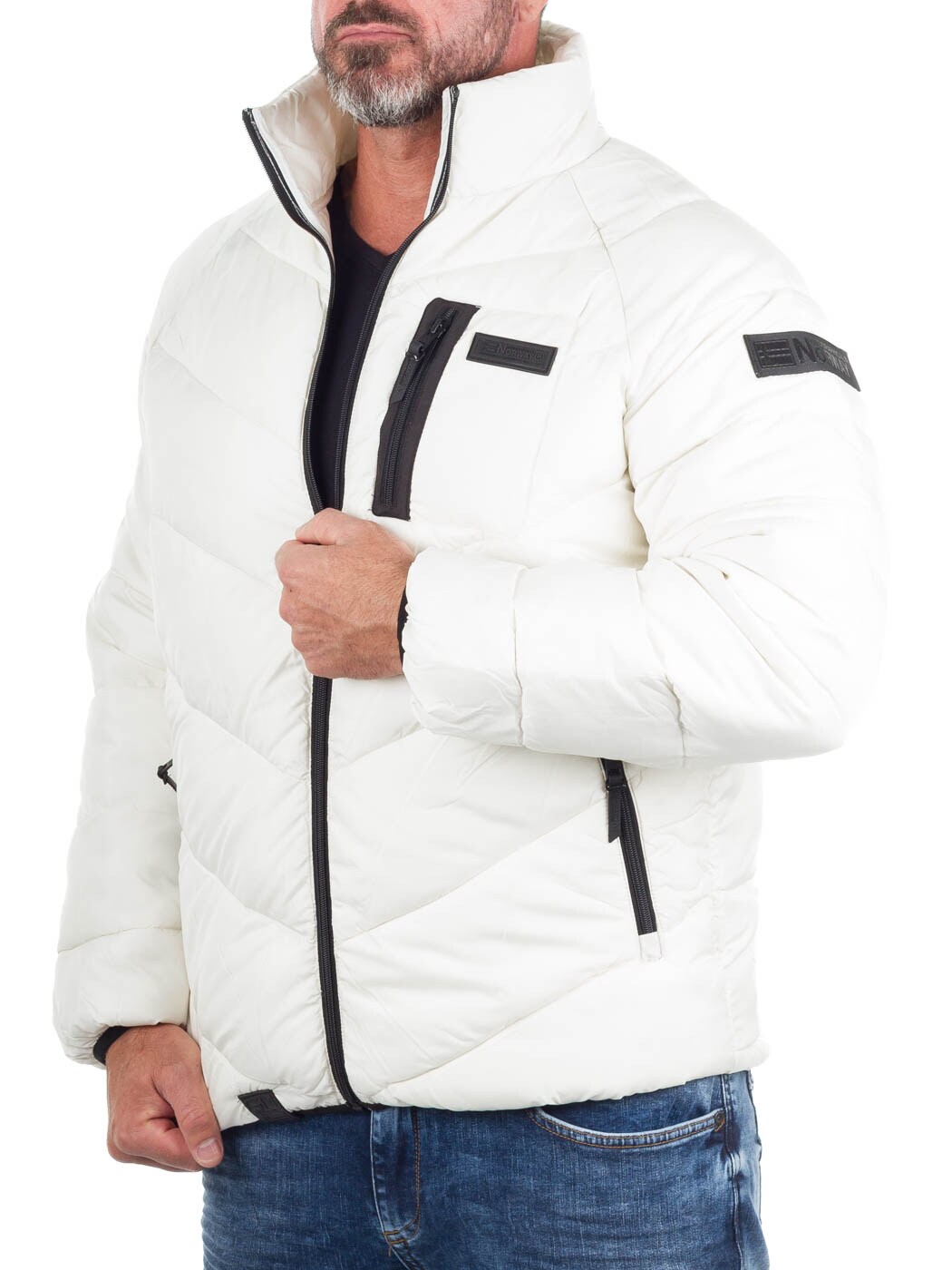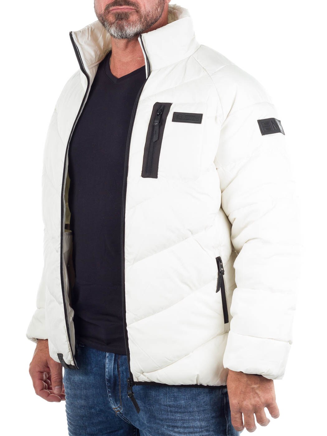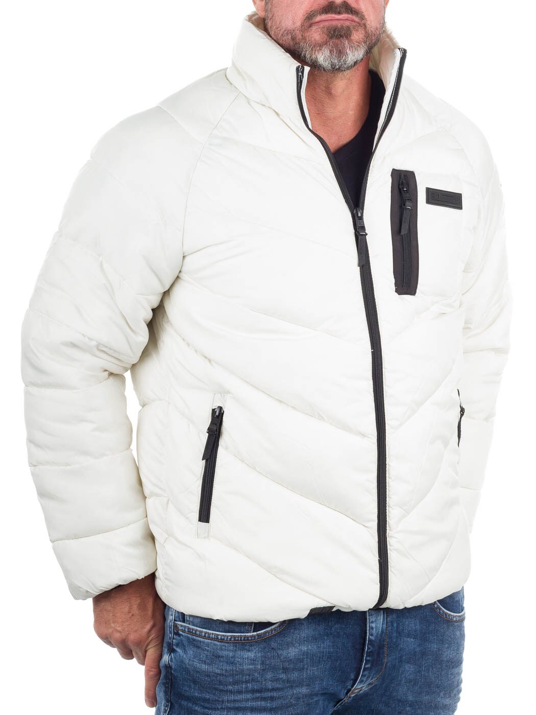 Vattert jakke i hvitt med svarte kontrastdetaljer. Lett og komfortabel, samtidig som den gir god varme på kjølige dager. Designet har høy krage, glidelåslukking og flere praktiske lommer med glidelås.