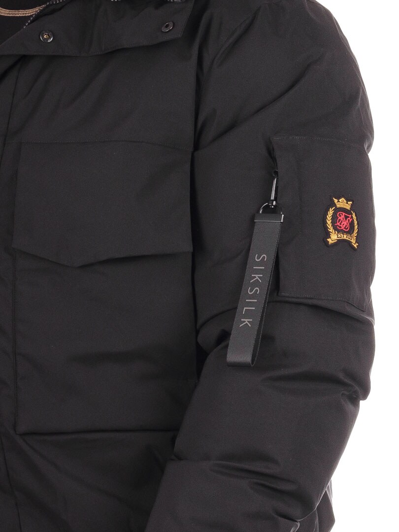 Oppgrader vinterstilen din med denne stilrene, svarte vinterjakken som kombinerer varme, funksjon og moderne design. Den høye kragen og den romslige hetten gir maksimal beskyttelse mot vind og kulde. Brodert logodetalj på hetten gir jakken et kraftfullt og moderne uttrykk. På ermet sitter et brodert emblem som forsterker den eksklusive følelsen. Med to frontlommer, en innerlomme og en ermelomme får du rikelig med oppbevaringsplass uten å gå på kompromiss med det stilrene designet.