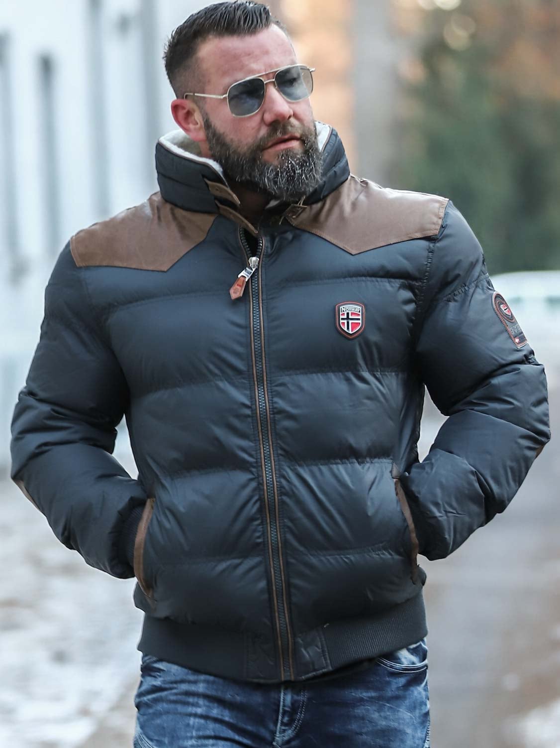 Jakken har en maskulin passform i stilige farger med imiterte skinndetaljer på skuldre og albuer. To lommer i midjen og to på innsiden. Med denne jakken holder du garantert både stil og varme i vinter!
