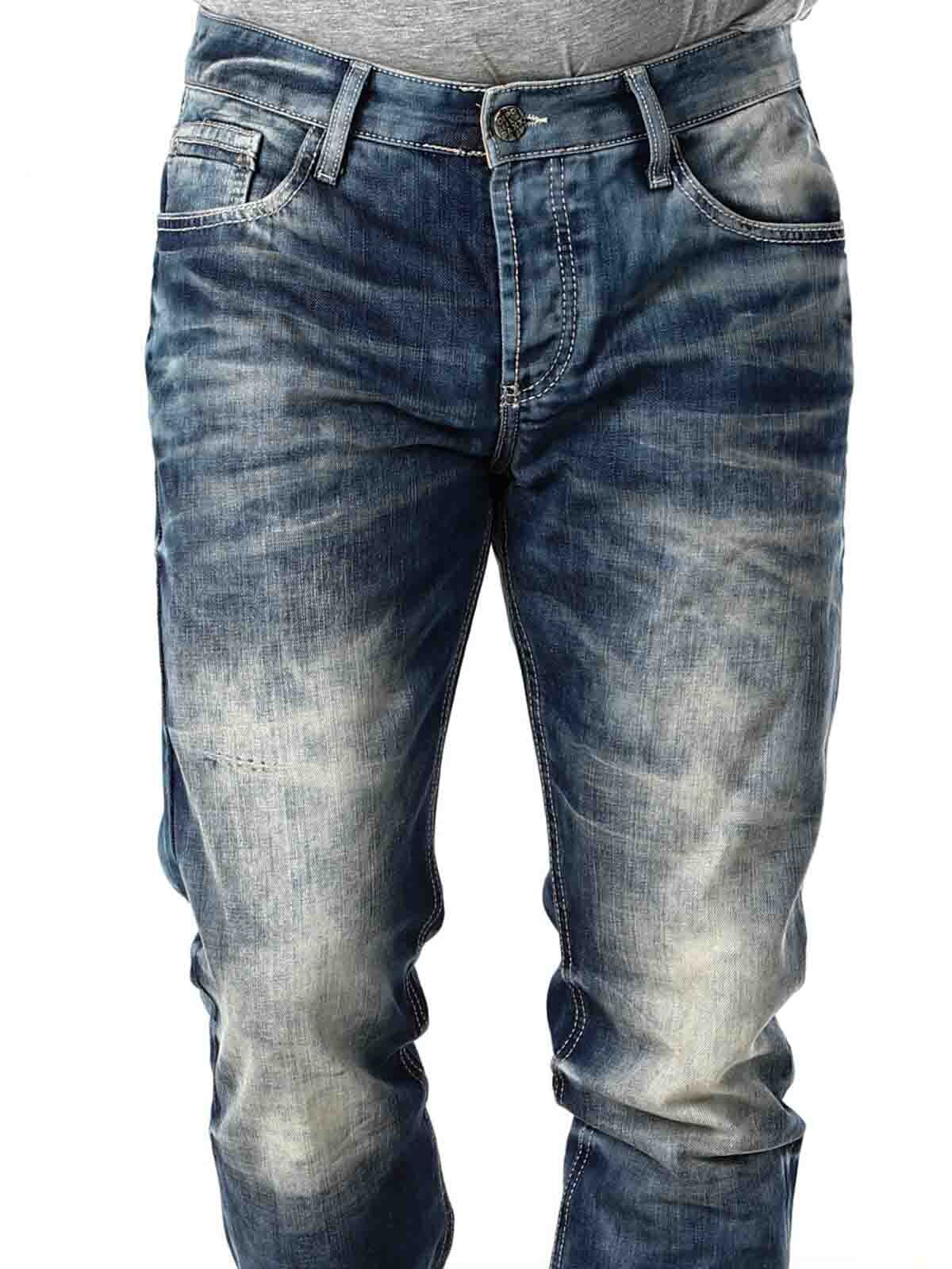 Blå jeans med steinvasket design. De har beltehemper i midjen, fem lommer samt en ekstra liten lomme med knapp på den ene baklommen. Detaljert med sømmer i kontrastfarge.