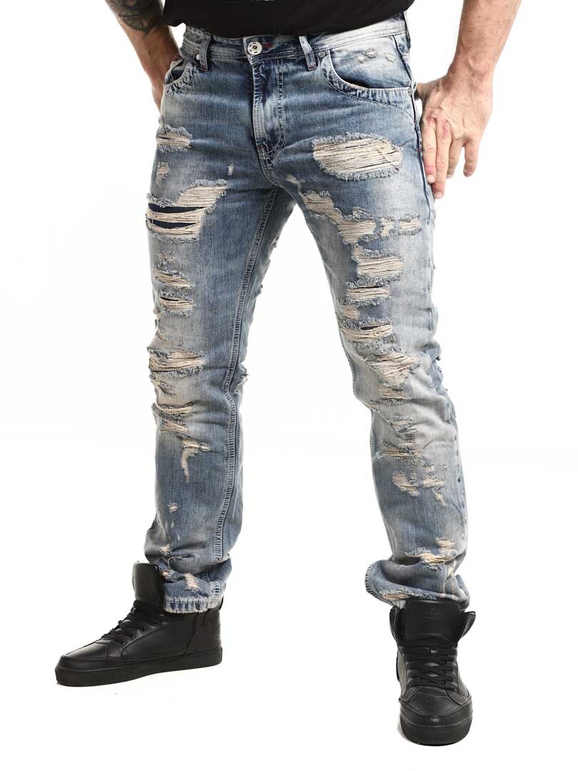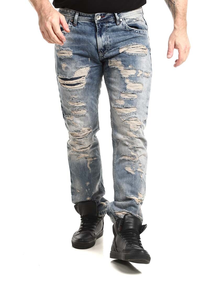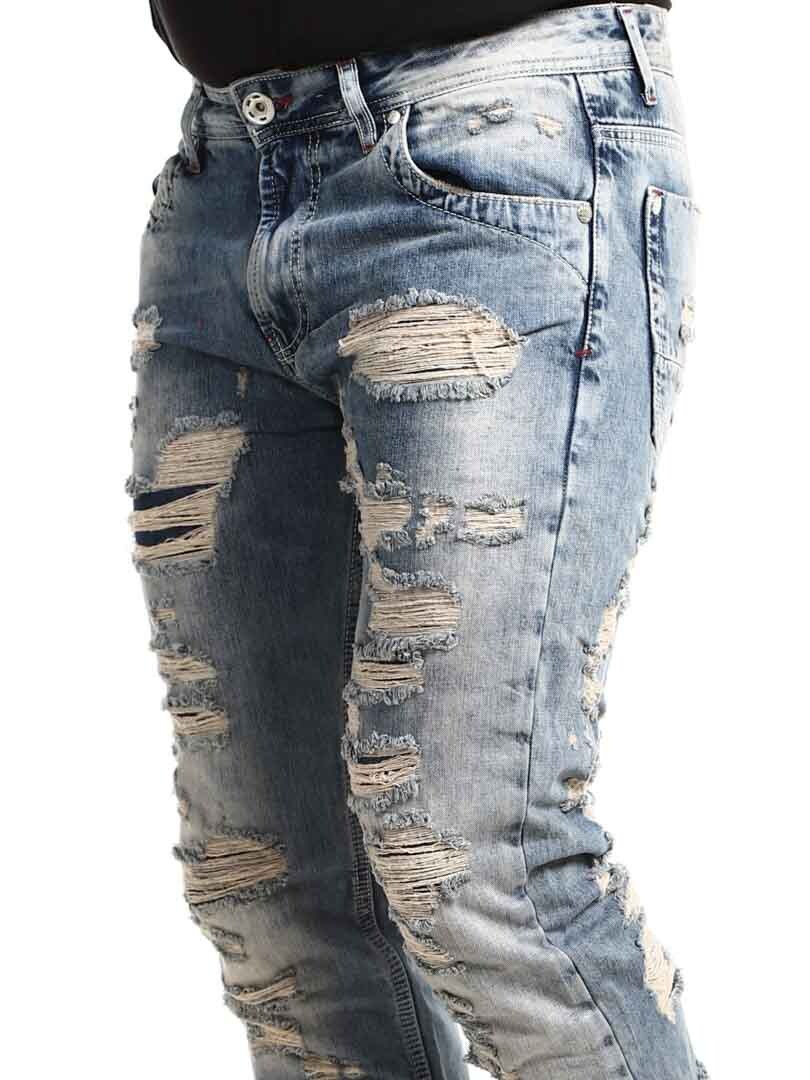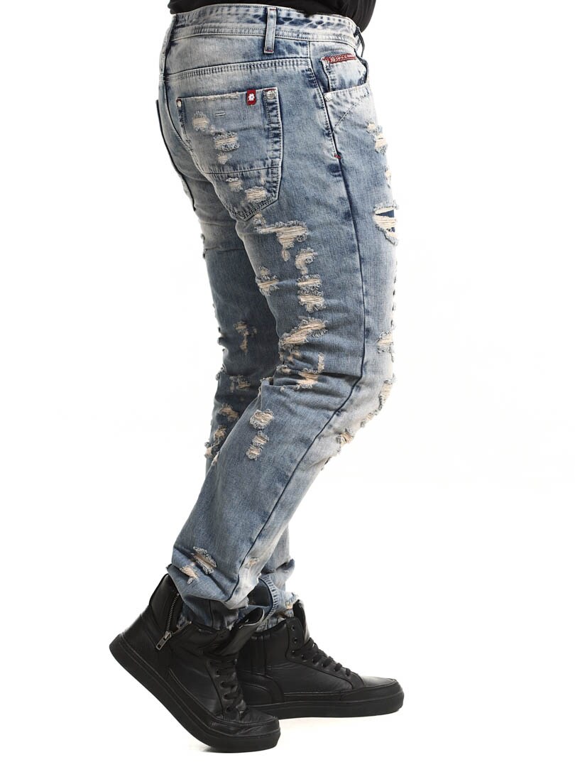 Tøffe jeans med detaljer med mye slitasje både foran og bak. De har fem lommer, beltehemper i midjen og kontrastsøm. Laget av 100% bomull.