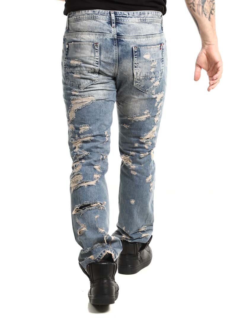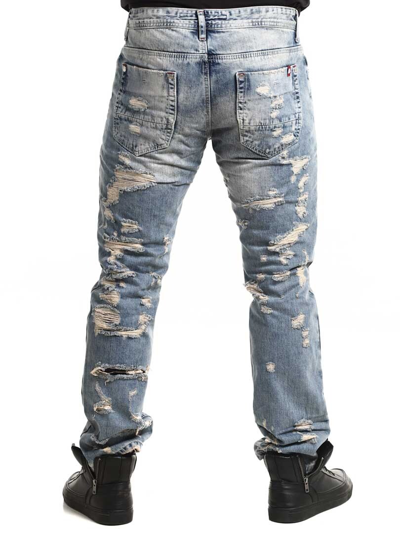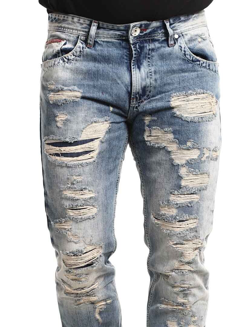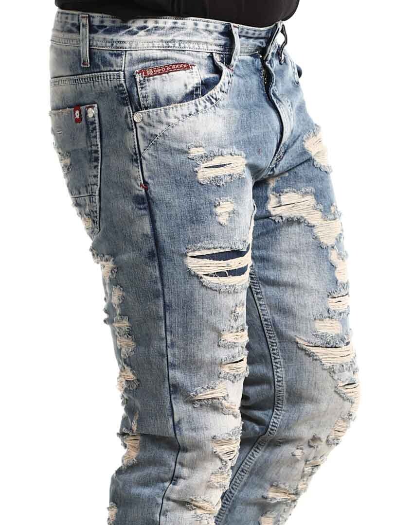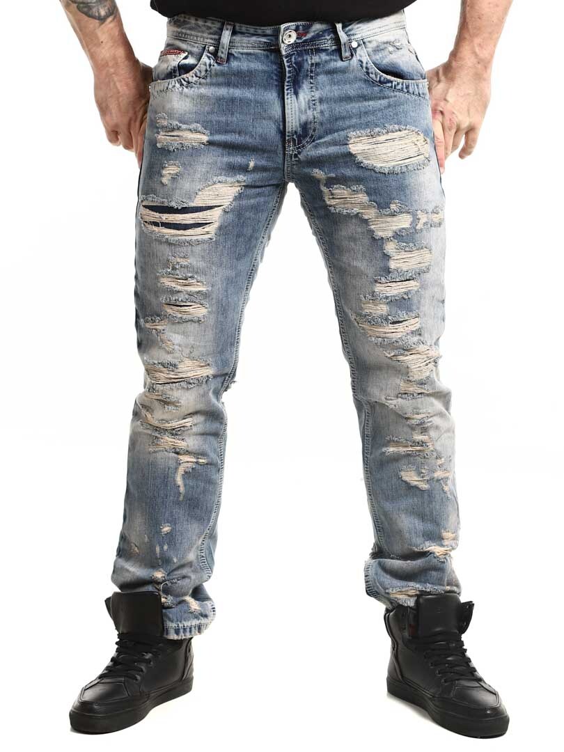 Tøffe jeans med detaljer med mye slitasje både foran og bak. De har fem lommer, beltehemper i midjen og kontrastsøm. Laget av 100% bomull.