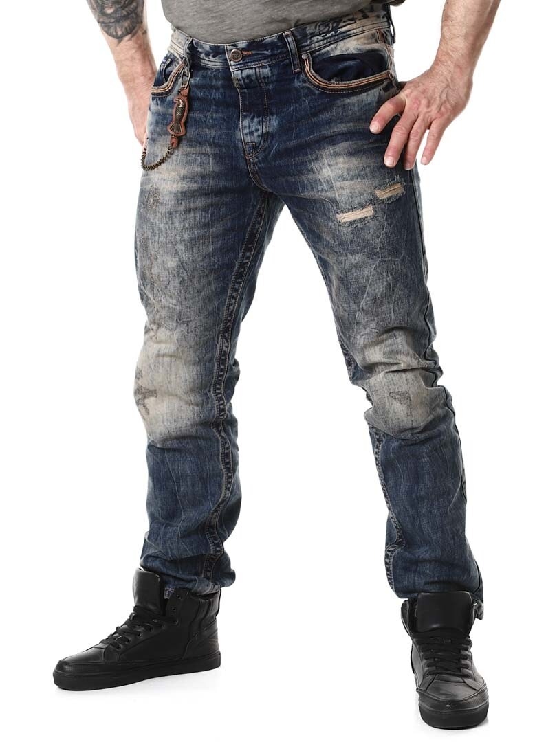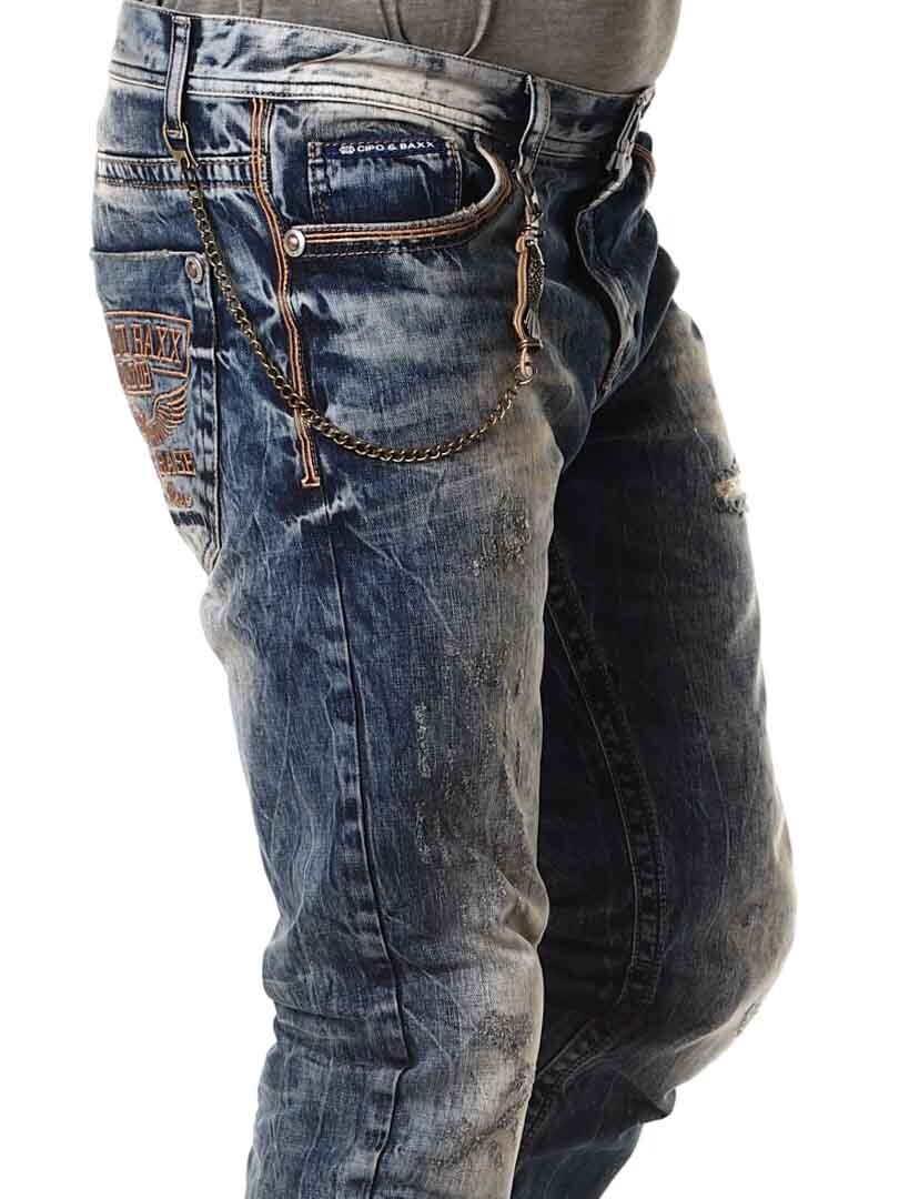 Jeans i klassisk modell med fem lommer og beltehemper i midjen. Tøft designet med rifter, avtagbar kjede og skreddersydd trykk.