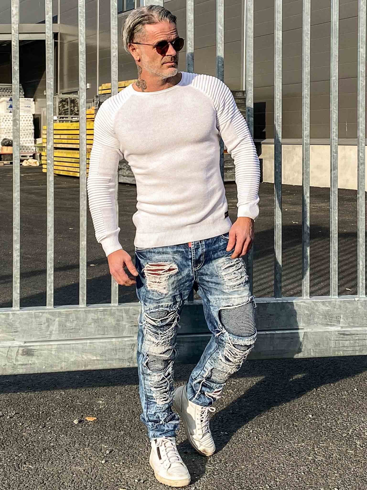 Tøffe jeans i steinvasket denim med røffe rifter og detaljer i rødt. De har ribbet stoff i sømmene for en unik effekt. Klassisk passform med tre frontlommer og to baklommer.