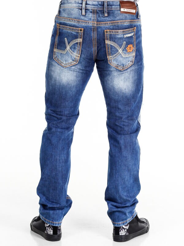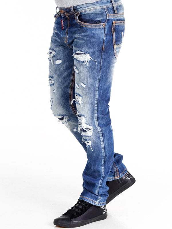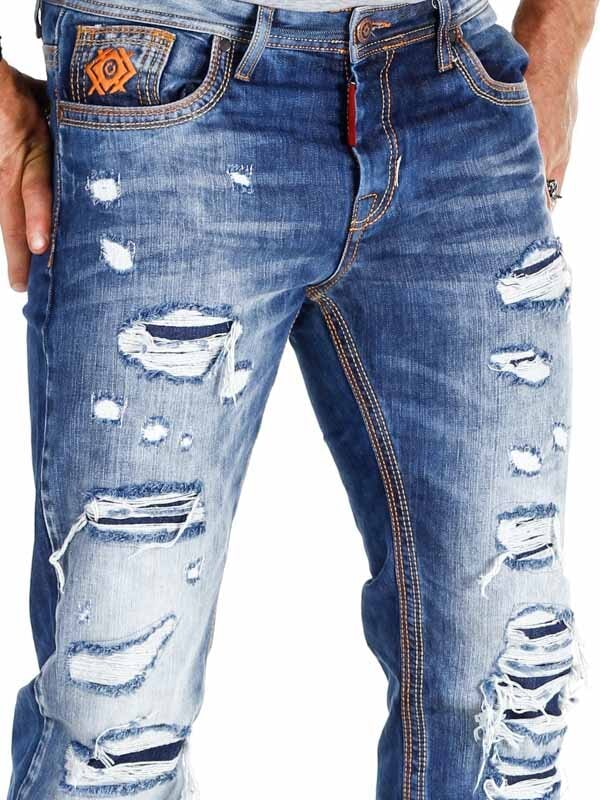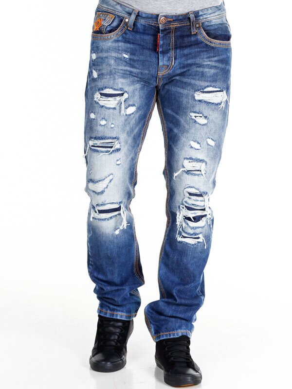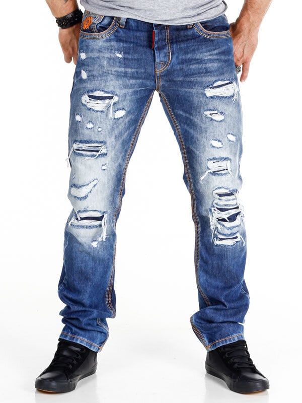Bukser i steinvasket denim med rå slitasje foran. 5-lomme-modell med grove sømmer og skreddersydde detaljer i kontrastfarger. Laget av slitesterk bomull.