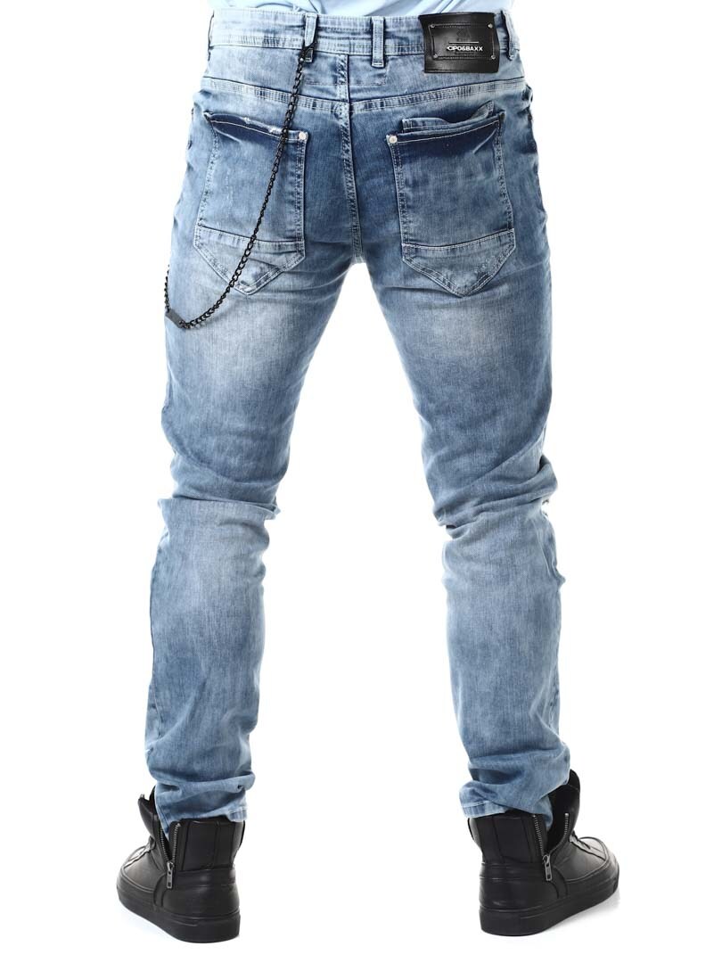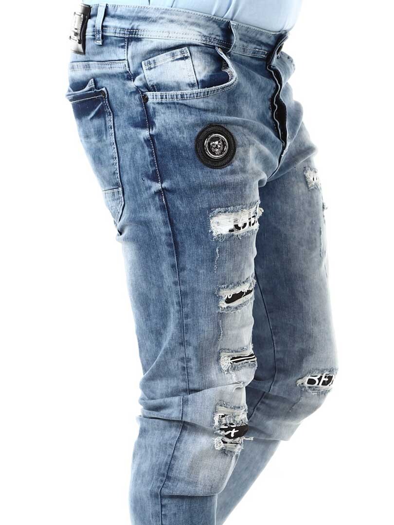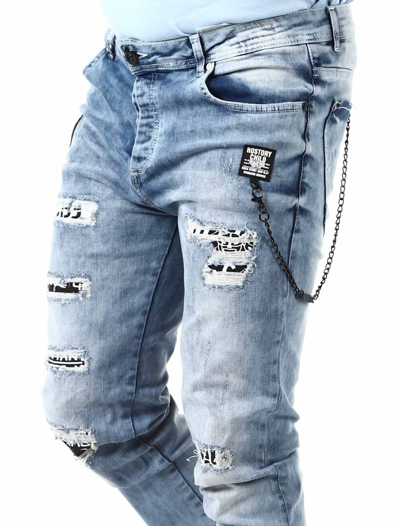 Bukser i myk denim med avtagbar kjede og romslige lommer. Tøft design med slitasje, rifter, kontraststoff og stofflapper.