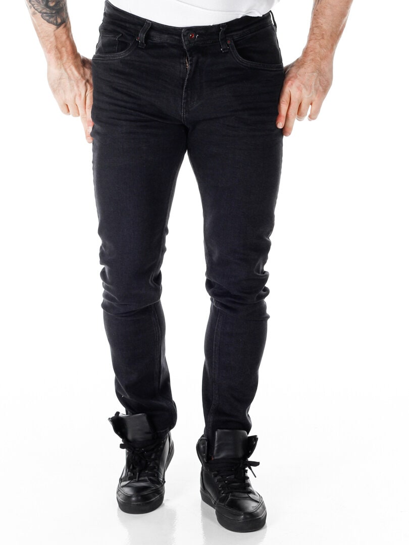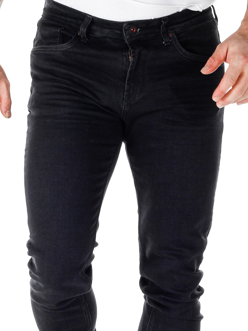 Stretchy bukser i vasket denim. Slim fit-modell med tre frontlommer og to baklommer. Glidelås i gylfen.