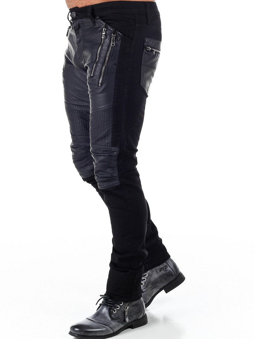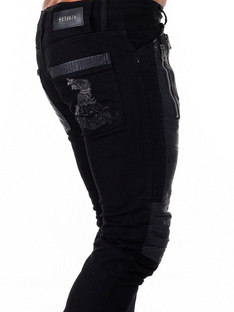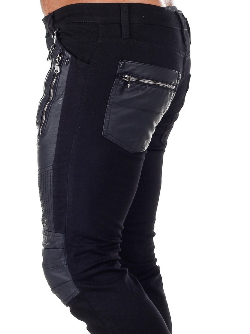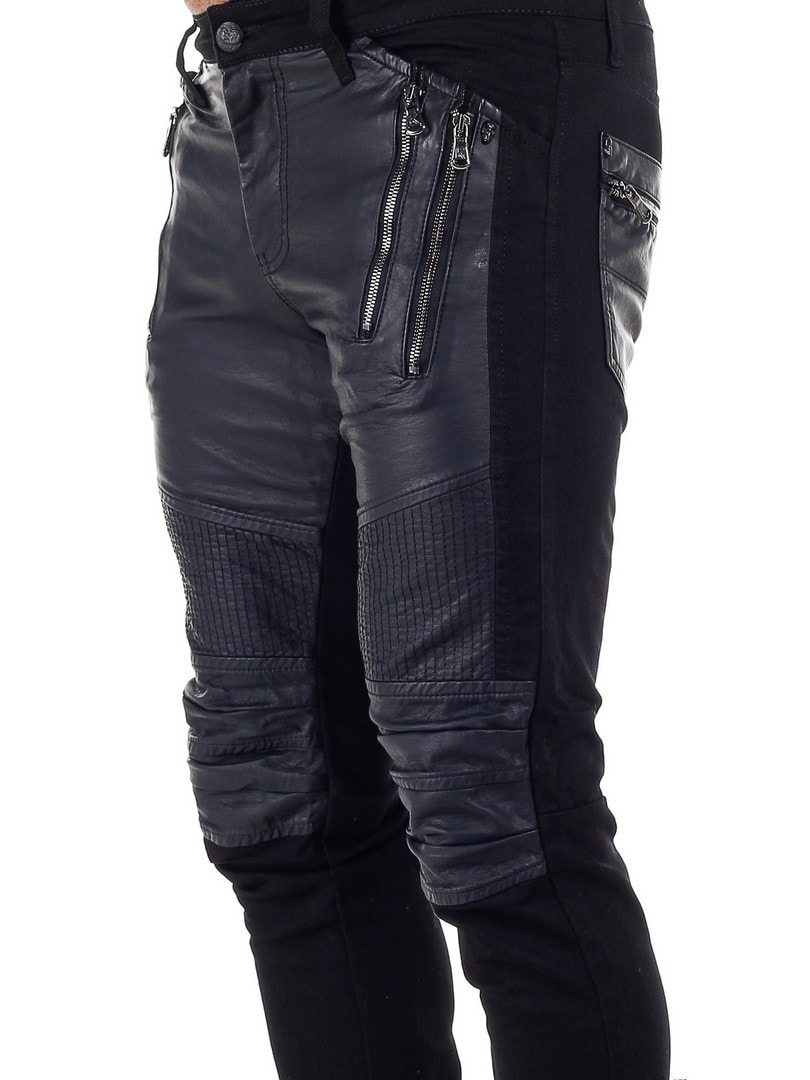 Bukser i svart denim med skinnimitasjon på lårene og baklommene. Slim fit-modell med behagelig stretch, detaljert med sølvfargede glidelåser foran og et skreddersydd mønster på venstre baklomme.