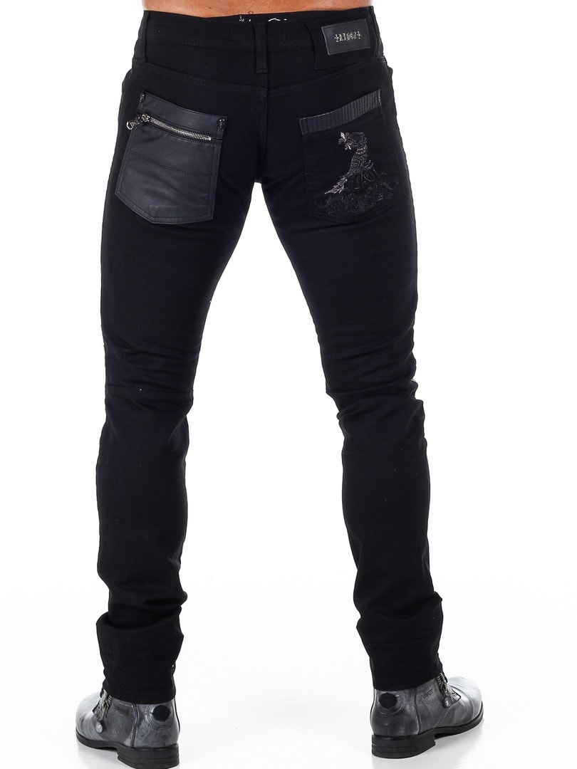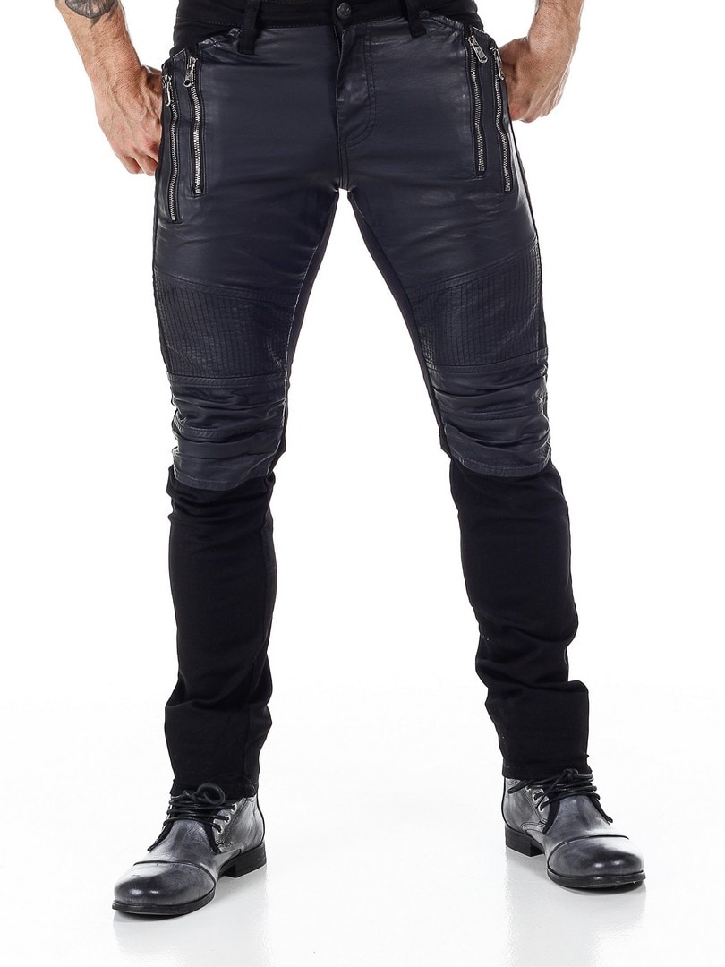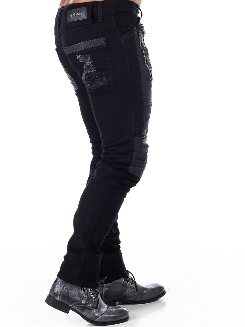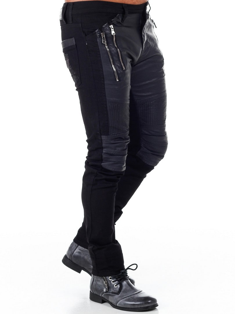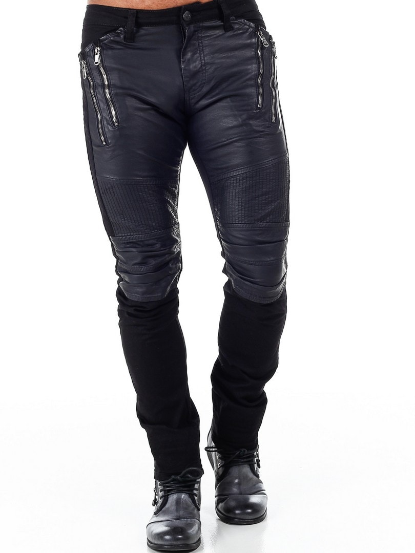 Bukser i svart denim med skinnimitasjon på lårene og baklommene. Slim fit-modell med behagelig stretch, detaljert med sølvfargede glidelåser foran og et skreddersydd mønster på venstre baklomme.