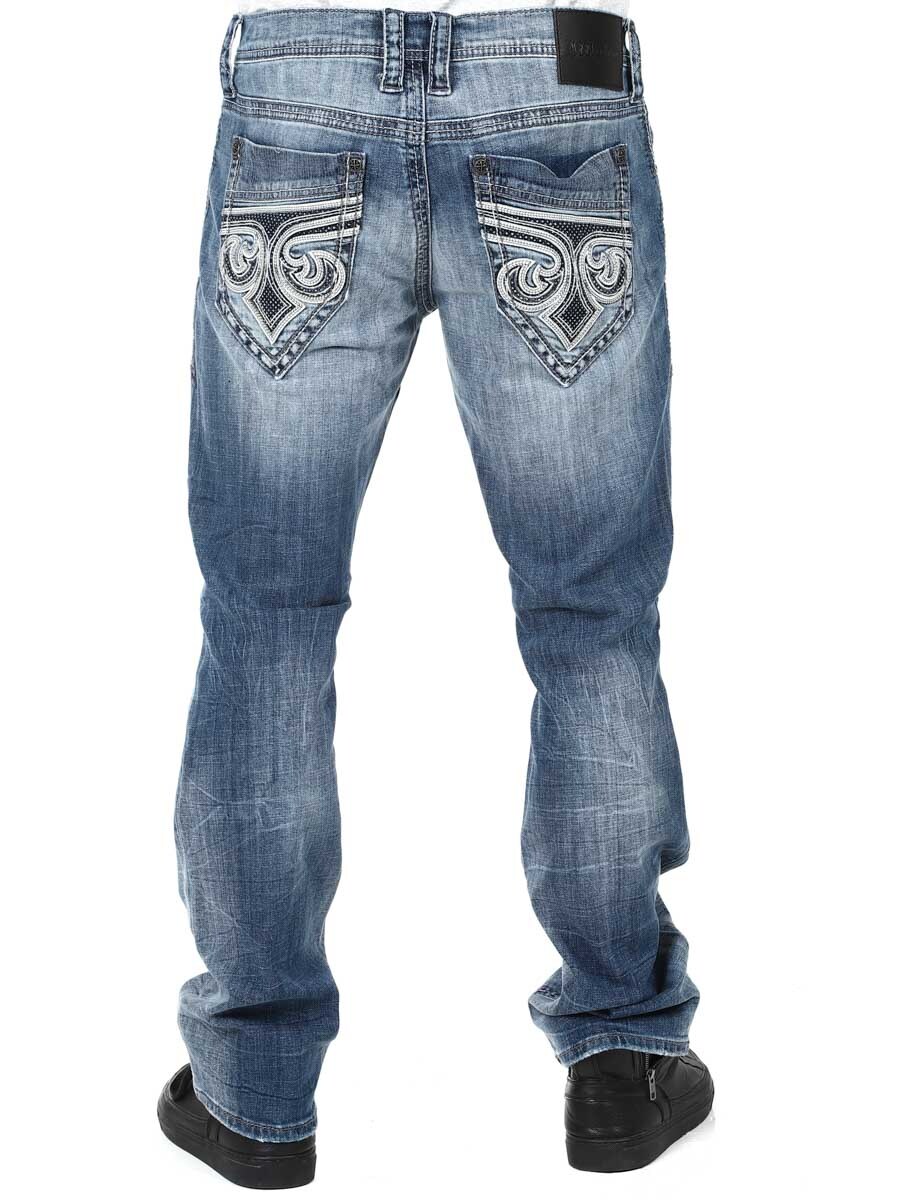 Blå jeans med kraftige slitasjer for et røft og avslappet uttrykk. De har en rett passform og er laget i et mykt, vasket denimstoff som gir både komfort og karakter. Baklommene er pyntet med Afflictions ikoniske broderier, som gir buksene en unik og uttrykksfull stil. Perfekt for deg som vil ha jeans som virkelig skiller seg ut – både til hverdags og til en mer rocka look.
