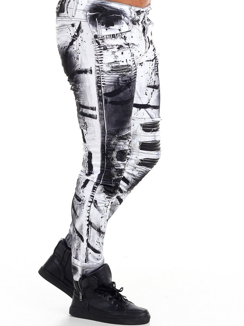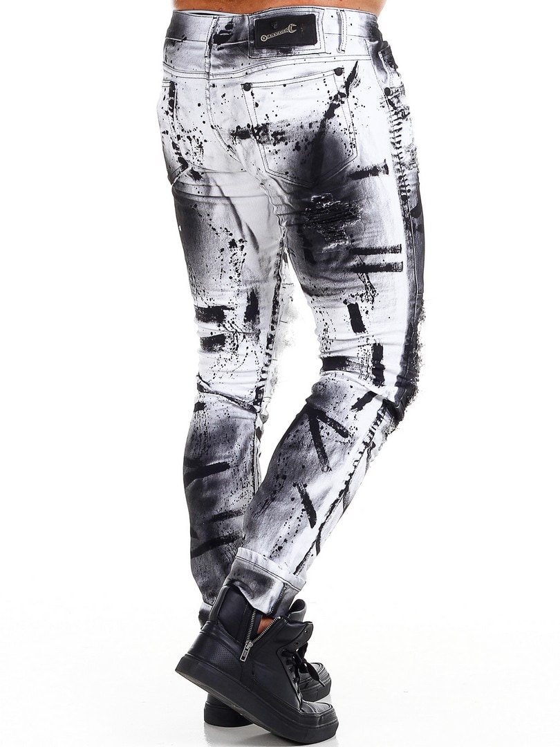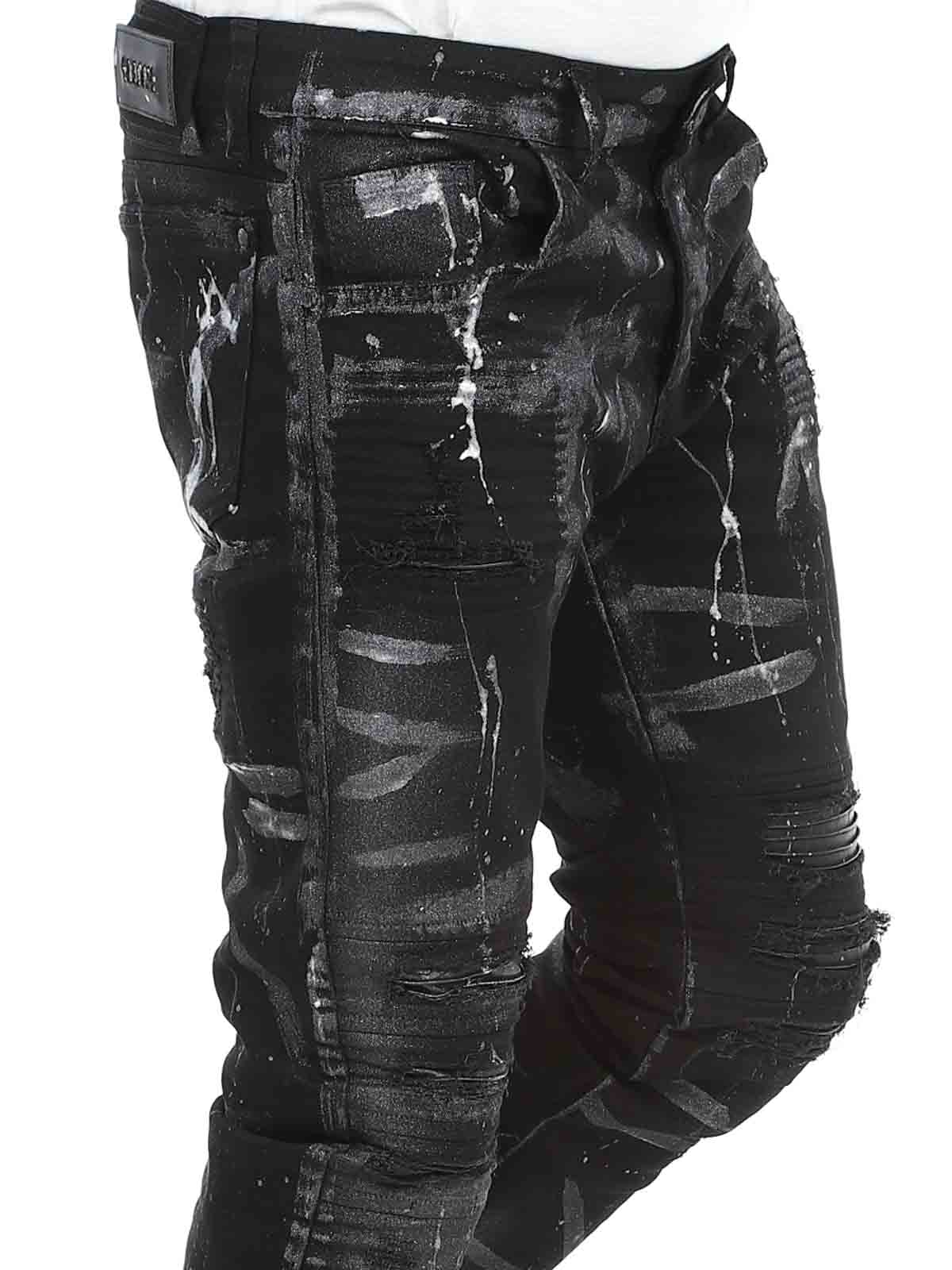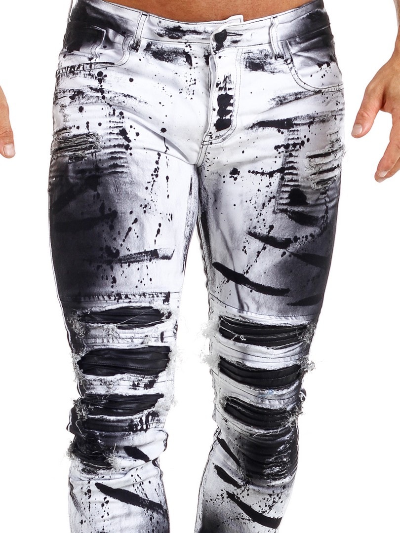 Bukser i smal passform med svarte, malte effekter og skinnimitasjon i en slitt vintage-design med slitasjer. Romslige lommer og patch i linningen bak.