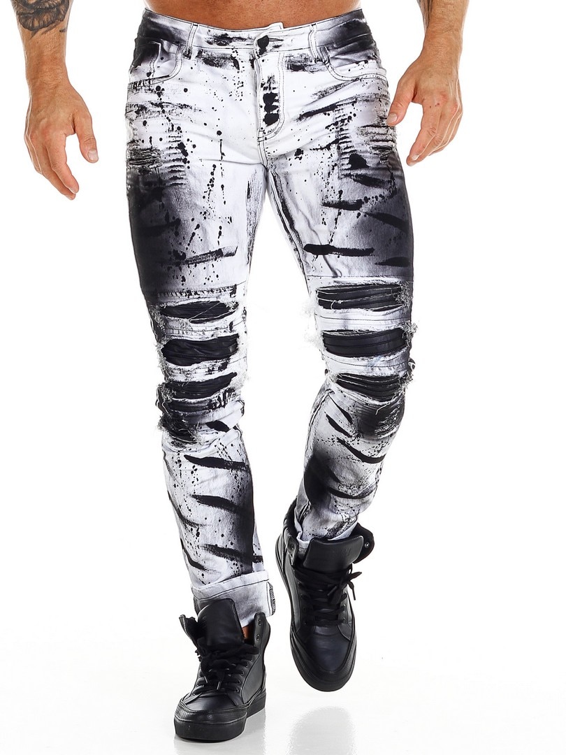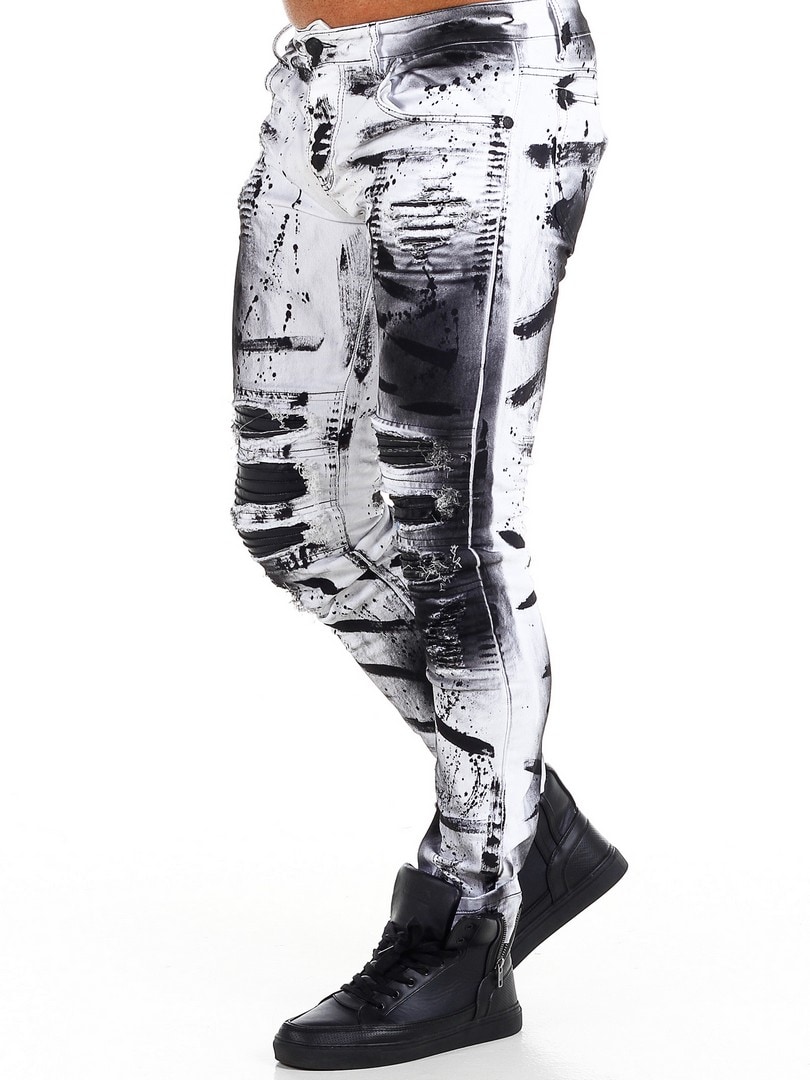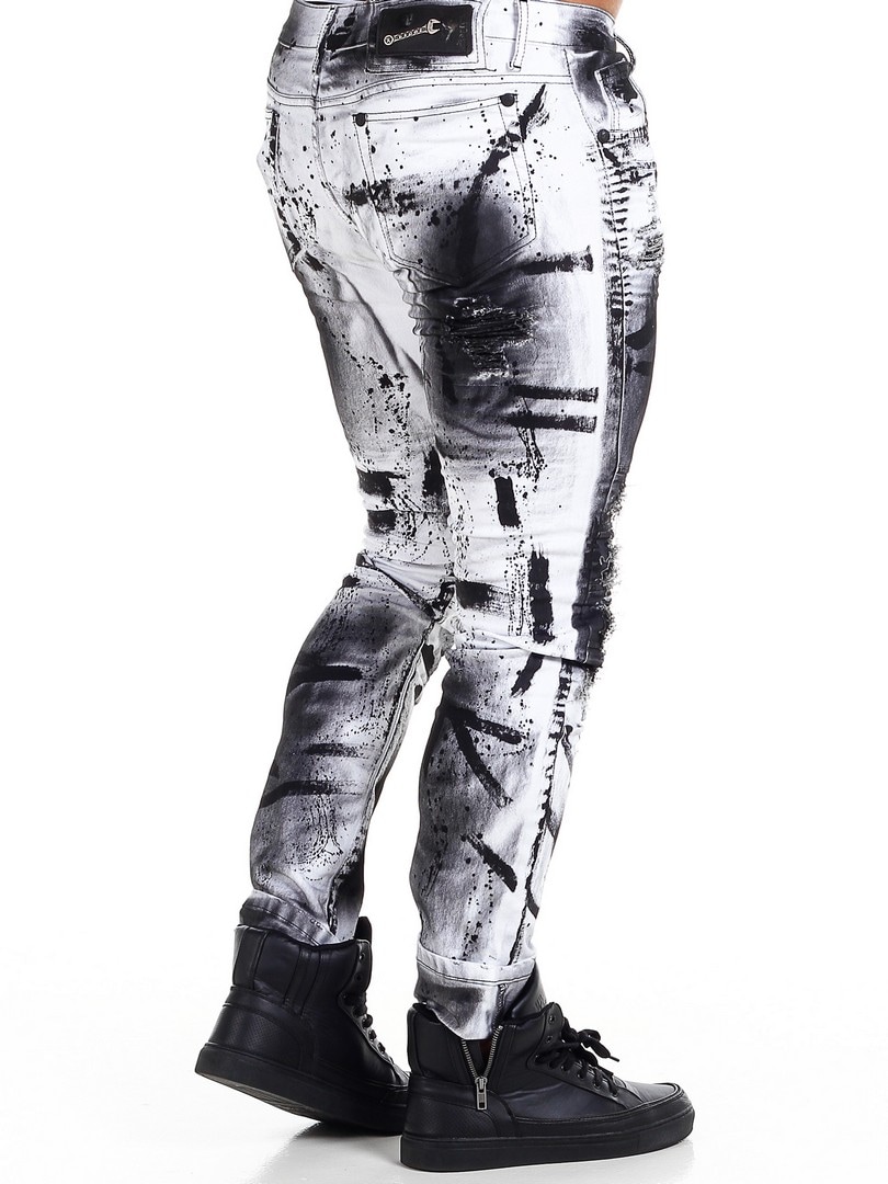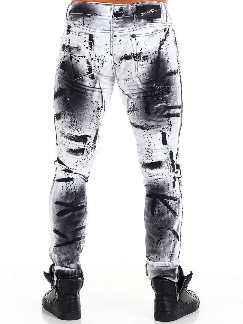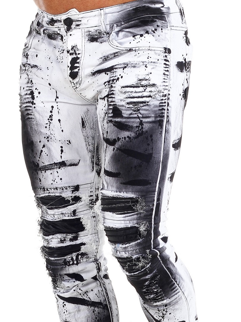 Bukser i smal passform med svarte, malte effekter og skinnimitasjon i en slitt vintage-design med slitasjer. Romslige lommer og patch i linningen bak.