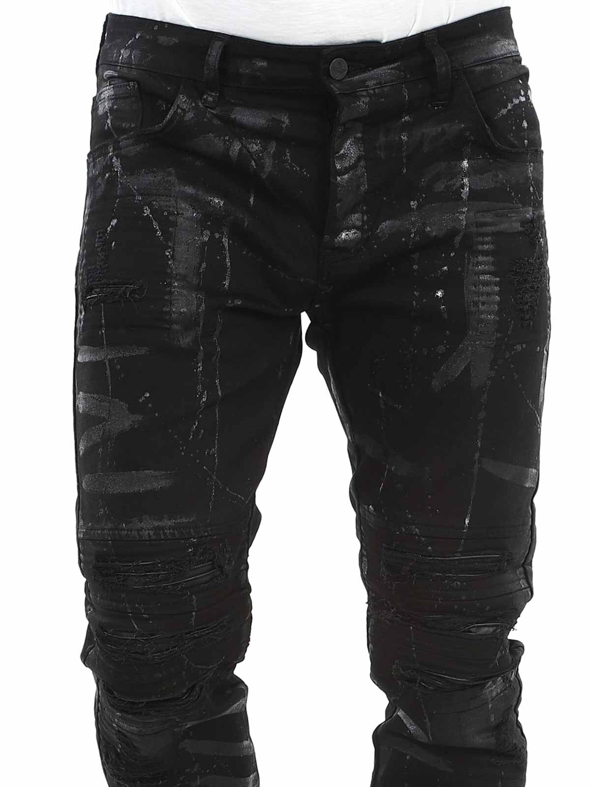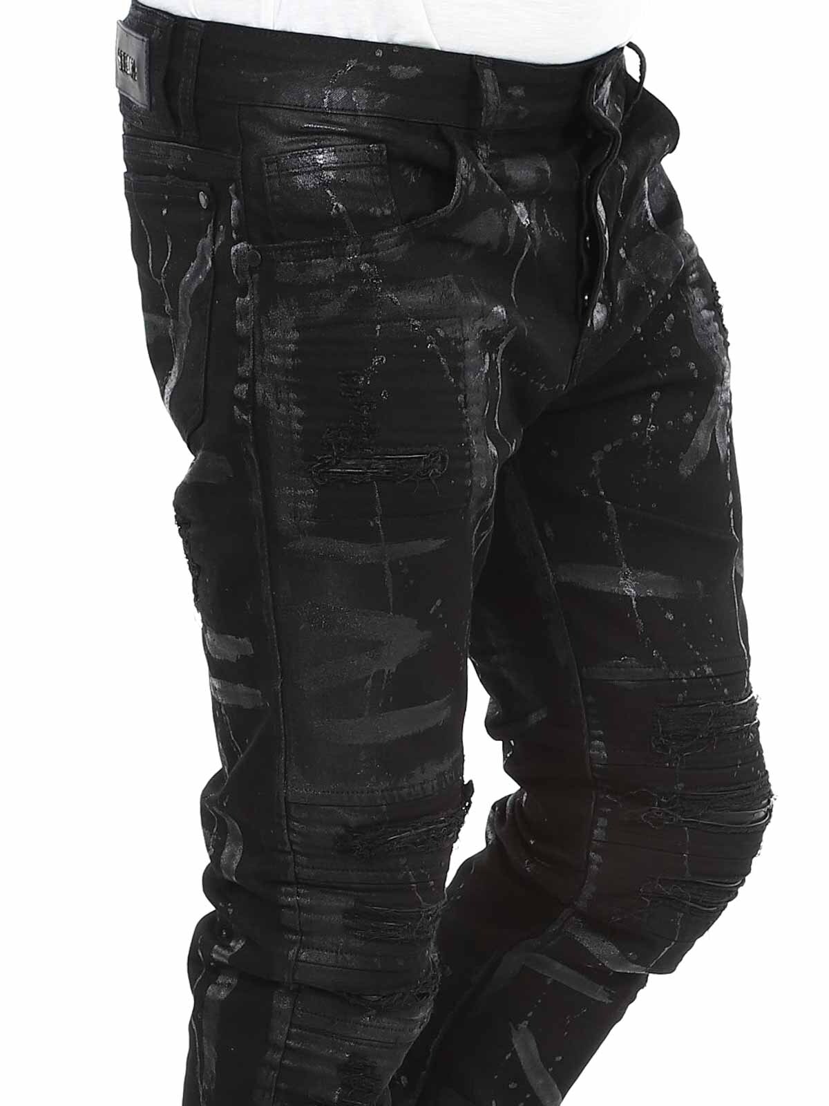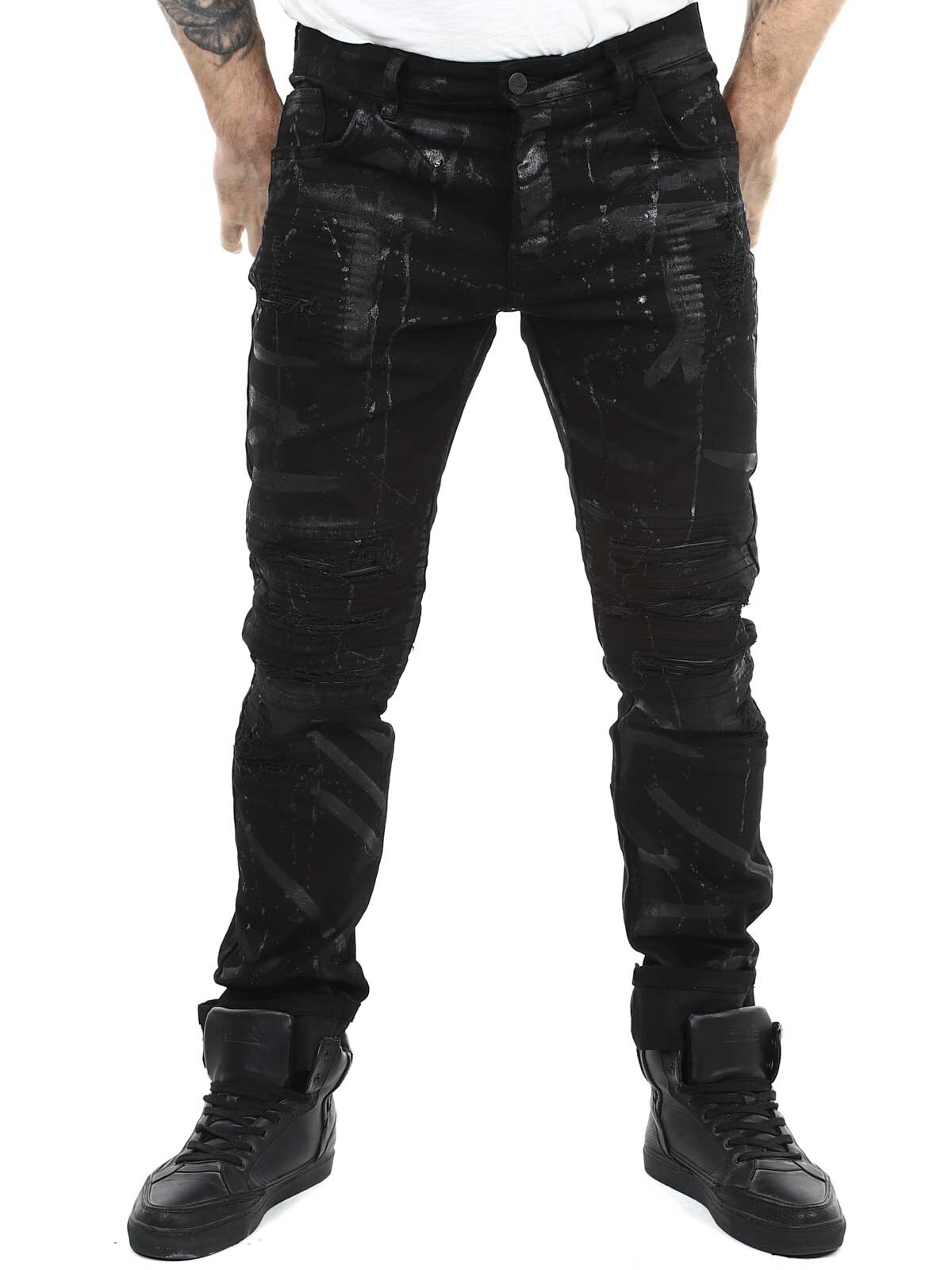 Jeans i behagelig og elastisk denim. Tøff design med rifter i skinnimitasjon og malte effekter. Femlommemodell med beltehemper og lapp bak i linningen. Jeans skapt for å gi antrekket ditt en dristig og unik kant!