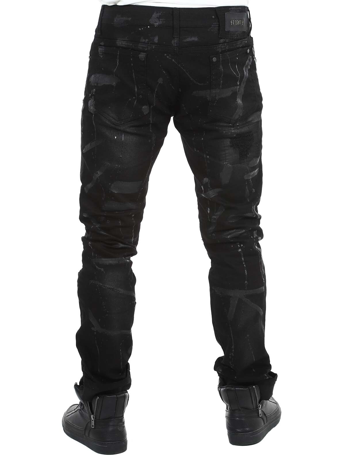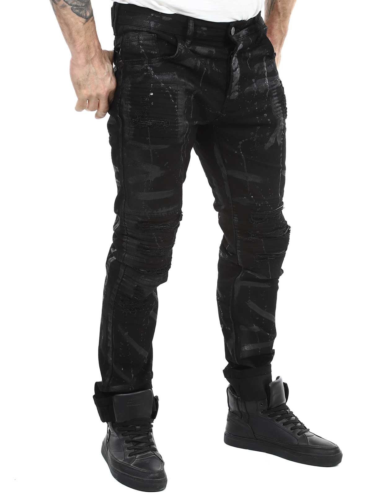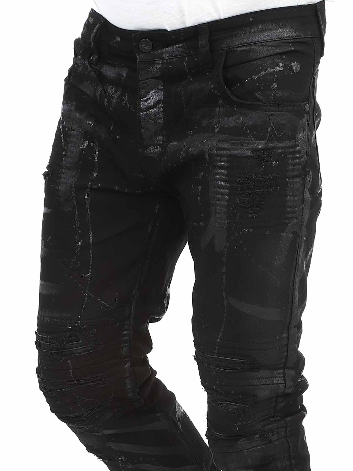 Jeans i behagelig og elastisk denim. Tøff design med rifter i skinnimitasjon og malte effekter. Femlommemodell med beltehemper og lapp bak i linningen. Jeans skapt for å gi antrekket ditt en dristig og unik kant!