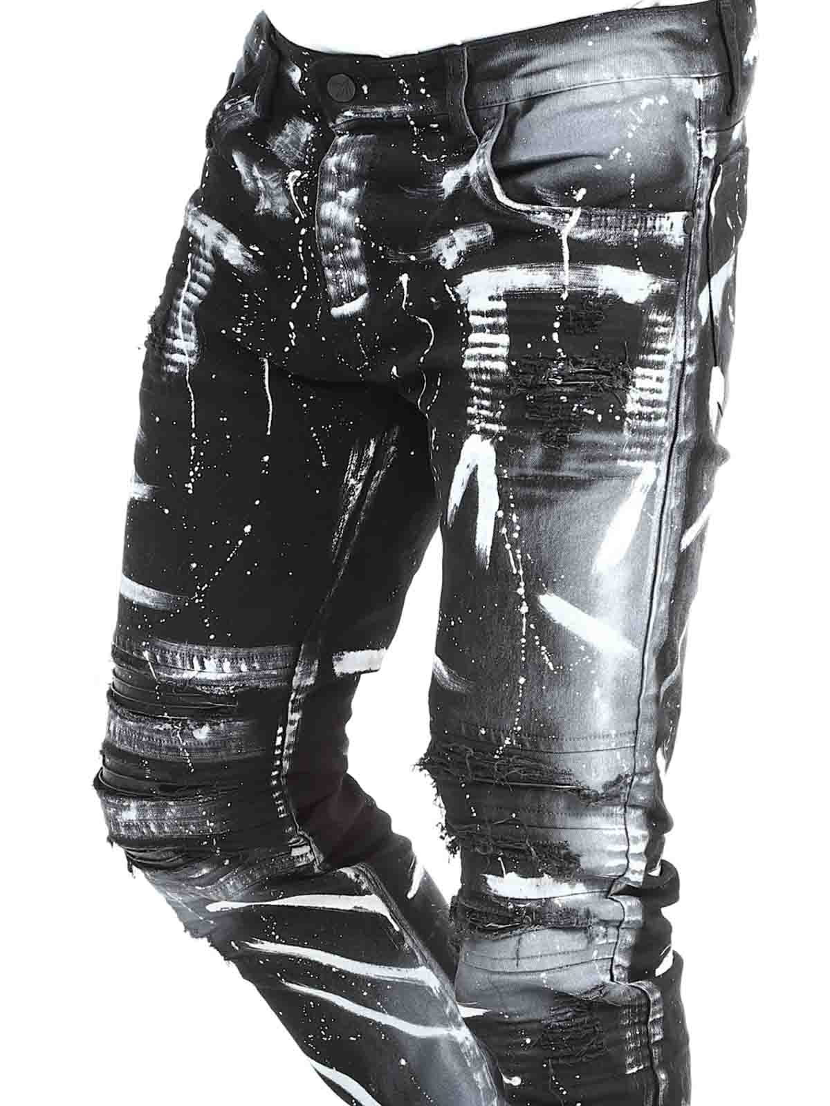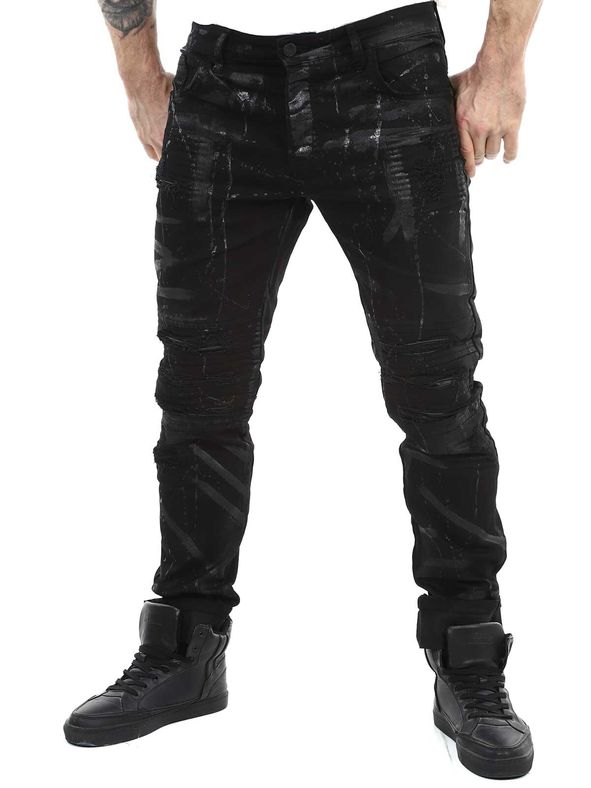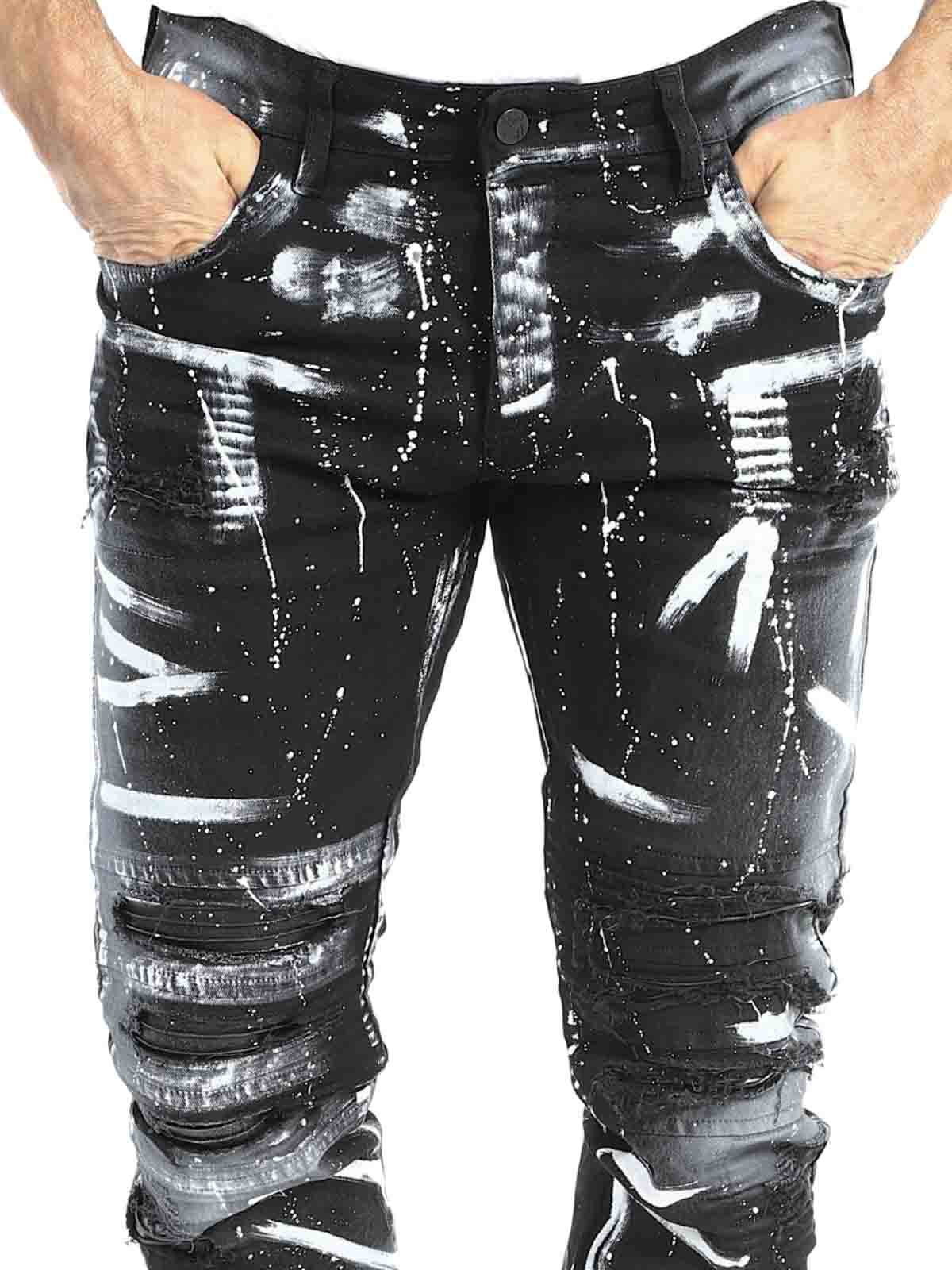 Jeans i behagelig og elastisk denim. Tøff design med rifter i skinnimitasjon og malte effekter. Femlommemodell med beltehemper og lapp bak i linningen. Jeans skapt for å gi antrekket ditt en dristig og unik kant!