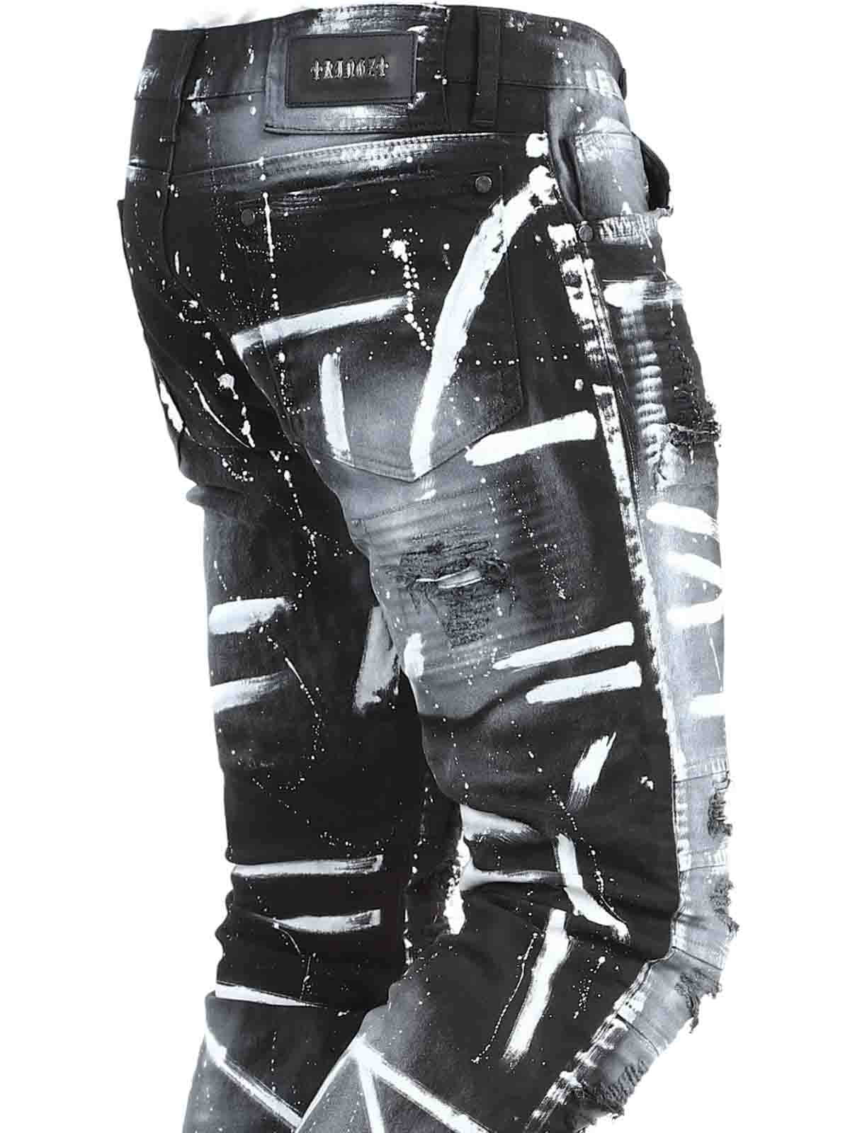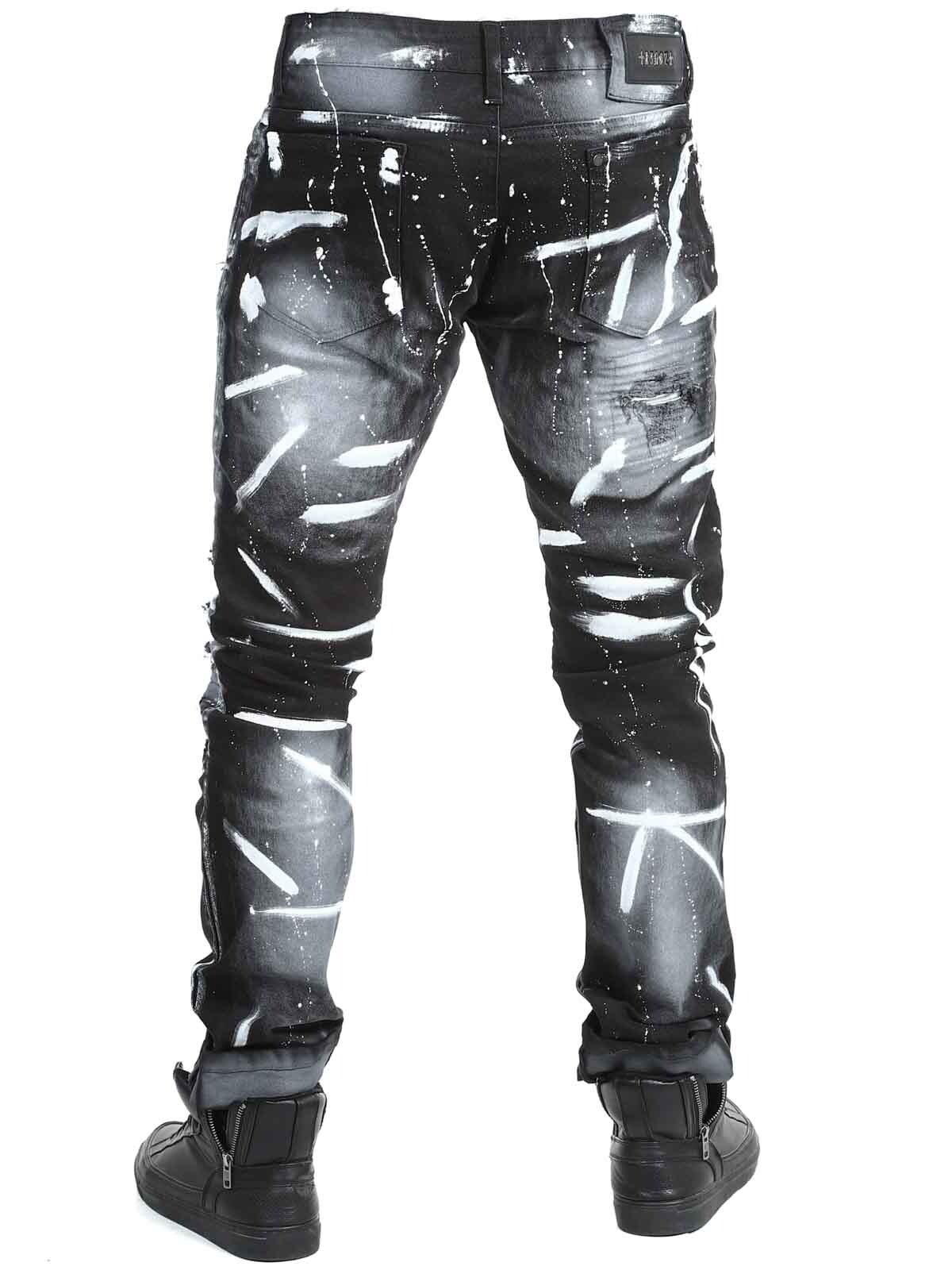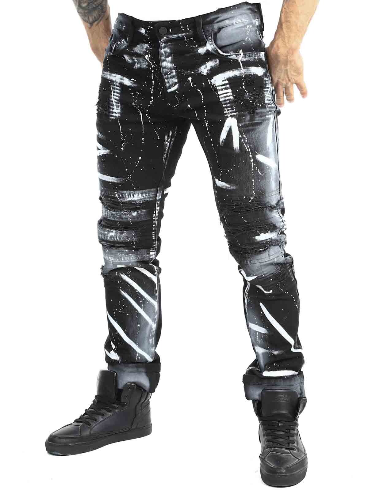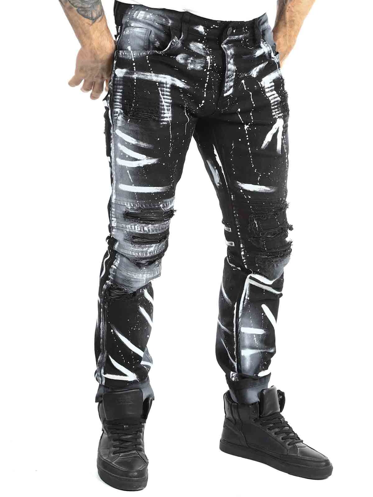 Jeans i behagelig og elastisk denim. Tøff design med rifter i skinnimitasjon og malte effekter. Femlommemodell med beltehemper og lapp bak i linningen. Jeans skapt for å gi antrekket ditt en dristig og unik kant!