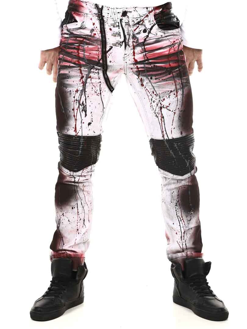 Unik bukse i farget denim med knær og lommer i svart imitert skinn. Slim passform med sølvnagler som markerer gylfen og baklommer som lukkes med sølvglidelåser. Jeansene lukkes med en separat glidelås til høyre for knappen i midjen.