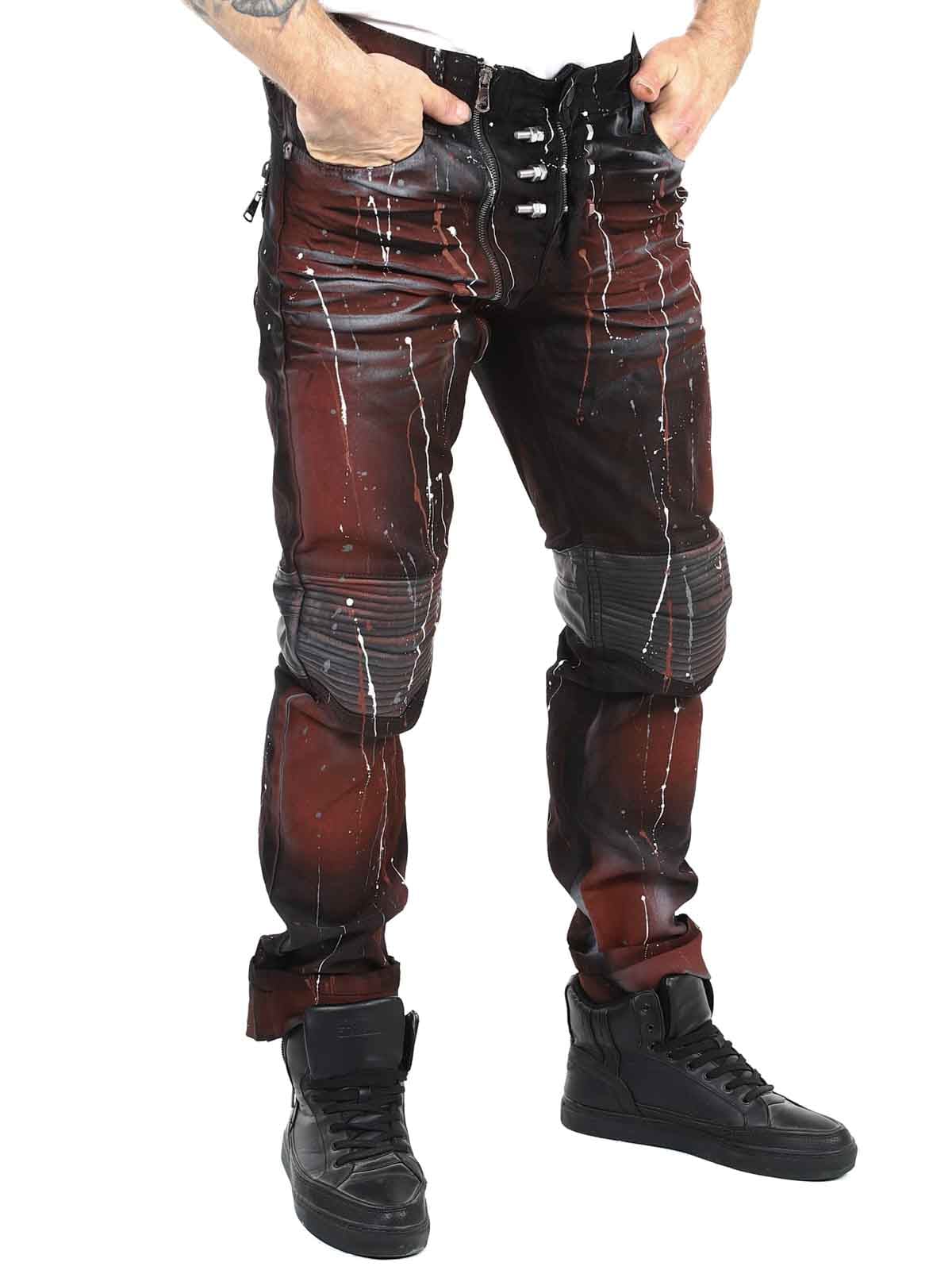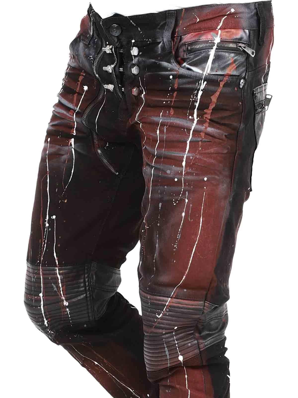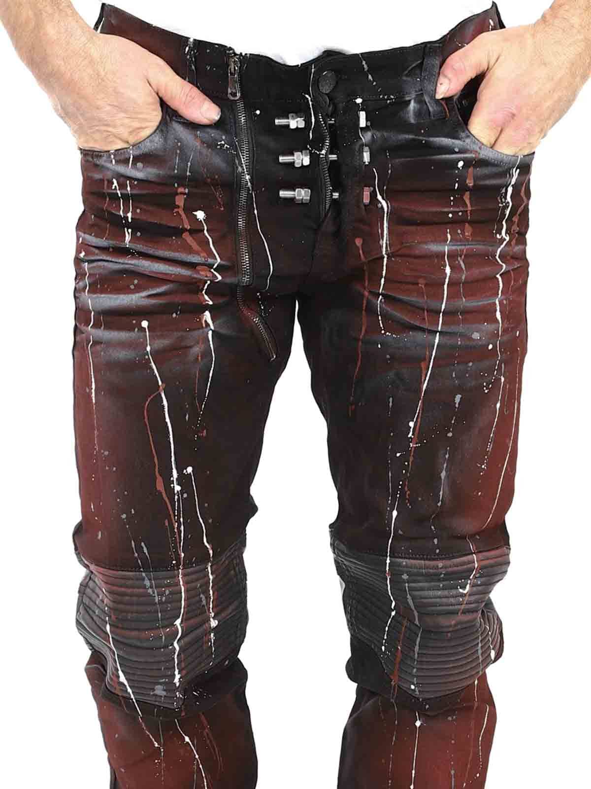 Unik bukse i farget denim med knær og lommer i svart imitert skinn. Slim passform med sølvnagler som markerer gylfen og baklommer som lukkes med sølvglidelåser. Jeansene lukkes med en separat glidelås til høyre for knappen i midjen.