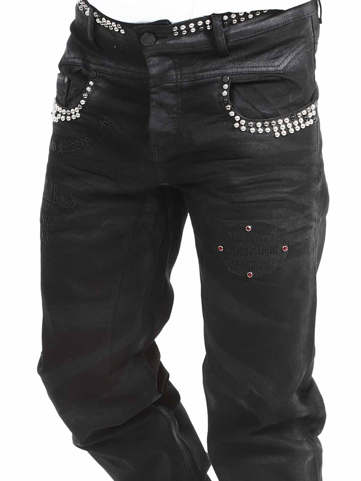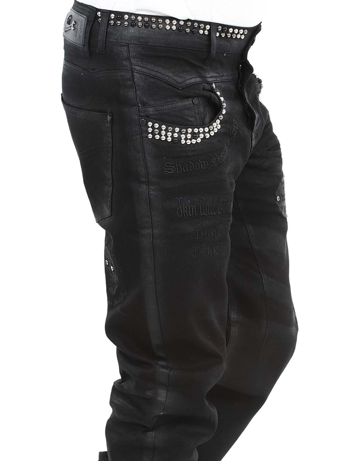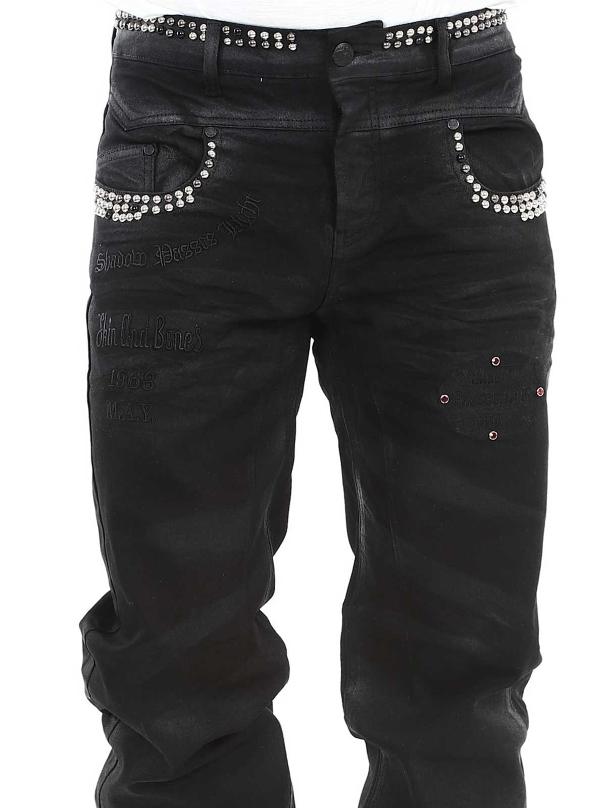 Jeans i stretchmateriale med iøynefallende design. De har beltehemper, tre lommer foran og tre baklommer. Tøffe detaljer med nagler og skreddersydd trykk. Hvis du vil være unik og skille deg ut, er disse jeansene helt riktige for deg!