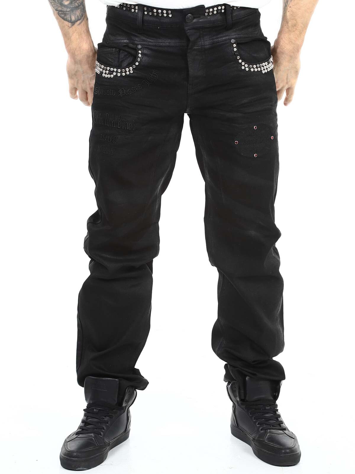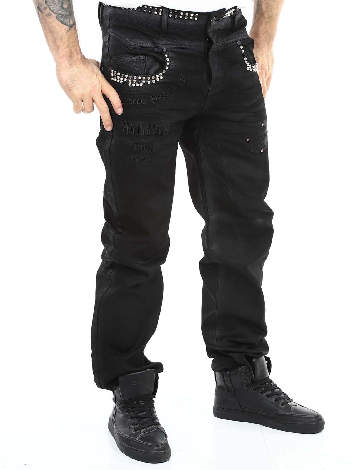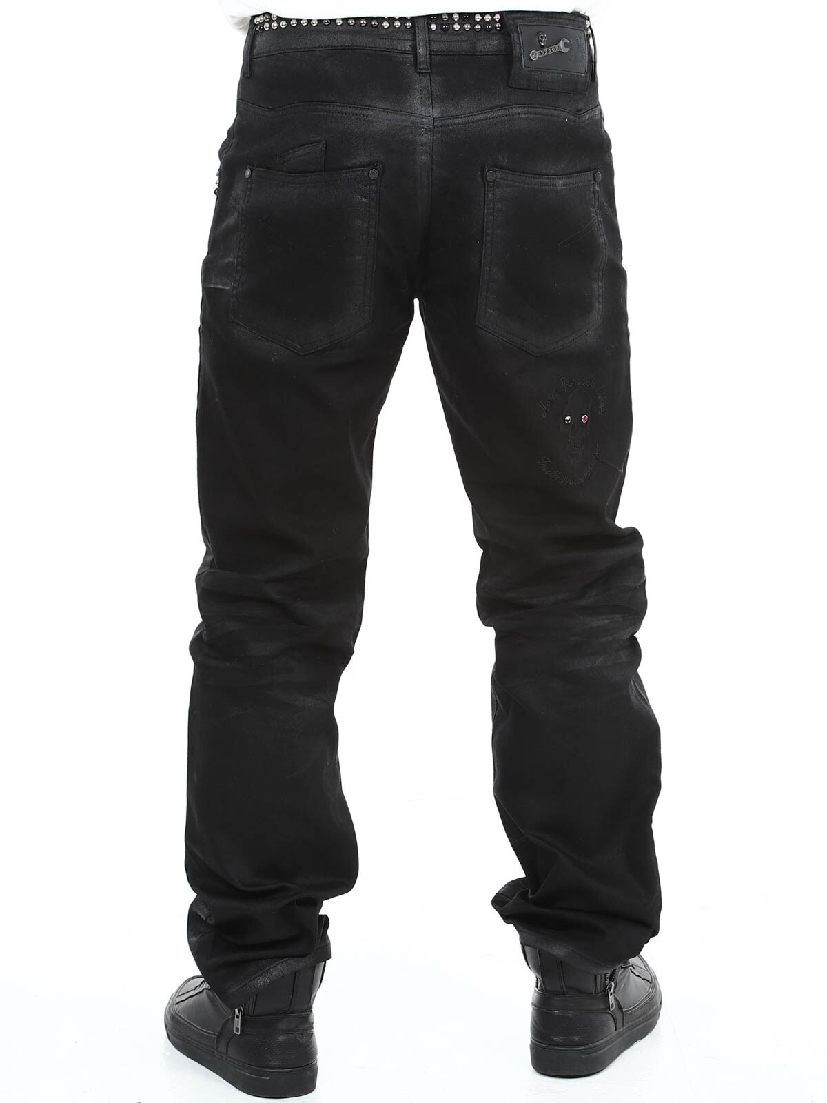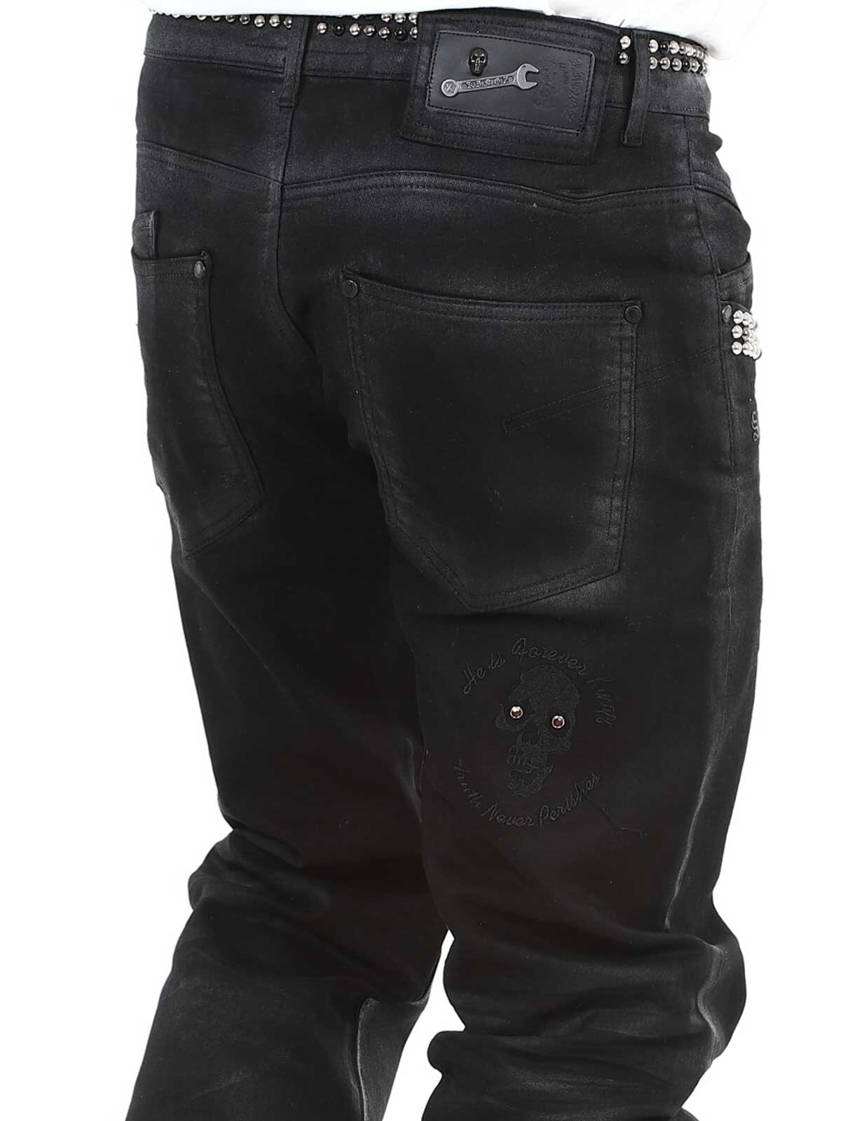 Jeans i stretchmateriale med iøynefallende design. De har beltehemper, tre lommer foran og tre baklommer. Tøffe detaljer med nagler og skreddersydd trykk. Hvis du vil være unik og skille deg ut, er disse jeansene helt riktige for deg!